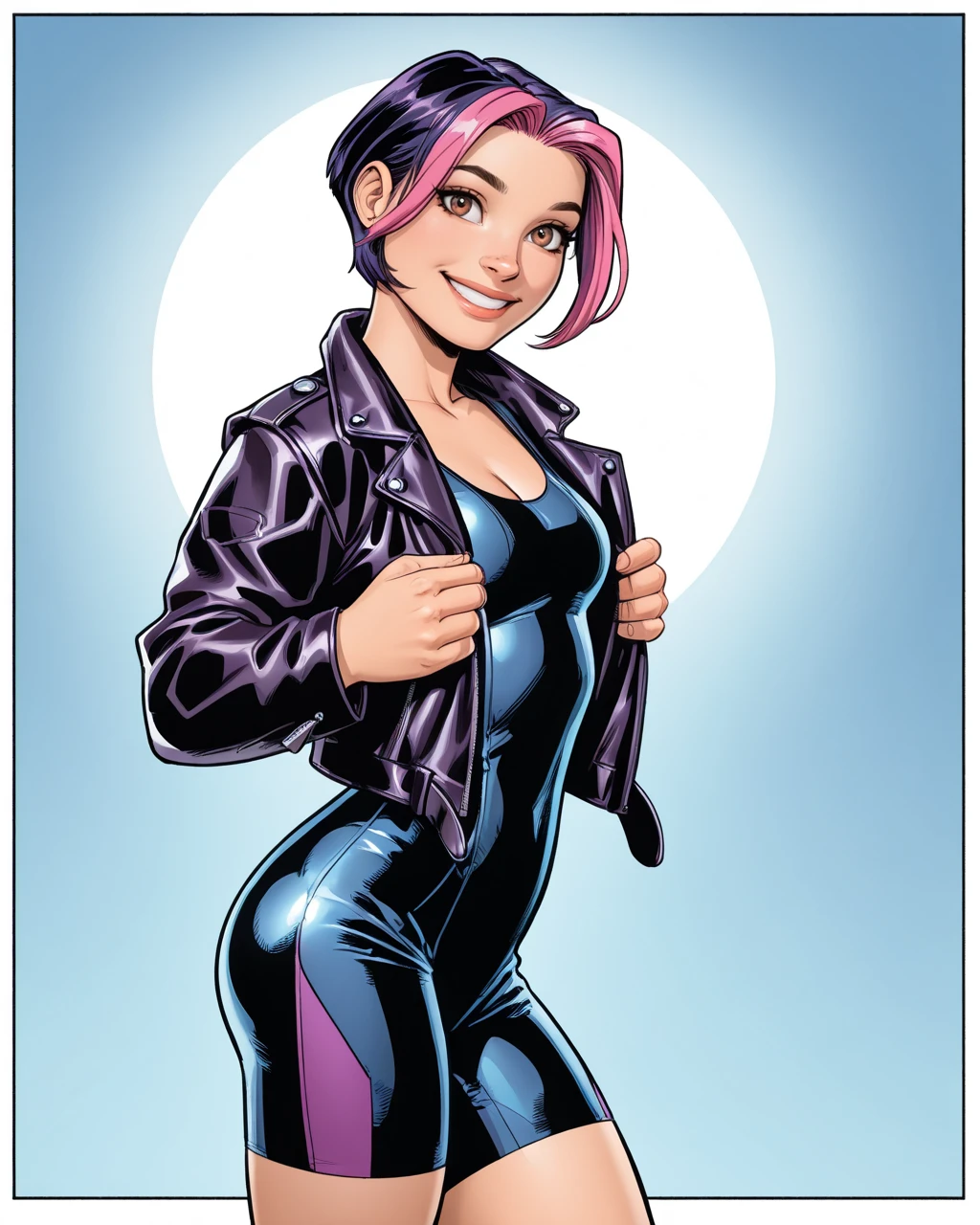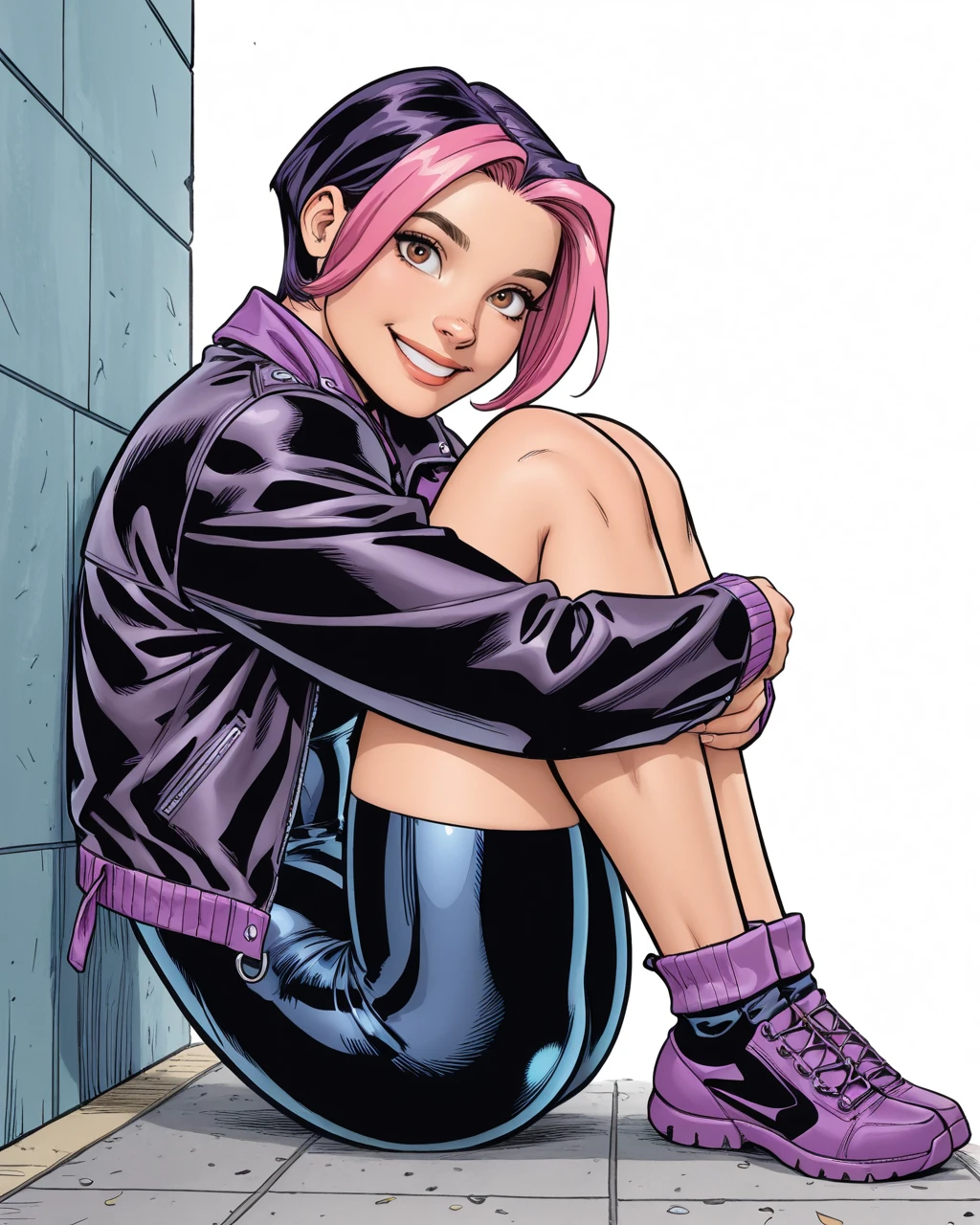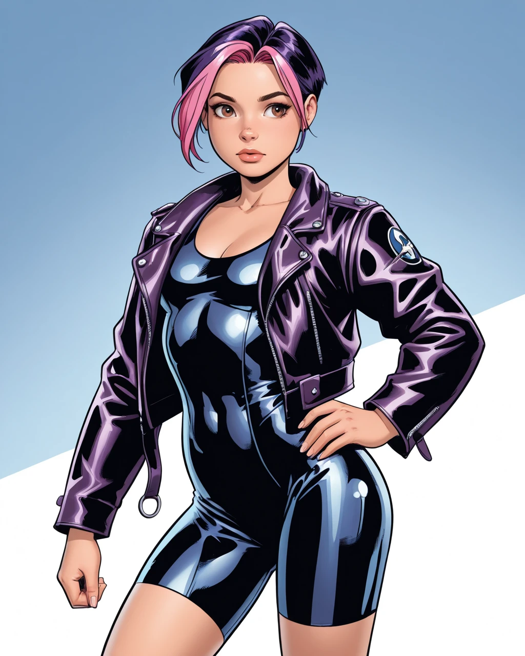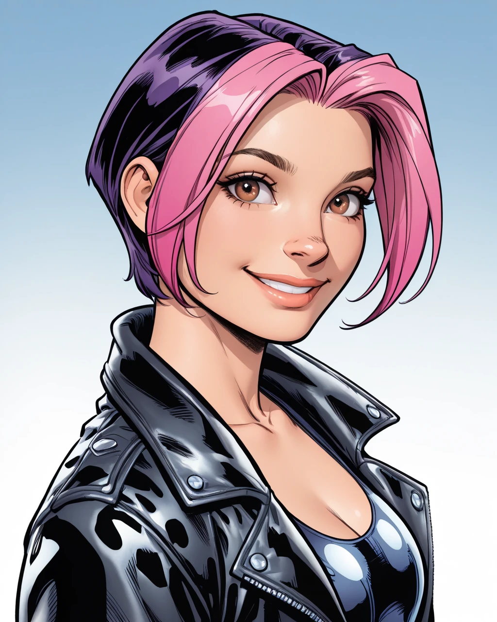 Triggers: roxyfreefall, short hair, purple hair, two-tone hair, pink hair, brown eyes, jacket, ????????,