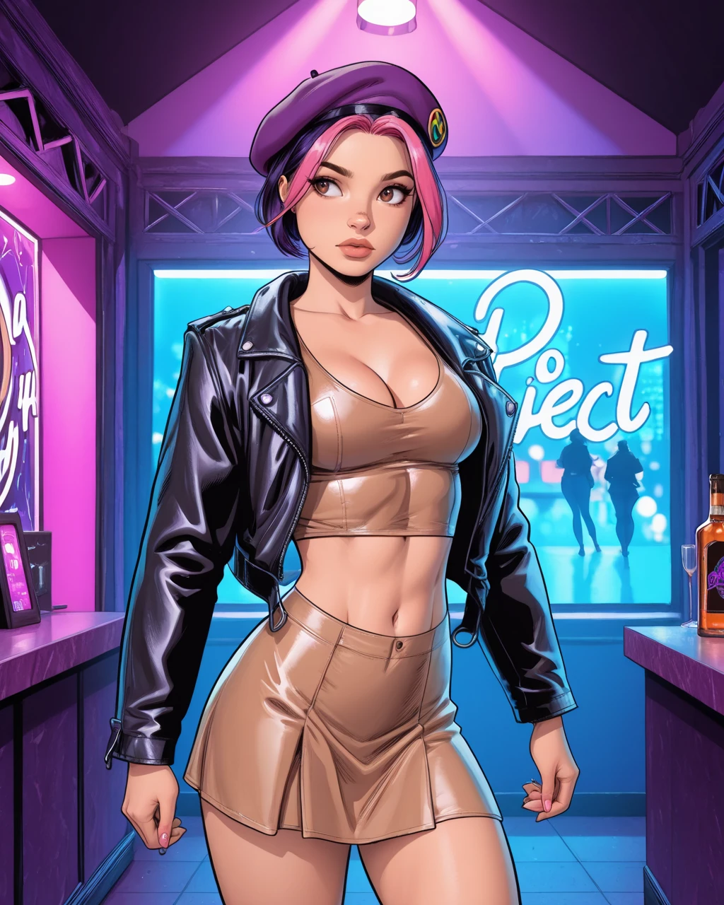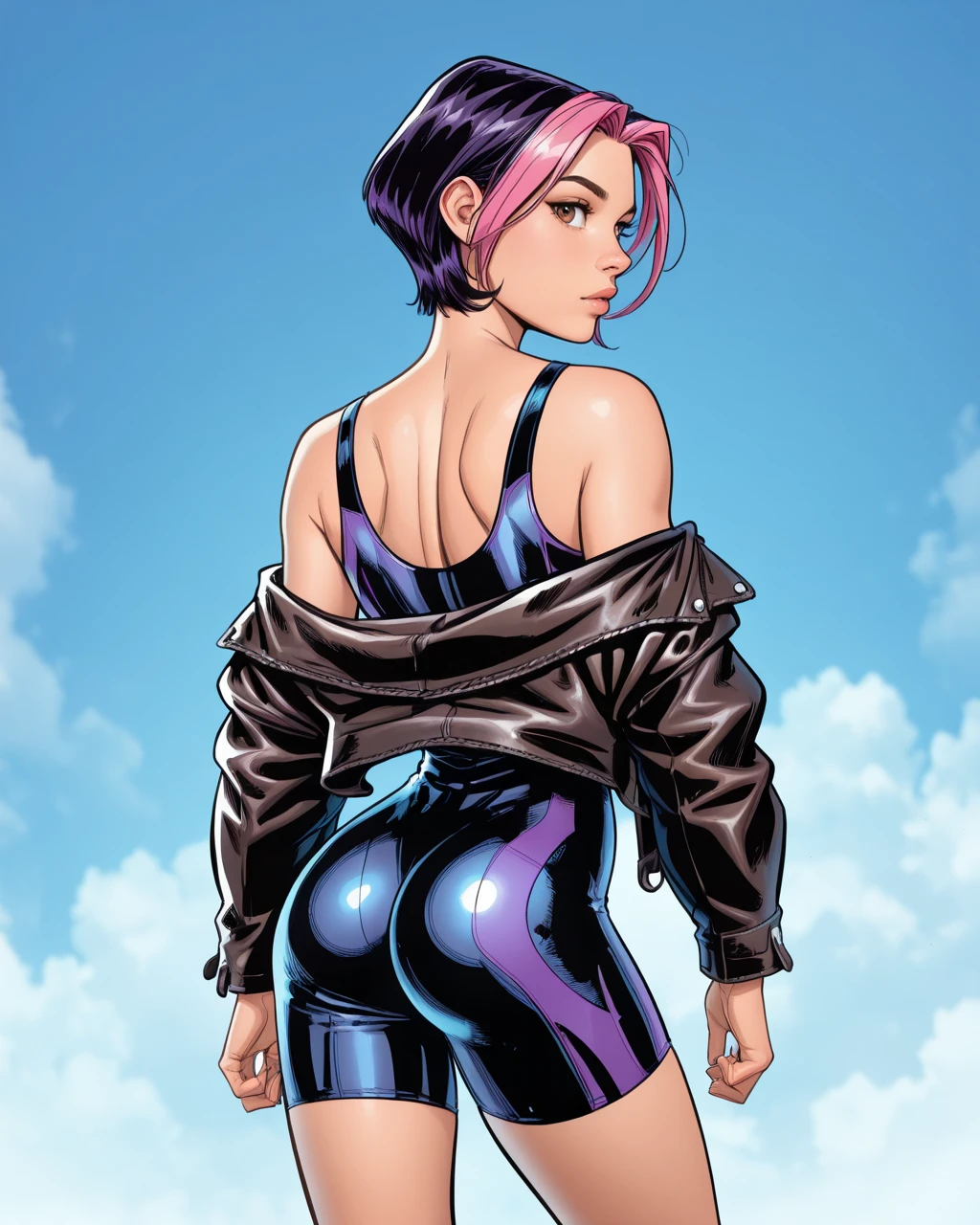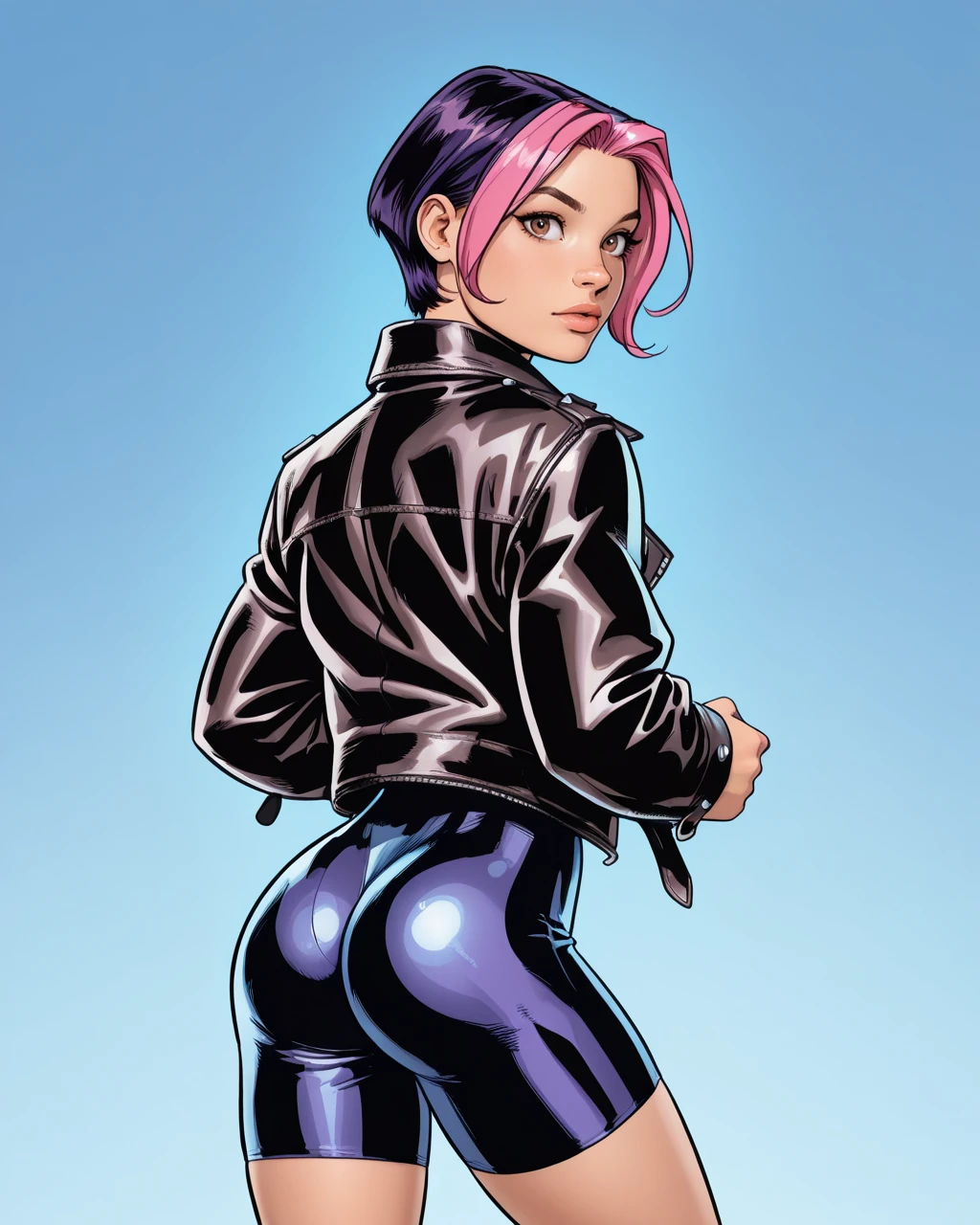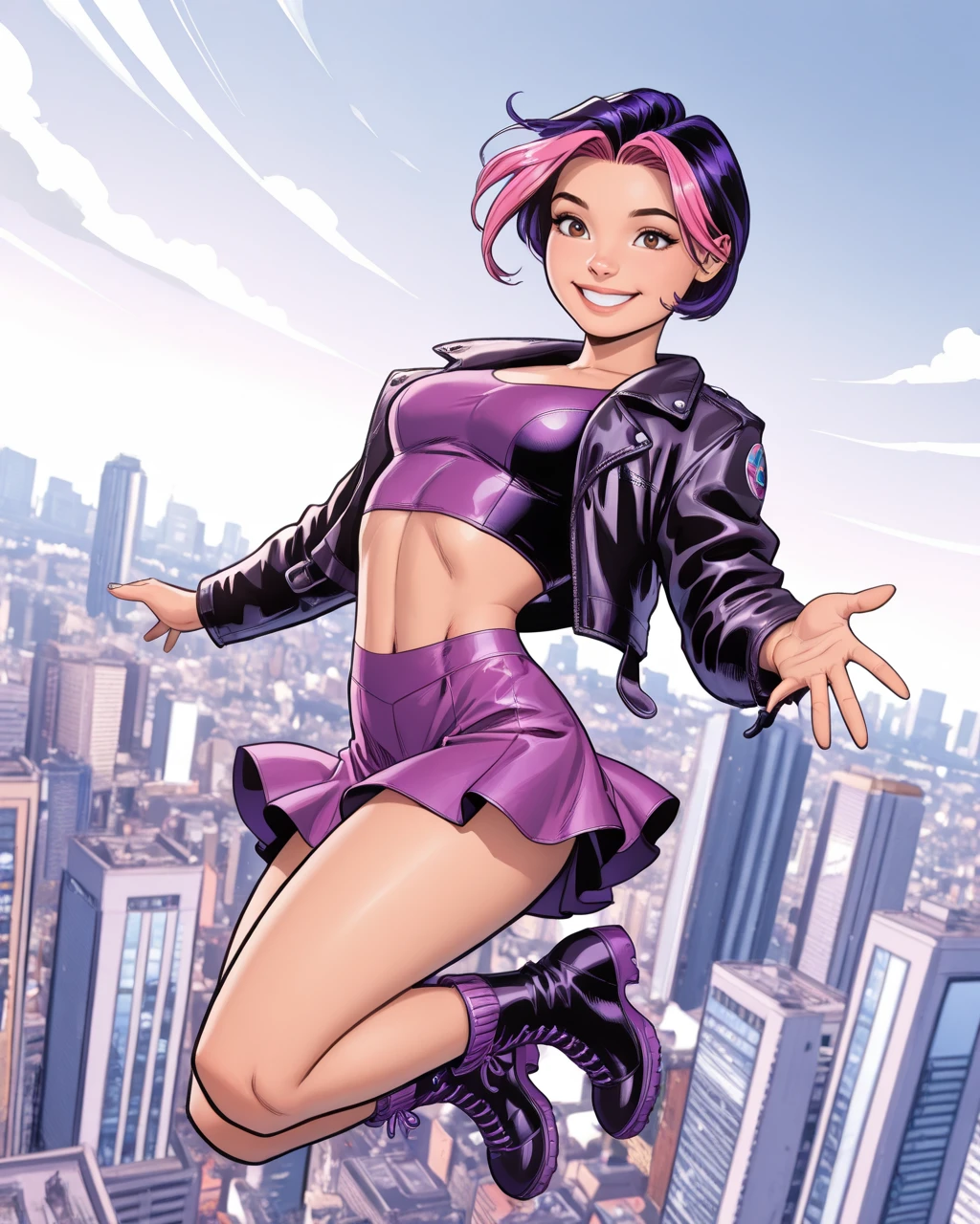 Triggers: roxyfreefall, short hair, purple hair, two-tone hair, pink hair, brown eyes, jacket, ????????,