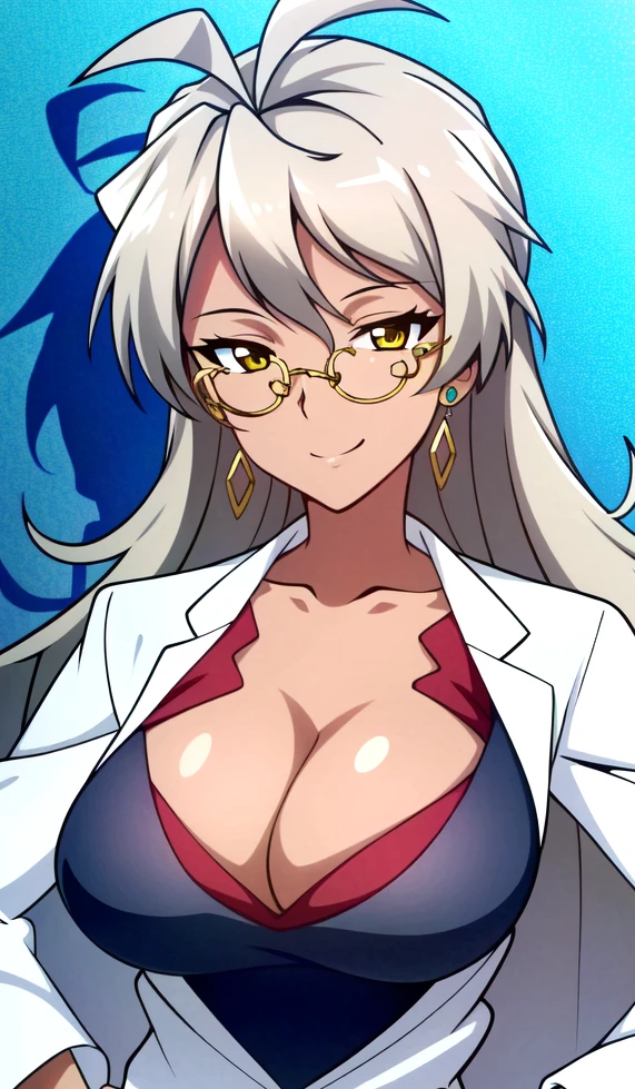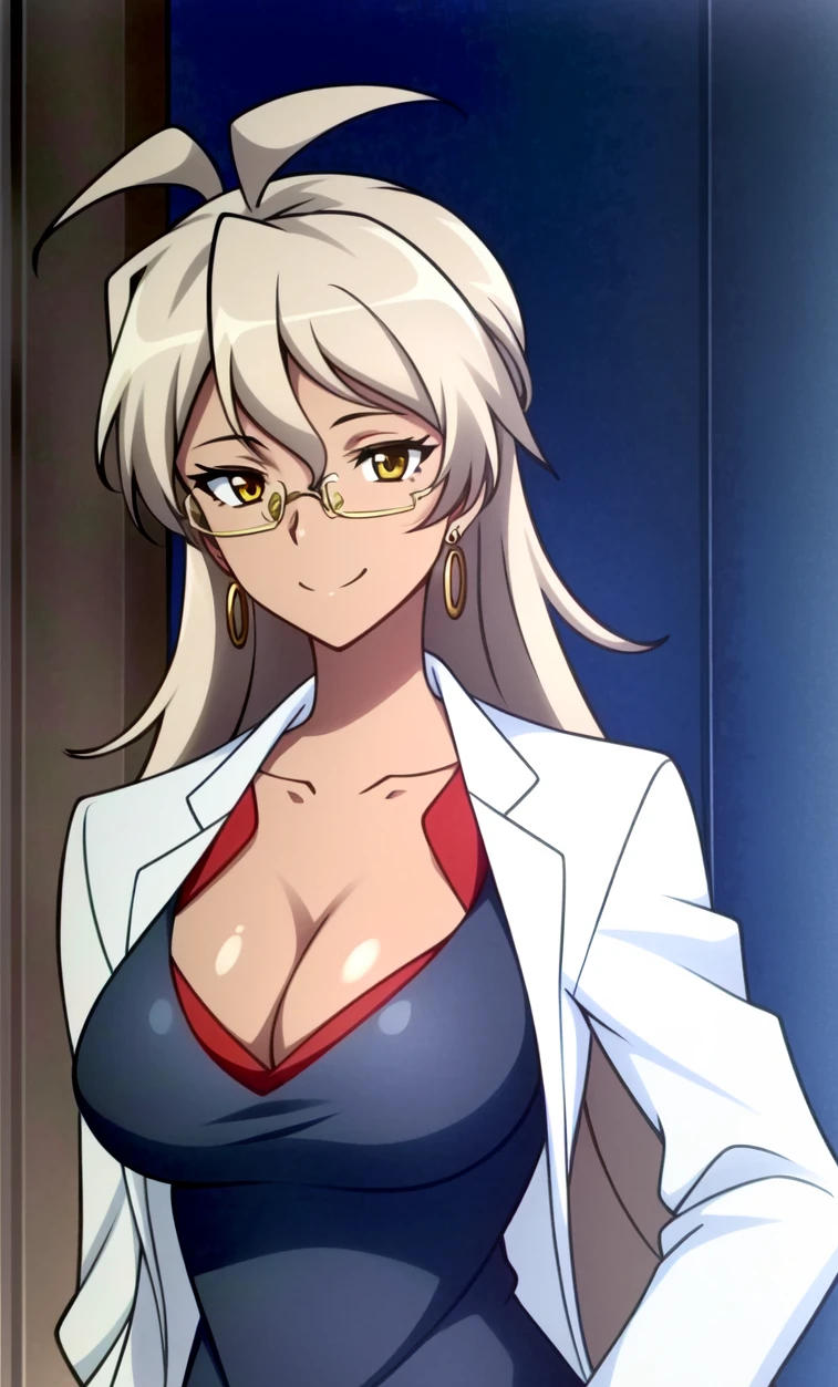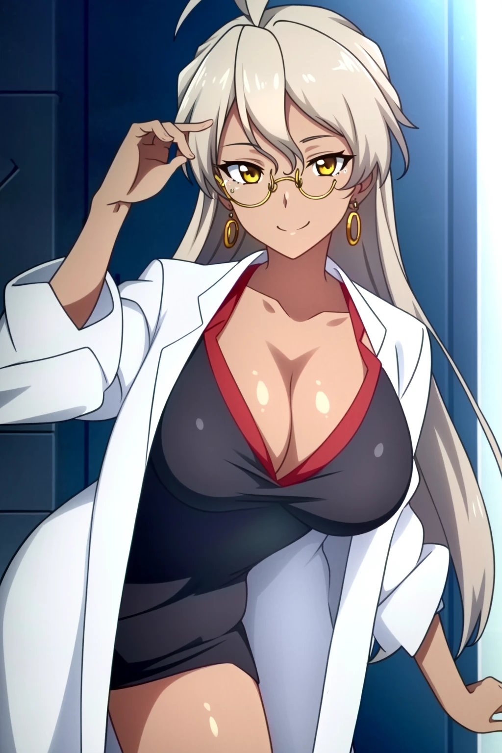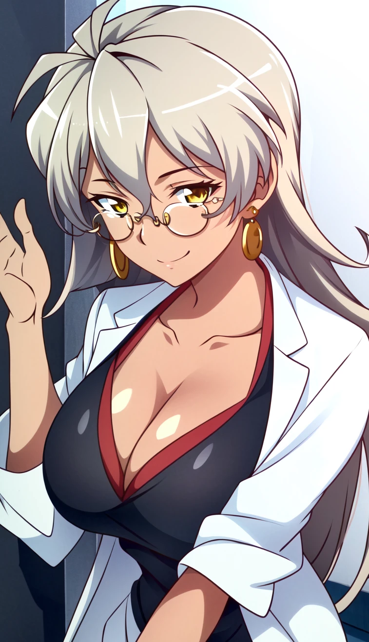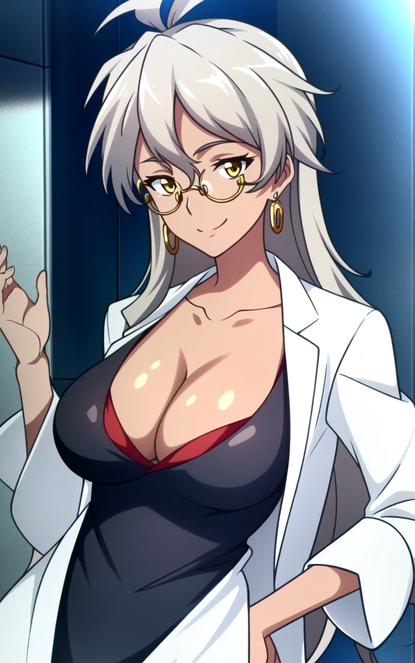 Delilah Uzal, 1girl, solo, thighhighs, glasses, breasts, jewelry, cleavage, earrings, long hair, dark skin, labcoat, dark-skinned female, large breasts, zettai ryouiki, green eyes, dress, grey hair, skirt, smile