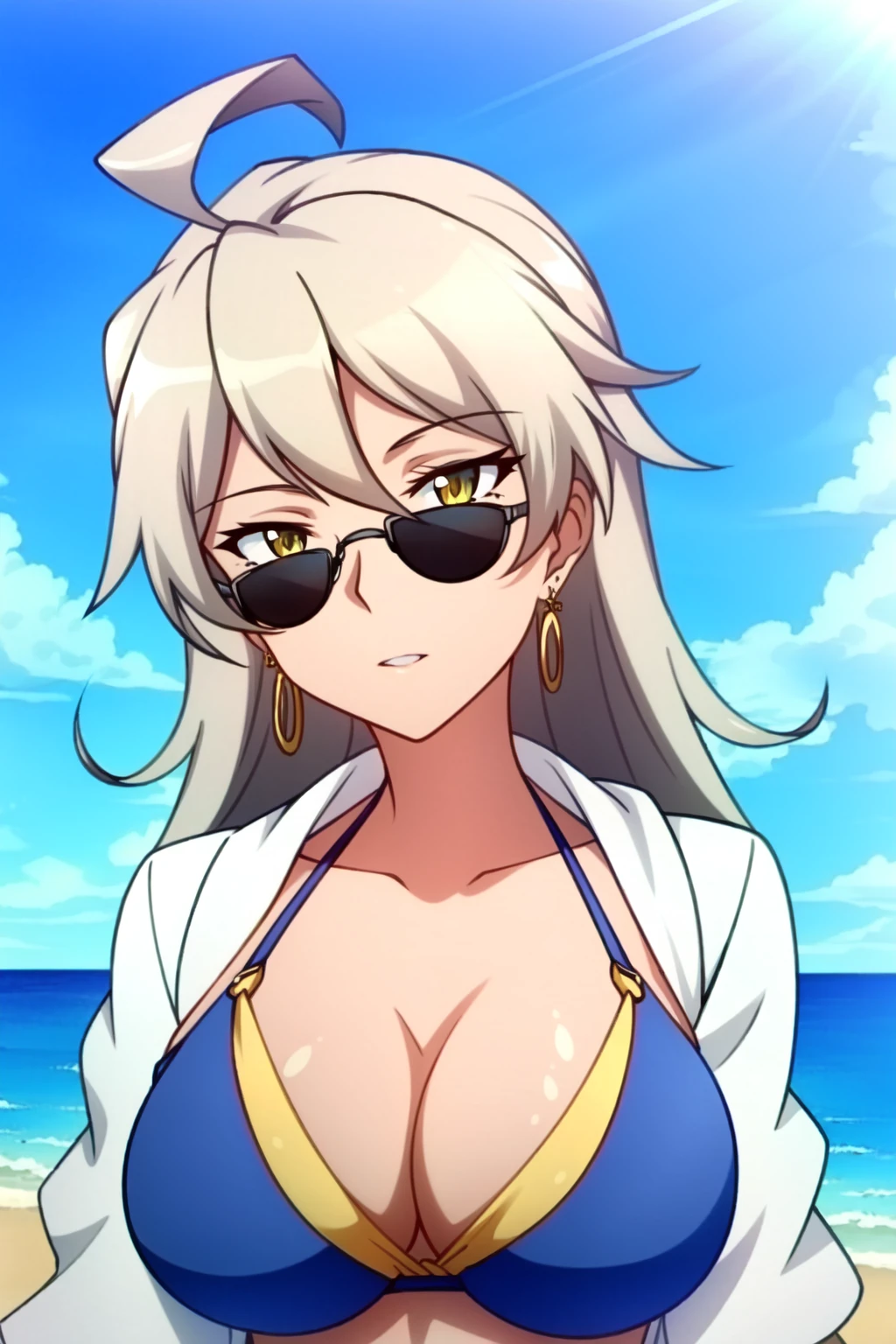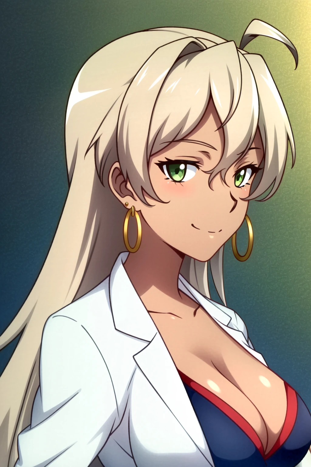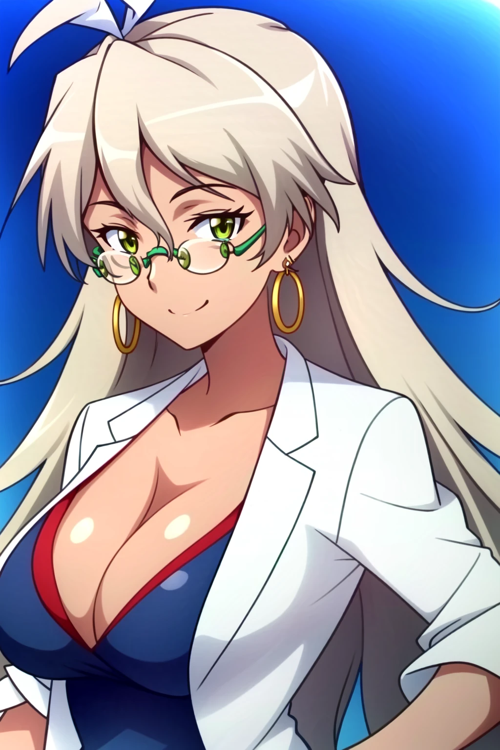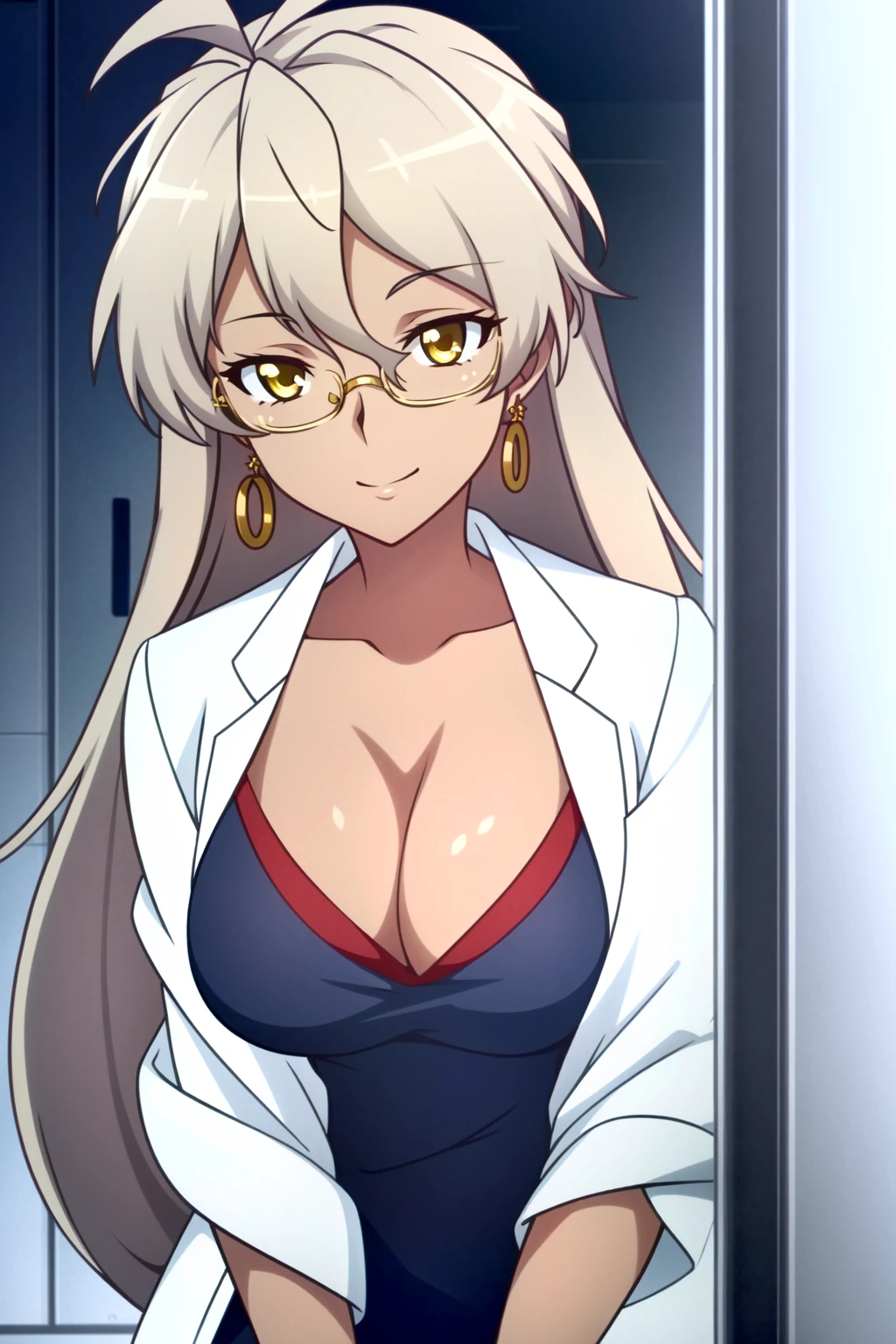 Delilah Uzal, 1girl, solo, thighhighs, glasses, breasts, jewelry, cleavage, earrings, long hair, dark skin, labcoat, dark-skinned female, large breasts, zettai ryouiki, green eyes, dress, grey hair, skirt, smile