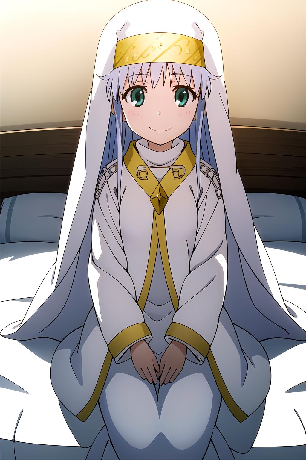 silver hair, green eyes, long dress, safety pin, veil, yellow headwear