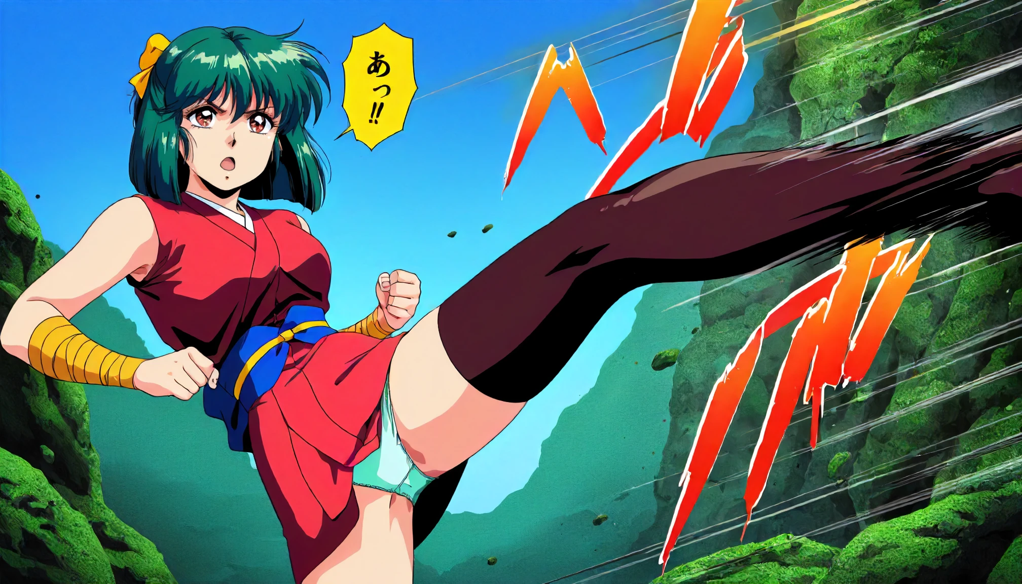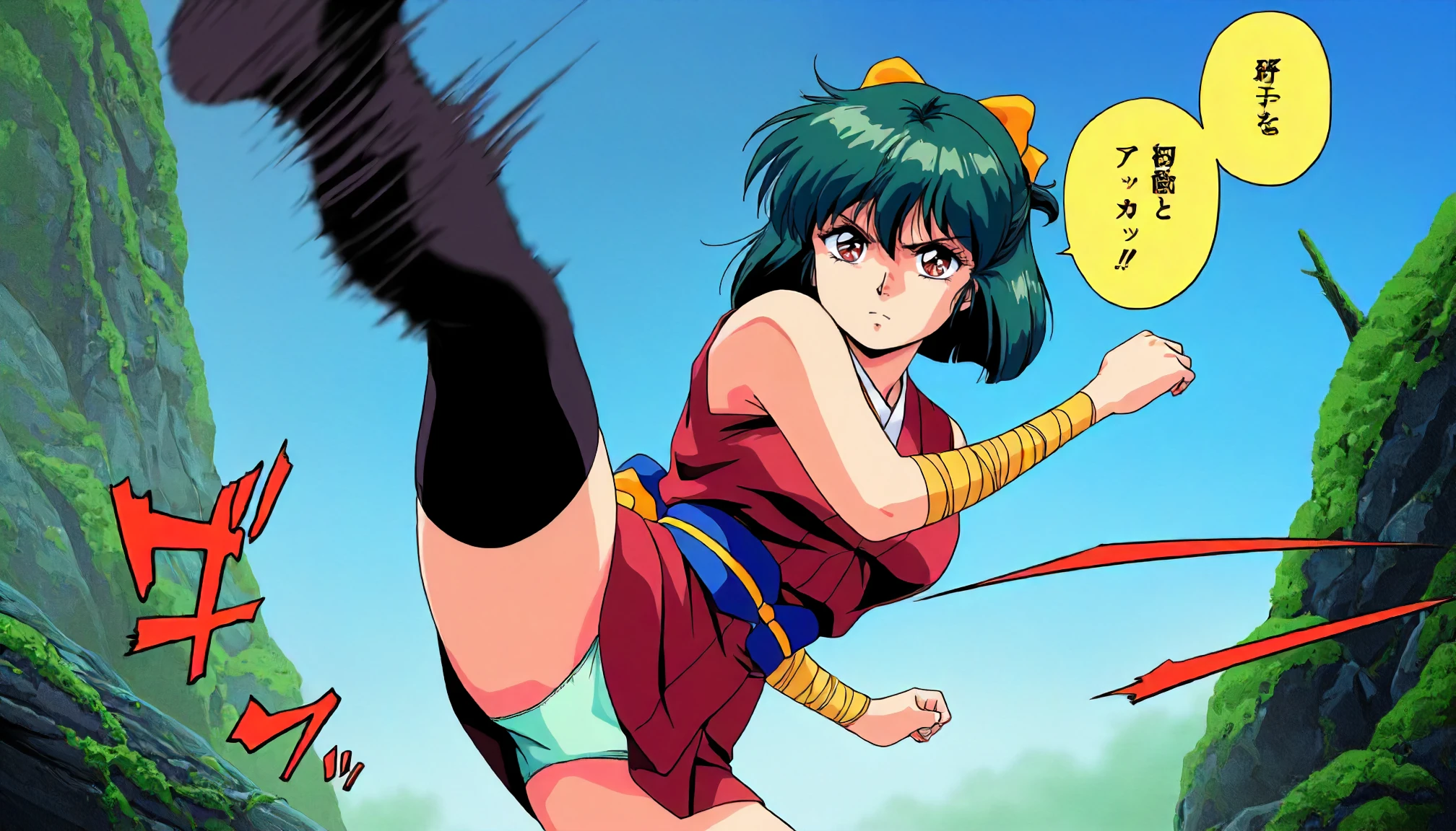 anime coloring,1980s \(style\), yaku\(injuu_gakuen_la_blue_girl\),1girl,green hair,short hair,half updo,bow,brown red eyes,