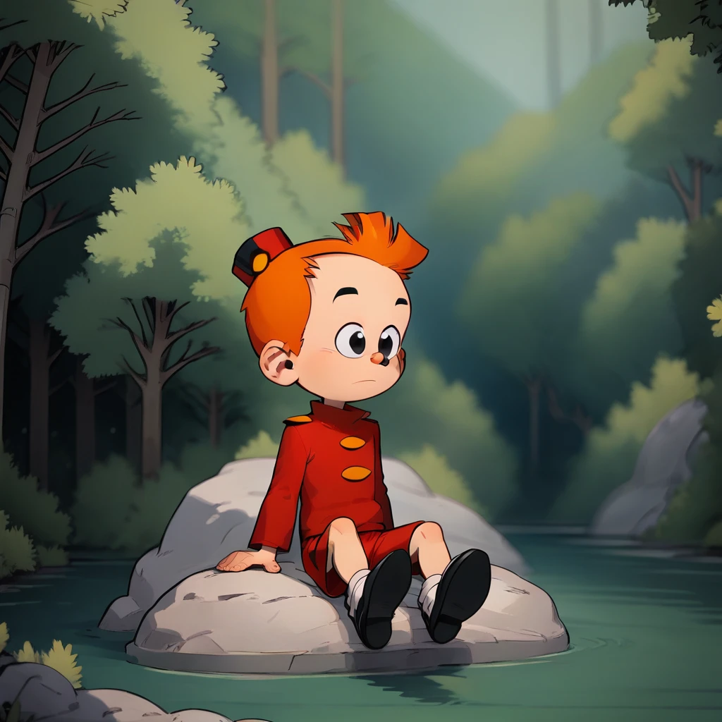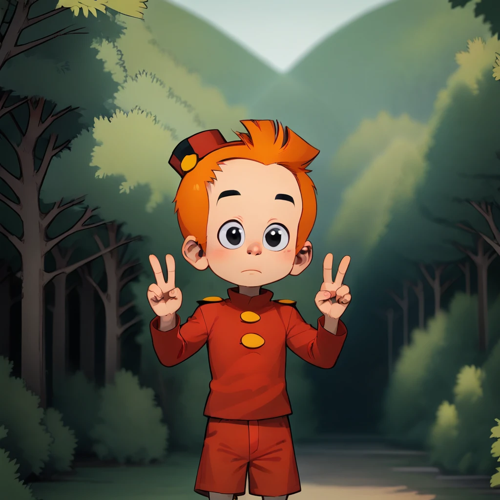 Spirou, solo, 1boy, orange hair, black eyes, red hat,