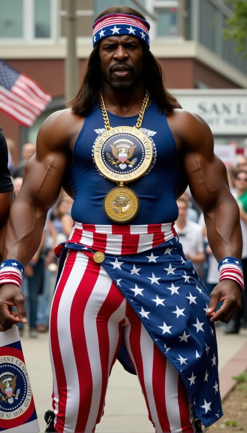 Camacho, a muscular Terry Crews with long hair and facial hair