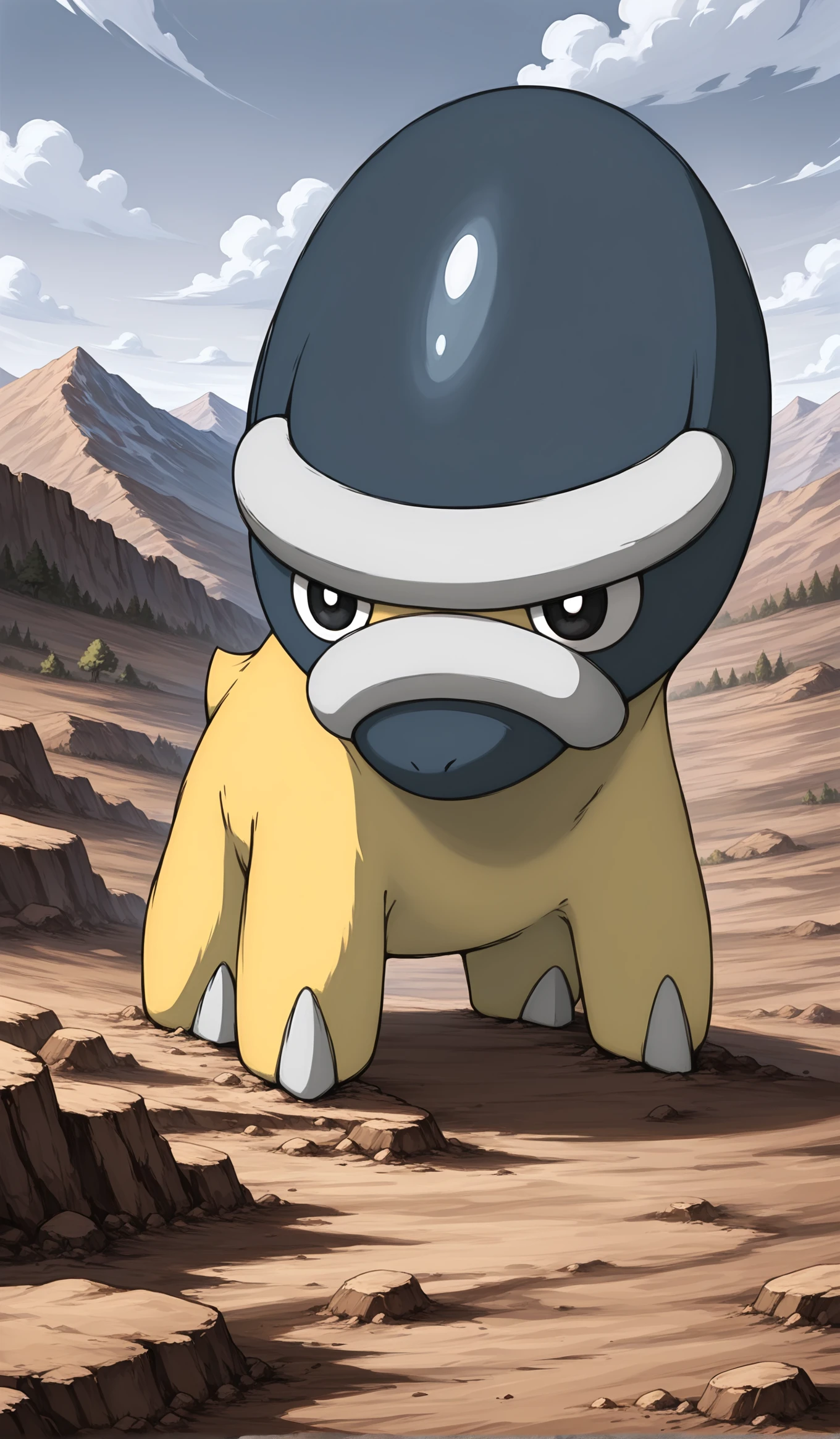 shieldon, pokemon (creature), yellow body, grey face, dark grey head, white rim, white horns, blunt snout, black eyes, white sclera, quadruped,