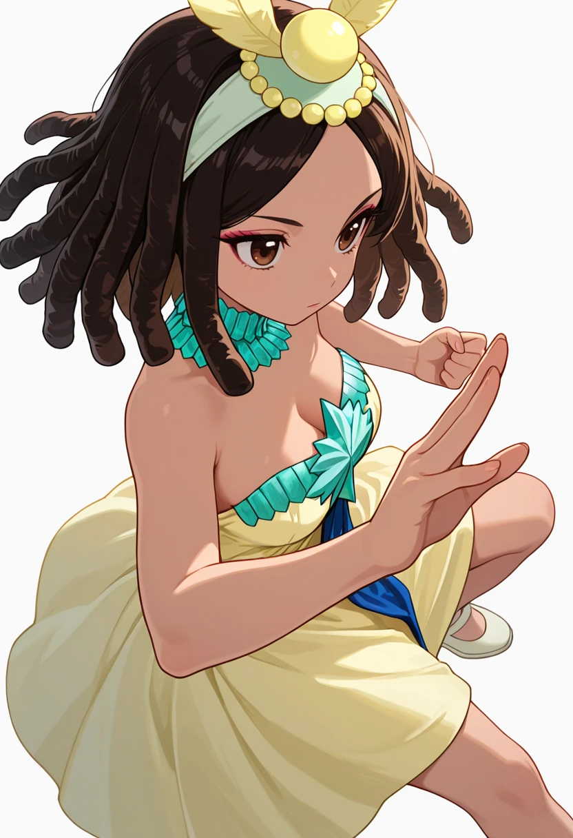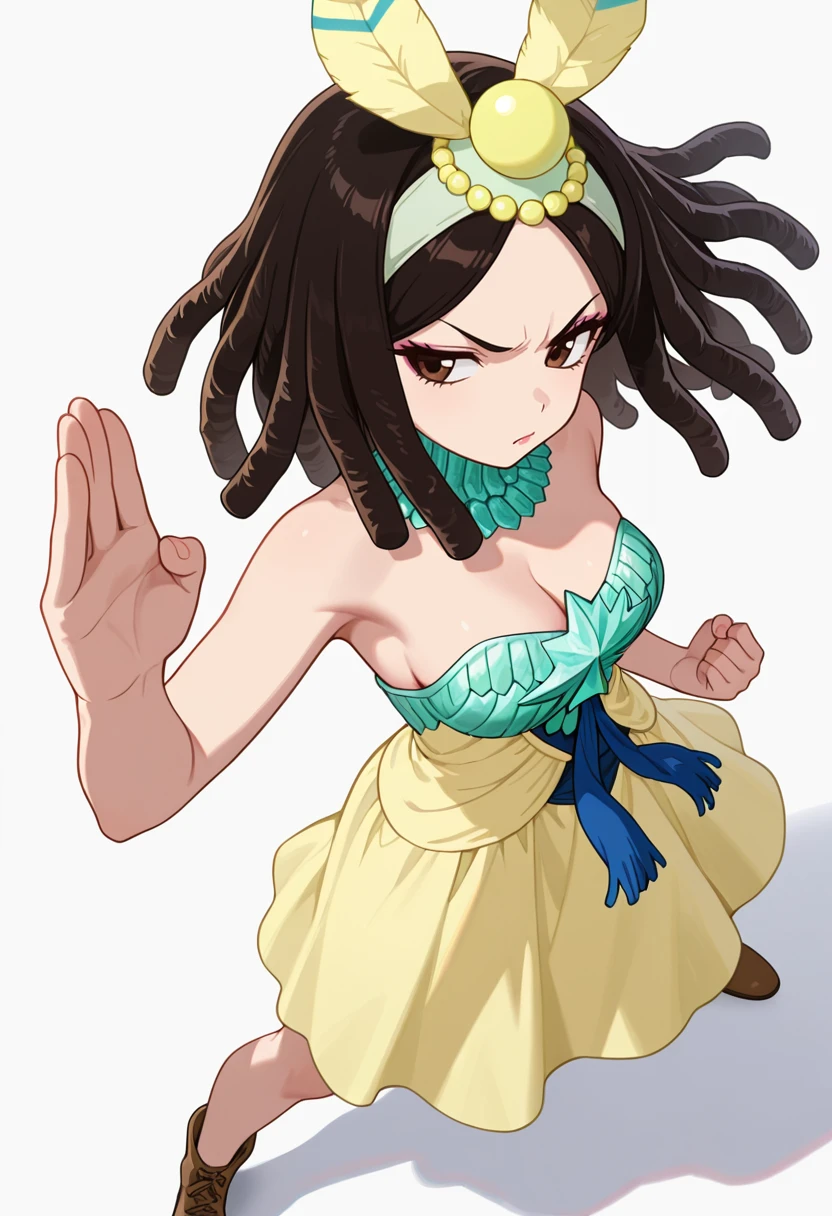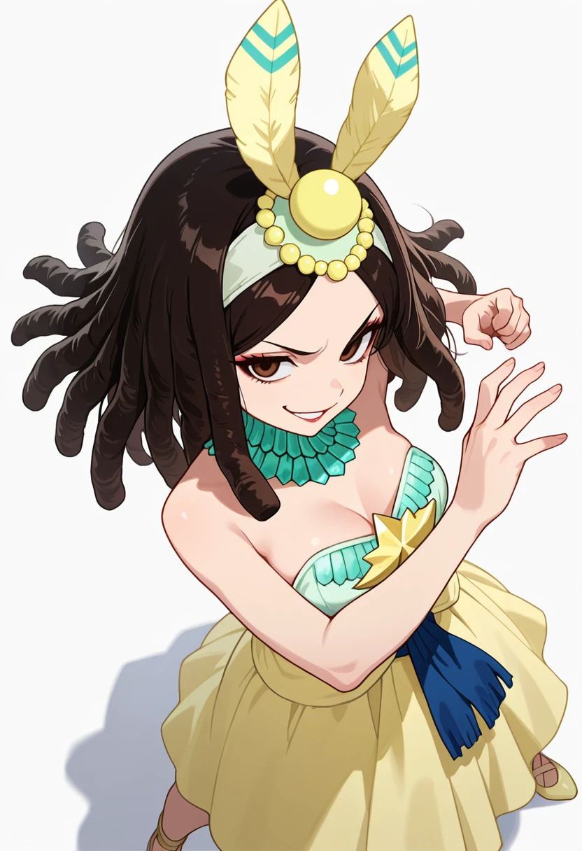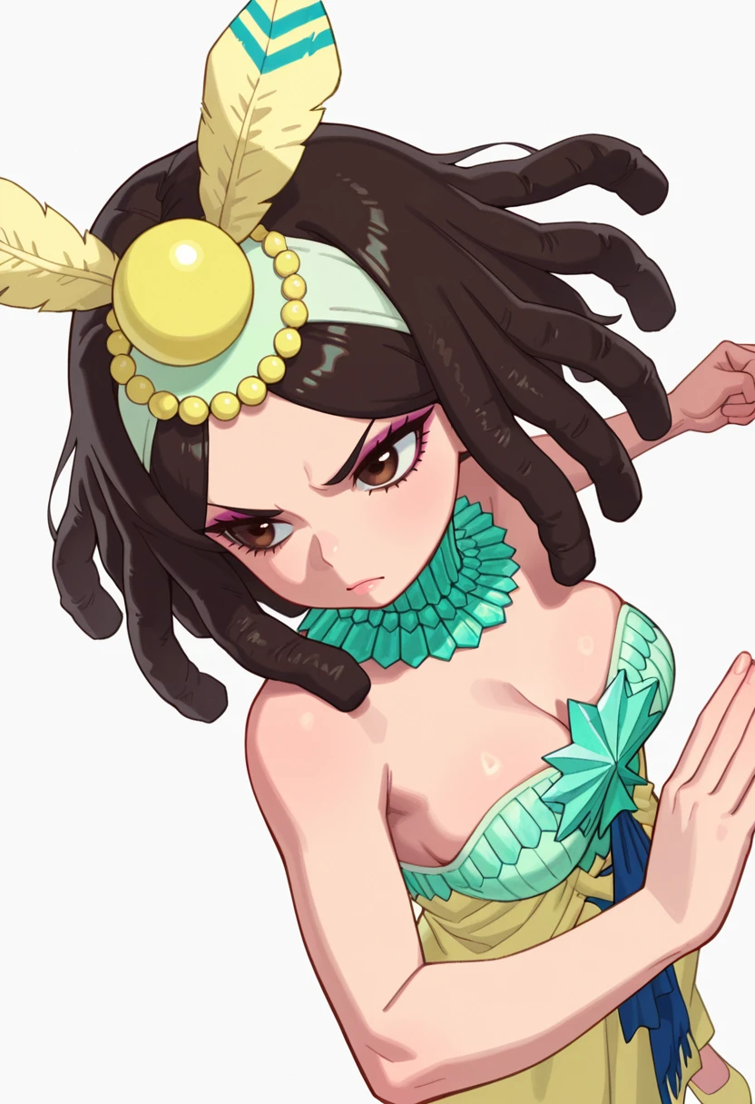 amaryllis_cnr, 1girl, brown eyes,medium breasts, brown hair, long hair, medium hair, dreadlocks, makeup,hairband,aqua necklace,hair ornament,