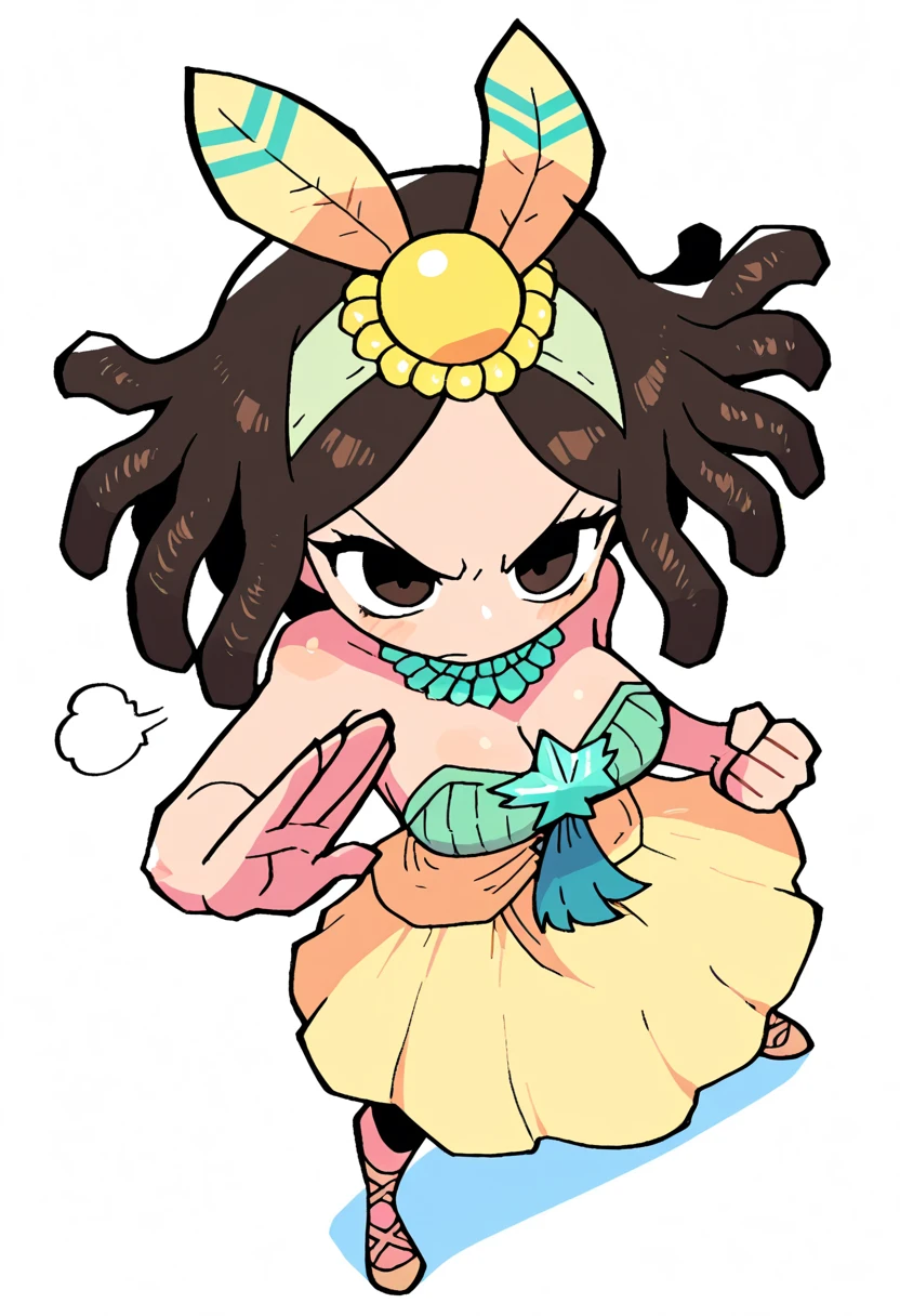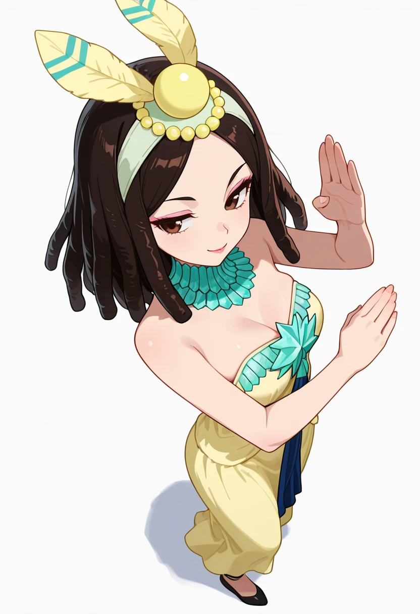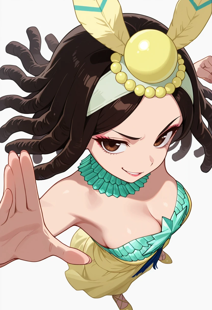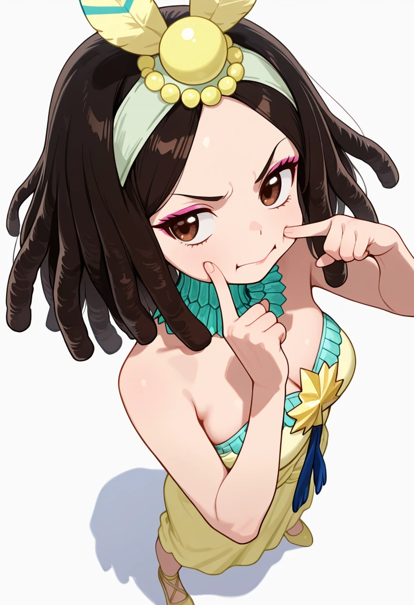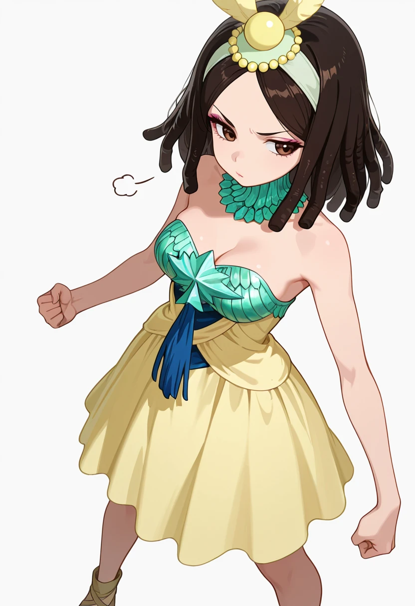 amaryllis_cnr, 1girl, brown eyes,medium breasts, brown hair, long hair, medium hair, dreadlocks, makeup,hairband,aqua necklace,hair ornament,