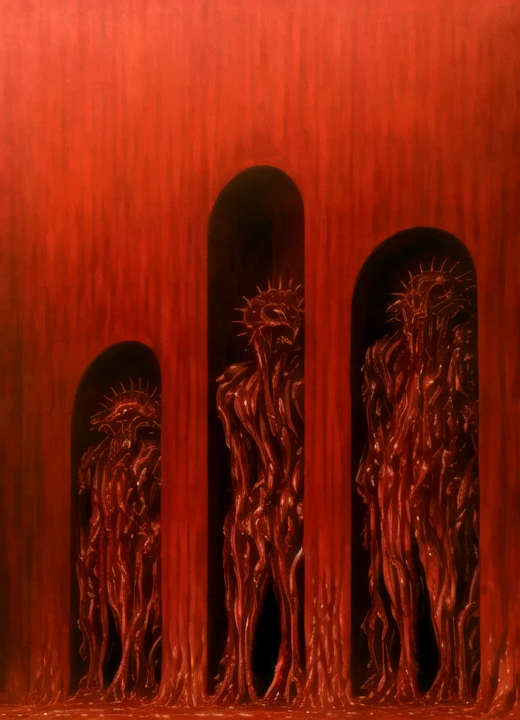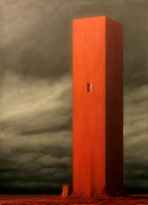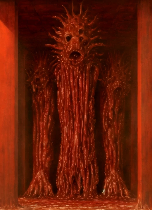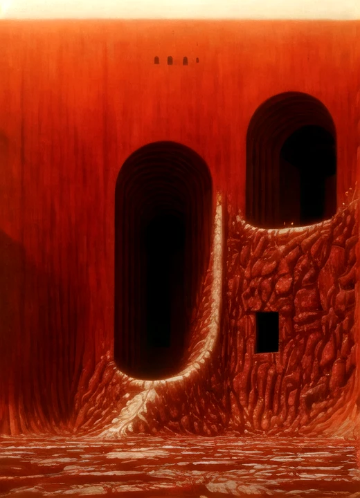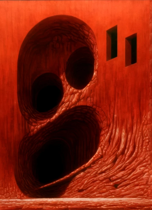 Other words that help with the style: flesh, dark sky, monolith, red walls