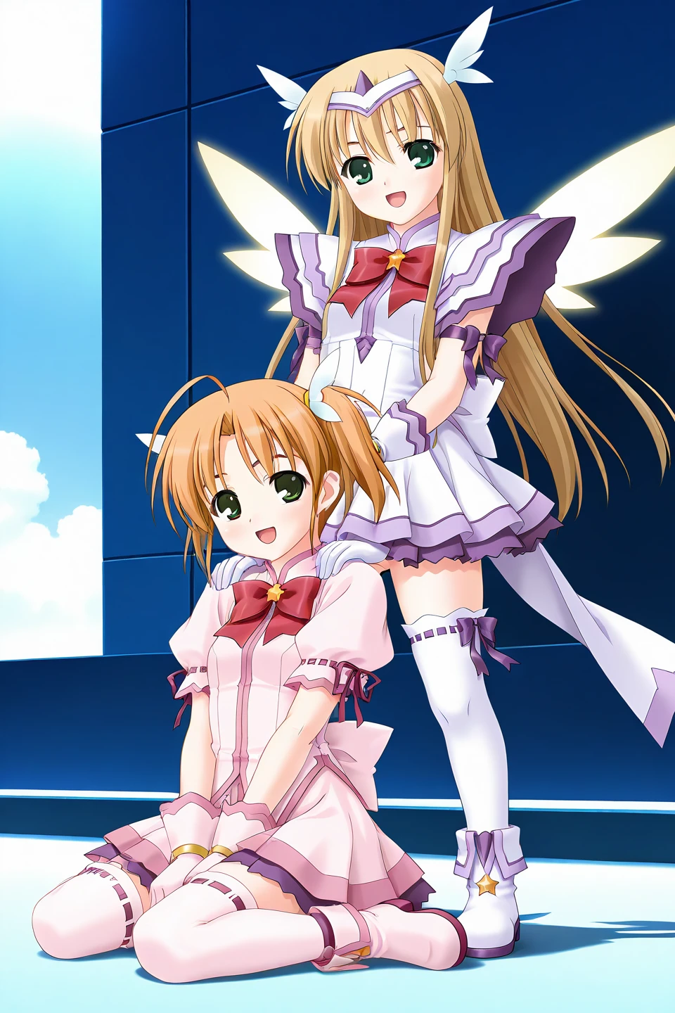 hair bobbles,hair ornament,wings,hair wings,magical girl,bow,red bow,red bowtie,white wings,angel wings,star brooch,bowtie,jewelry,dress,pink dress,pink shirt,short sleeves,puffy sleeves,puffy short sleeves,gloves,pink gloves,back bow,red back bow,large bow,ribbon,ribbon trim,ribbon-trimmed clothes,ribbon-trimmed sleeves,skirt,miniskirt,pink skirt,white skirt,frills,frilled skirt,layered skirt,pleated skirt,zettai ryouiki,thighhighs,pink thighhighs,ribbon-trimmed thighhighs,thigh ribbon,shoes,boots,pink footwear,