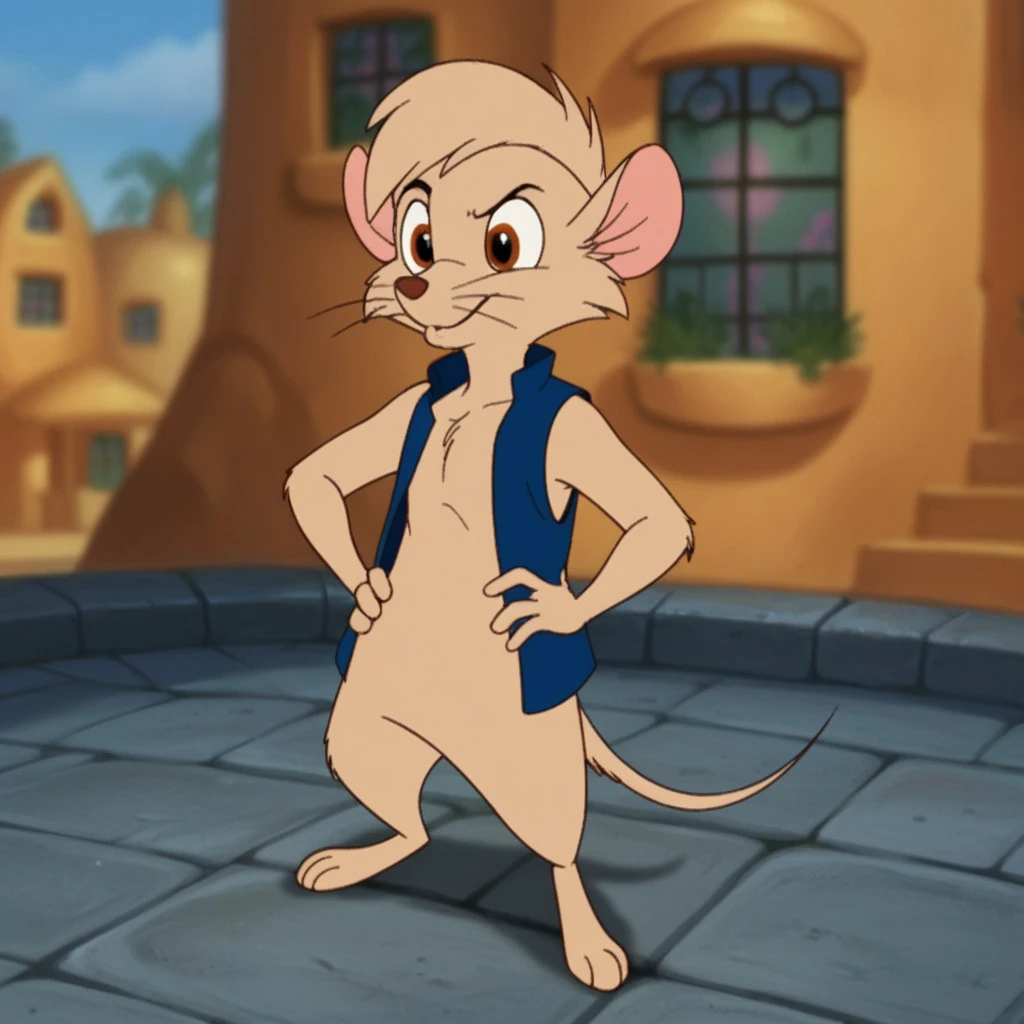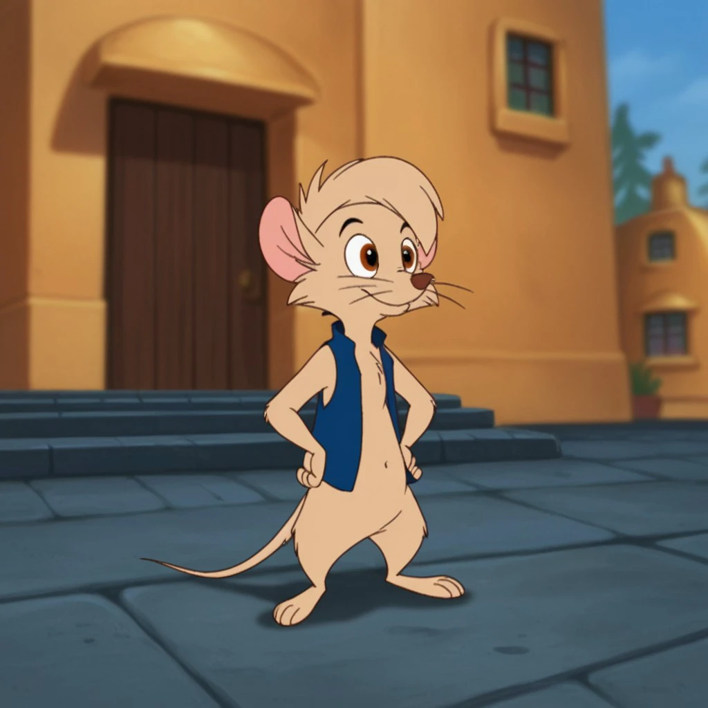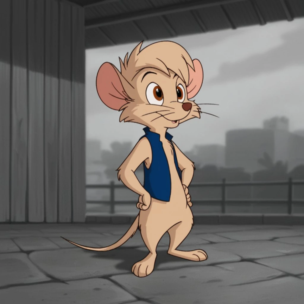 Timmynimh2, semi-anthro, male, mouse, tan fur, brown eyes, short hair, blue vest,