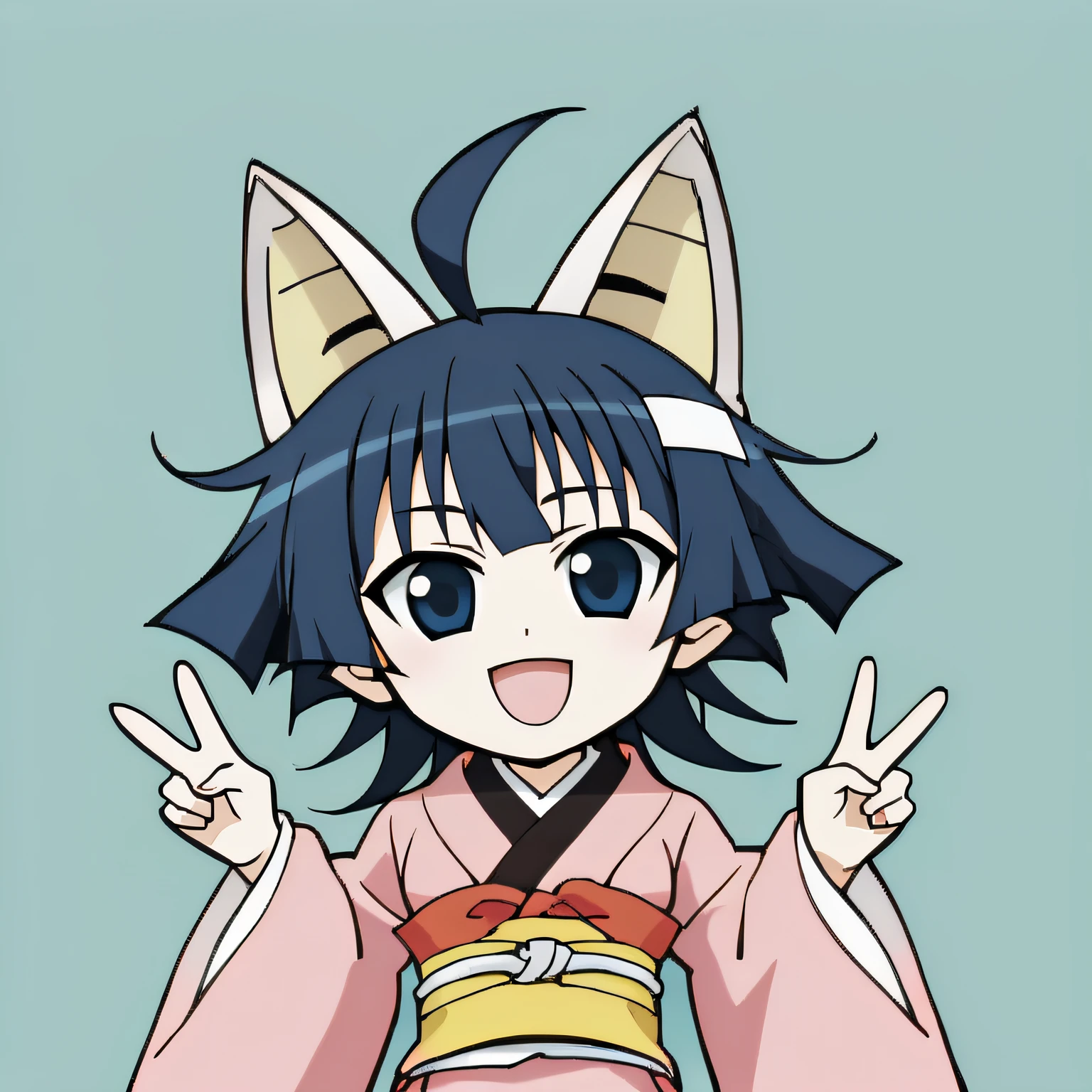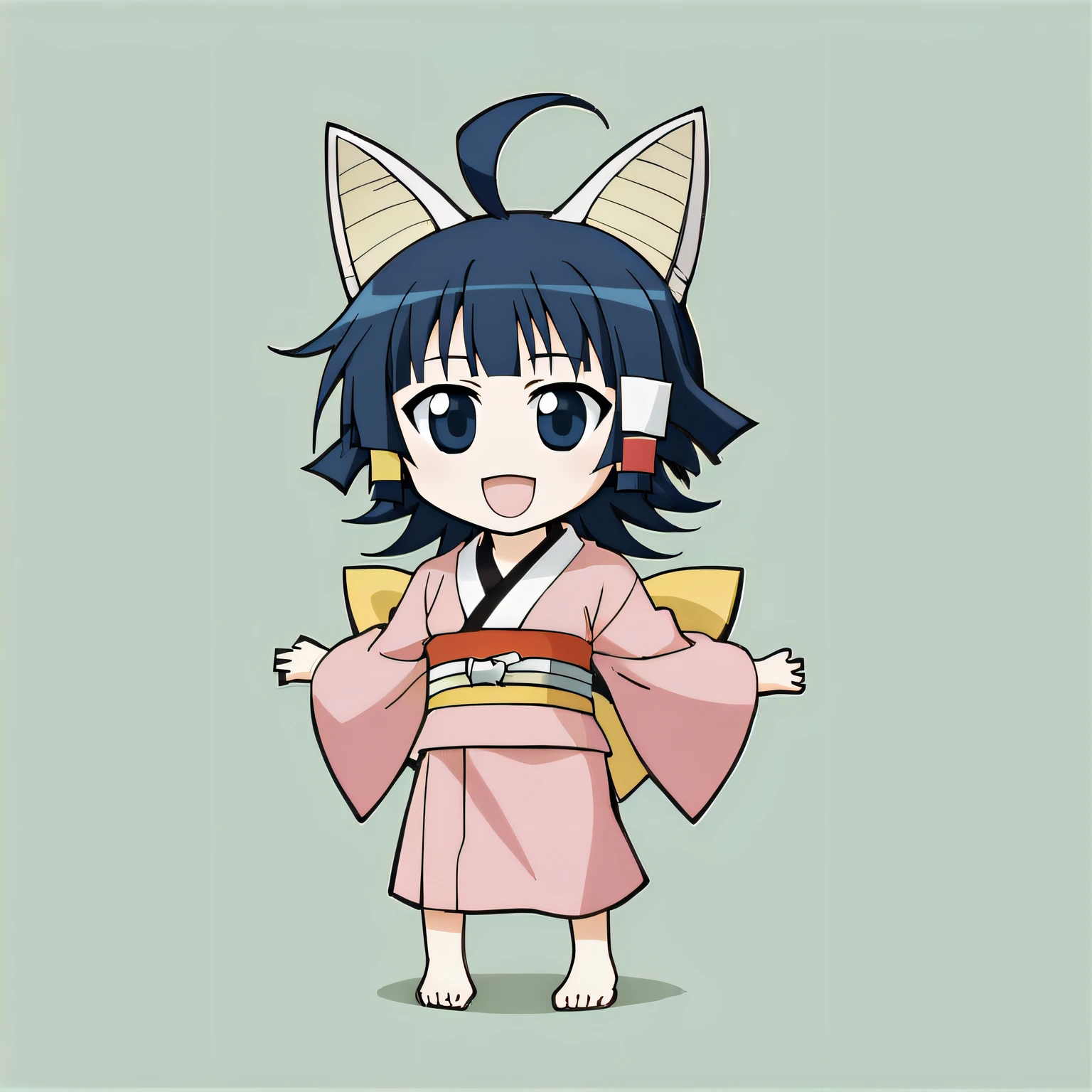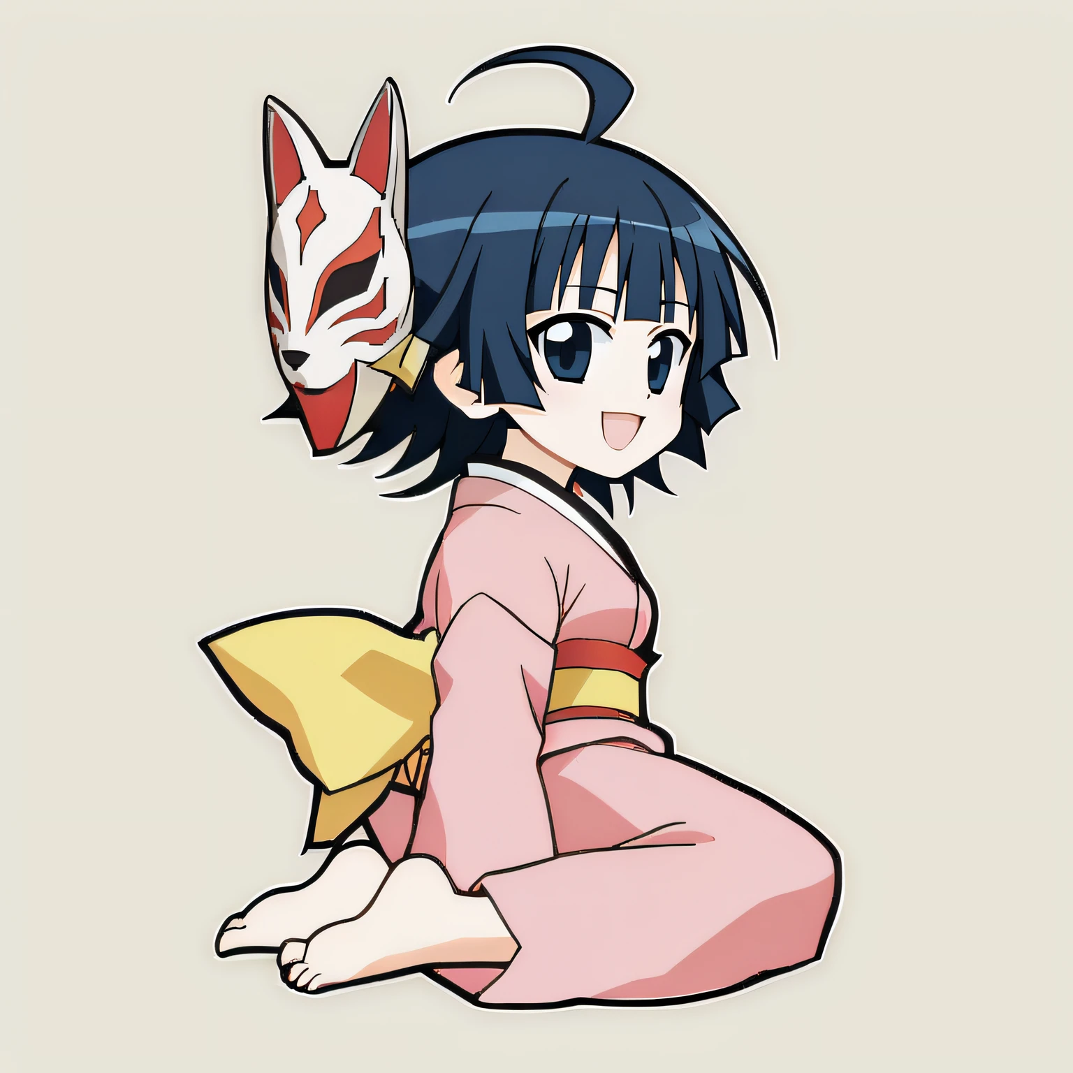 warashisama, chibi, dark blue hair, ahoge, japanese clothes, pink kimono, yellow sash, fox mask, mask behind head, animal ears, barefeet