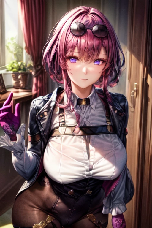 Trigger word: kafka_a, purple eyes, large breasts, sunglasses, eyewear on head, harness, black jacket, white shirt, collared shirt, long sleeves, white sleeves, purple gloves, black shorts, thigh strap, pantyhose, boots