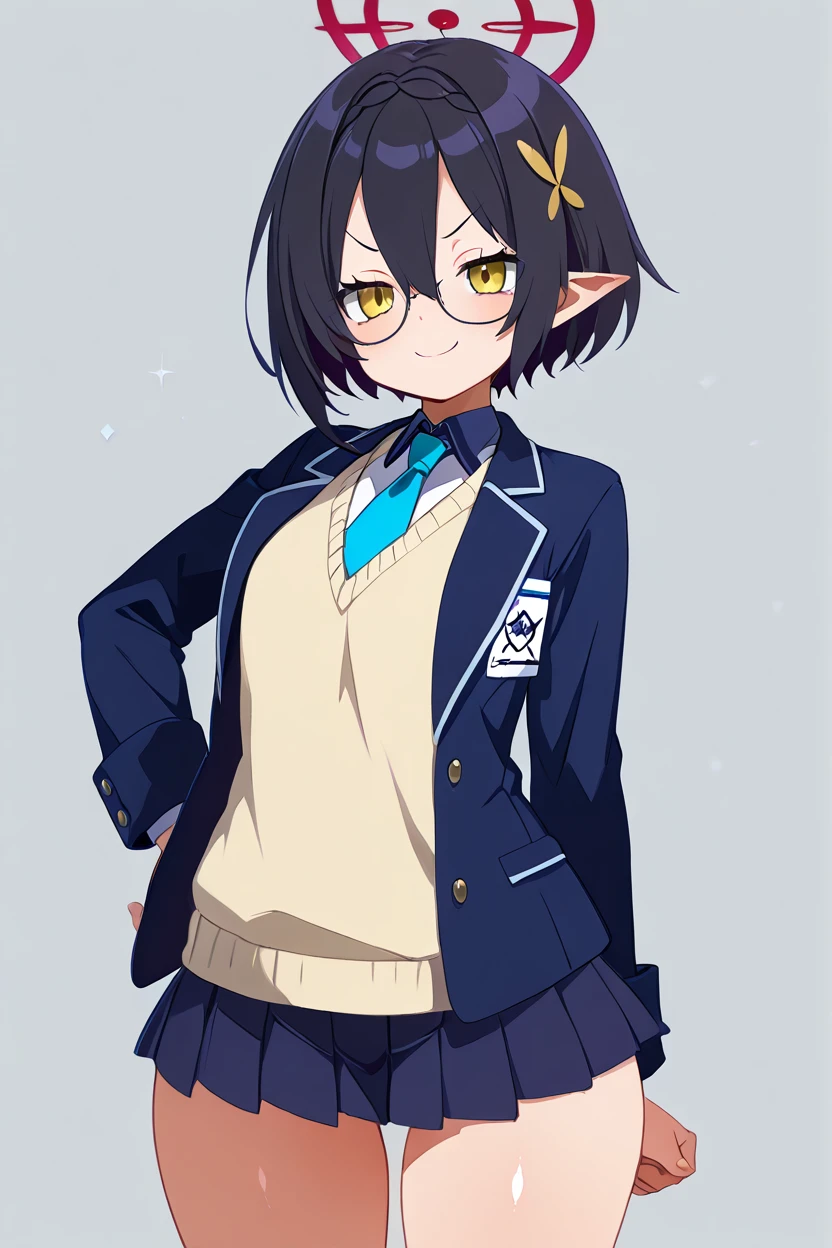 zzAyane, yellow eyes, black hair, short hair, glasses, halo, school uniform, blue necktie, white shirt, blazer, sweater vest, skirt,