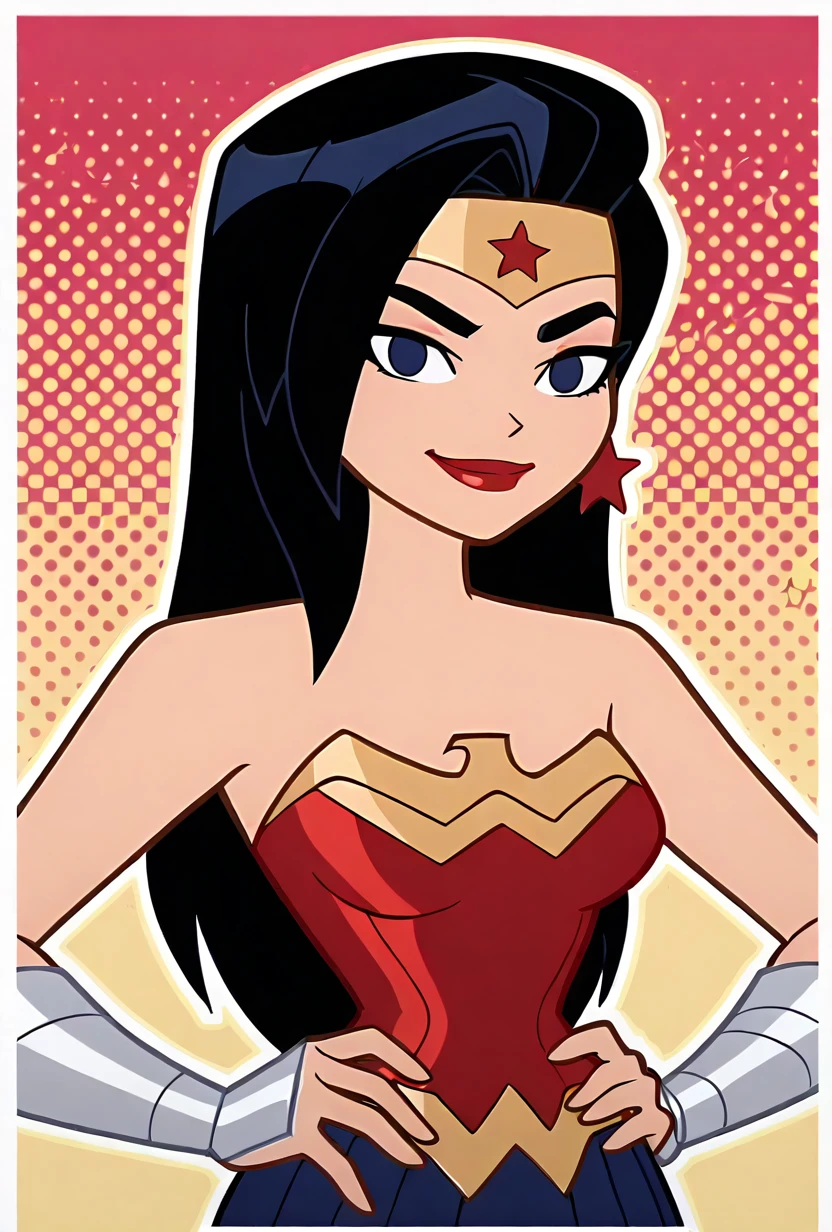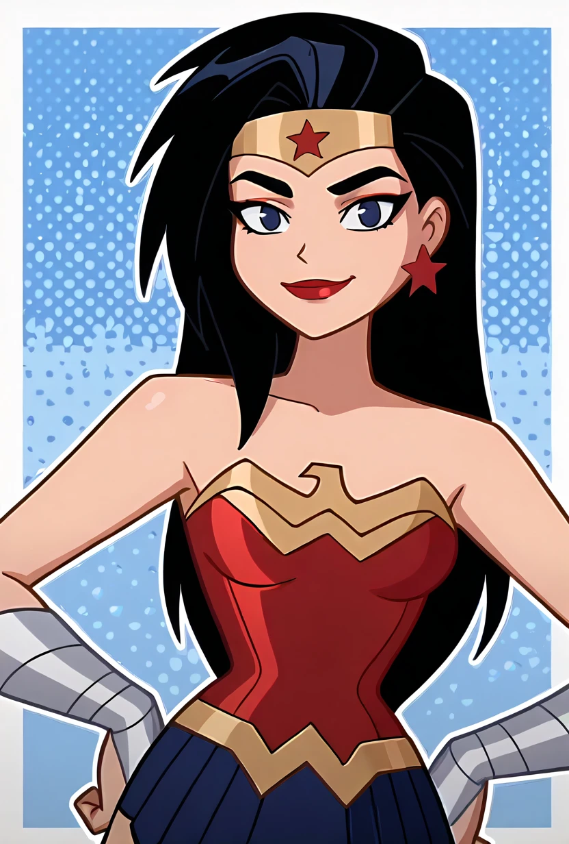 wonderwomanac, 1girl, long hair, breasts, black hair, bare shoulders, star (symbol), red lips, makeup, earrings, strapless, thin waist, blue skirt