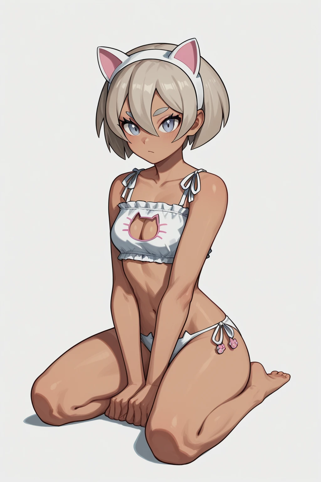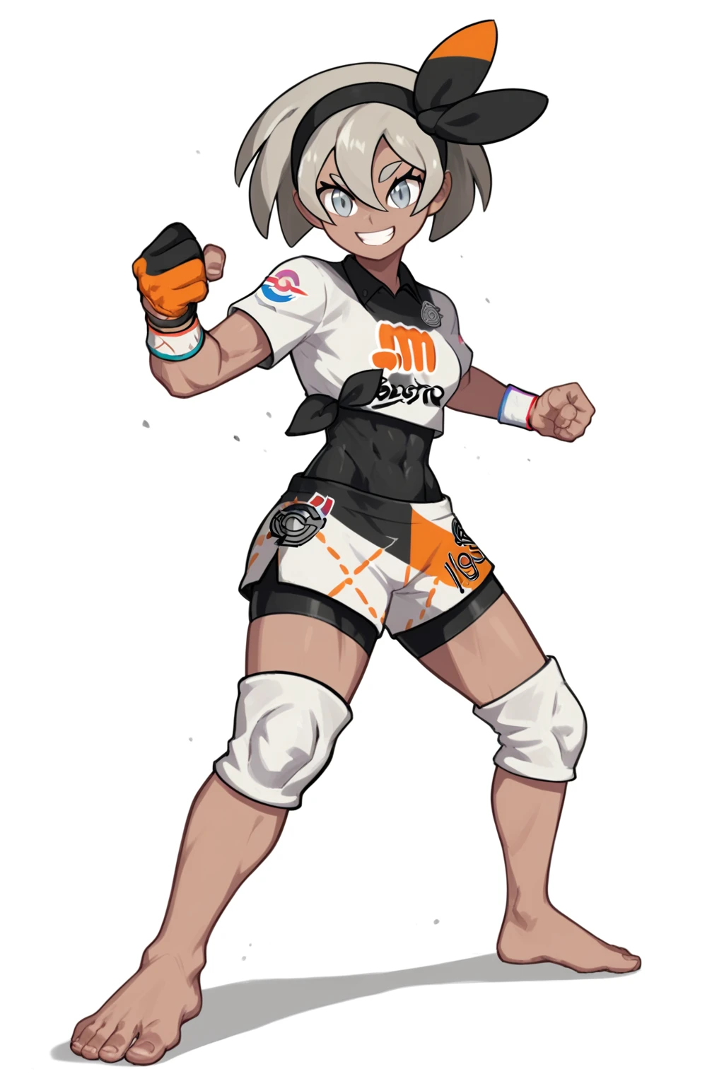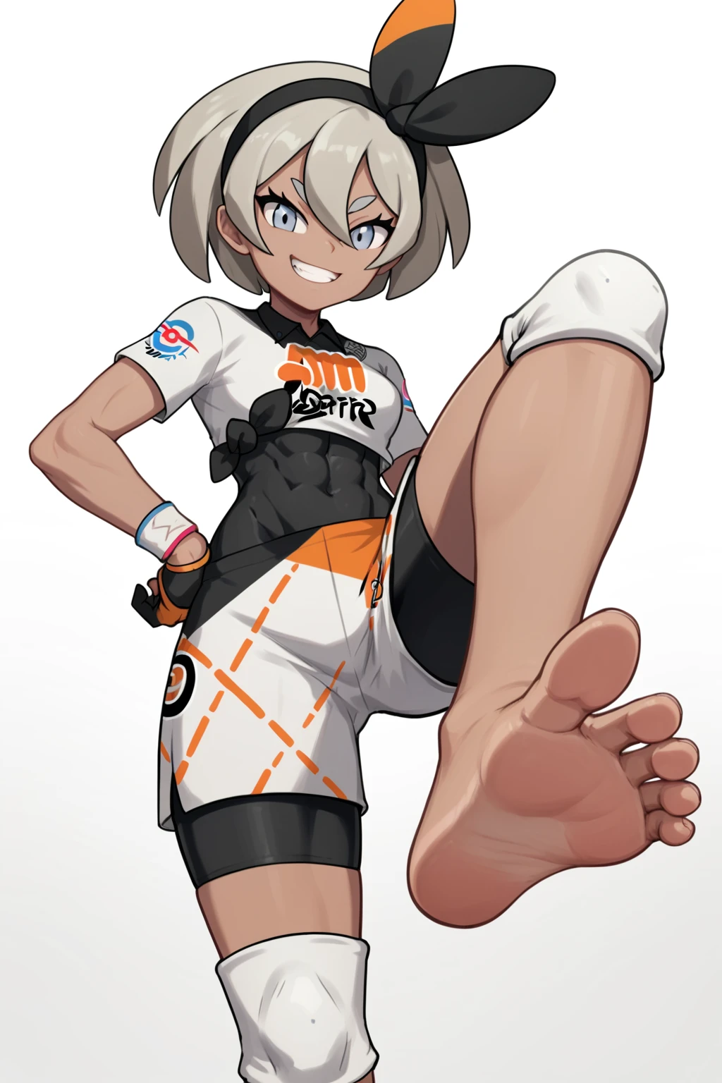 Black hairband, bow hairband, print shirt, print shorts, black bodysuit, bodysuit under clothes, single glove, wristband, knee pads, barefoot