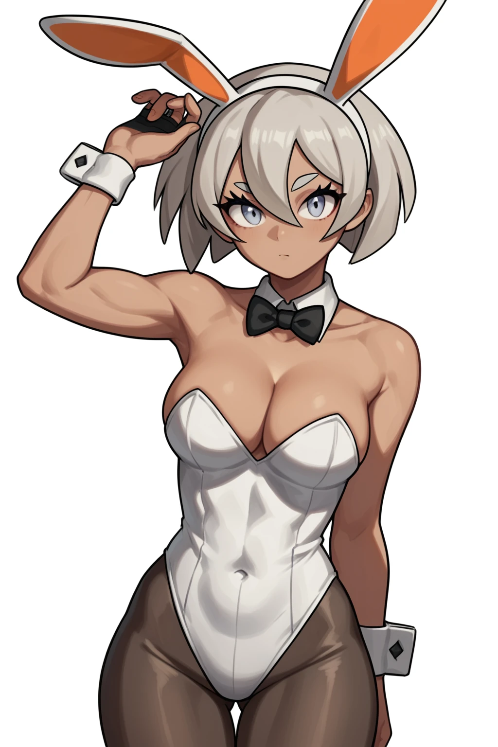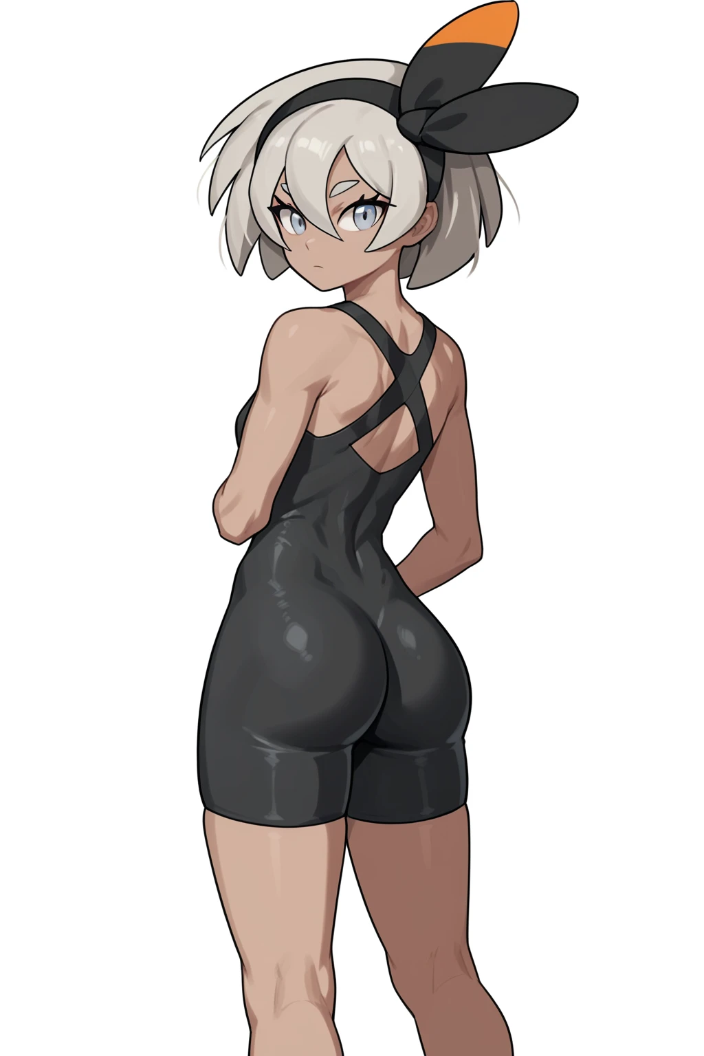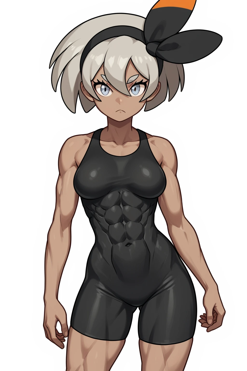 Black hairband, bow hairband, print shirt, print shorts, black bodysuit, bodysuit under clothes, single glove, wristband, knee pads, barefoot