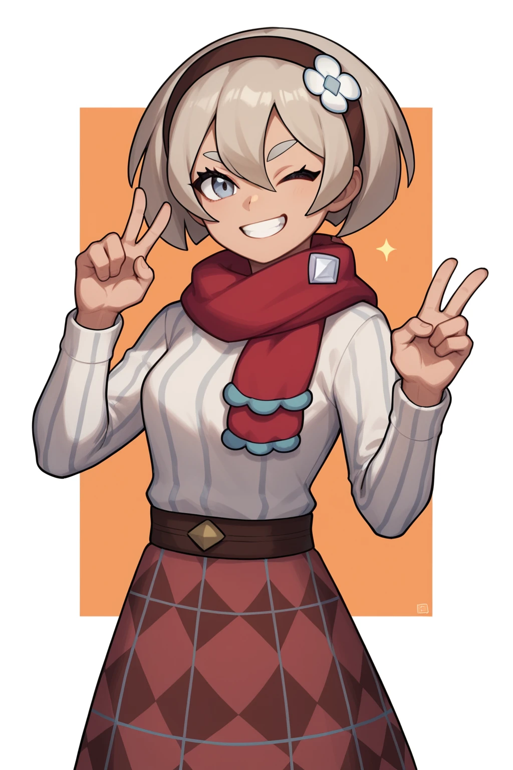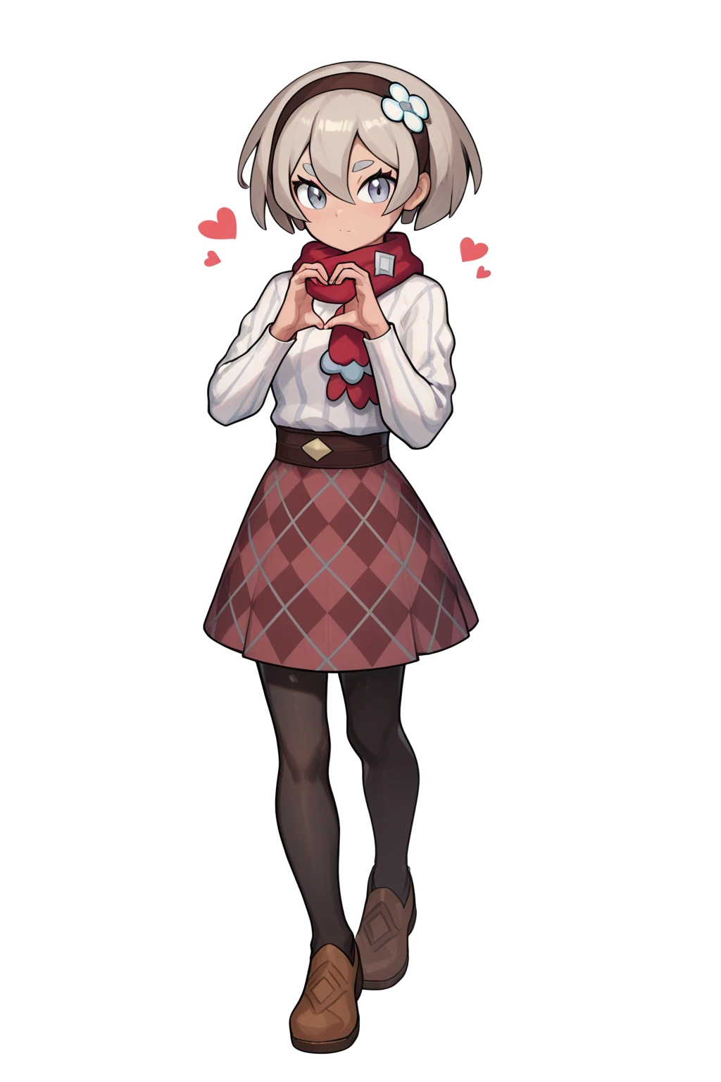 Palentines, white sweater, brown hairband, hair flower, red skirt, plaid skirt, pantyhose, brown footwear
