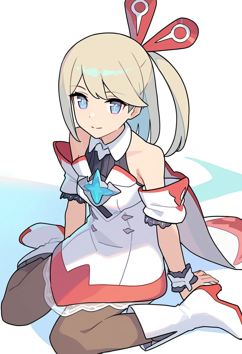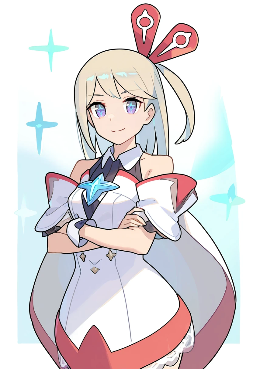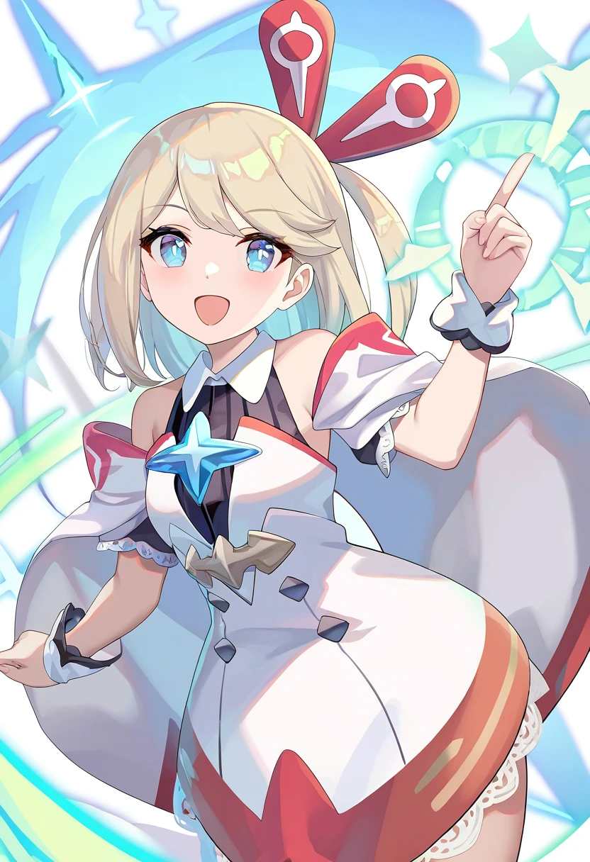 角色基本特征:1girl,stella \(world flipper\),blue eyes,small breasts,white dress,sidelocks,hair ornament,one side up,blonde hair,long hair,swept bangs,hairclip,