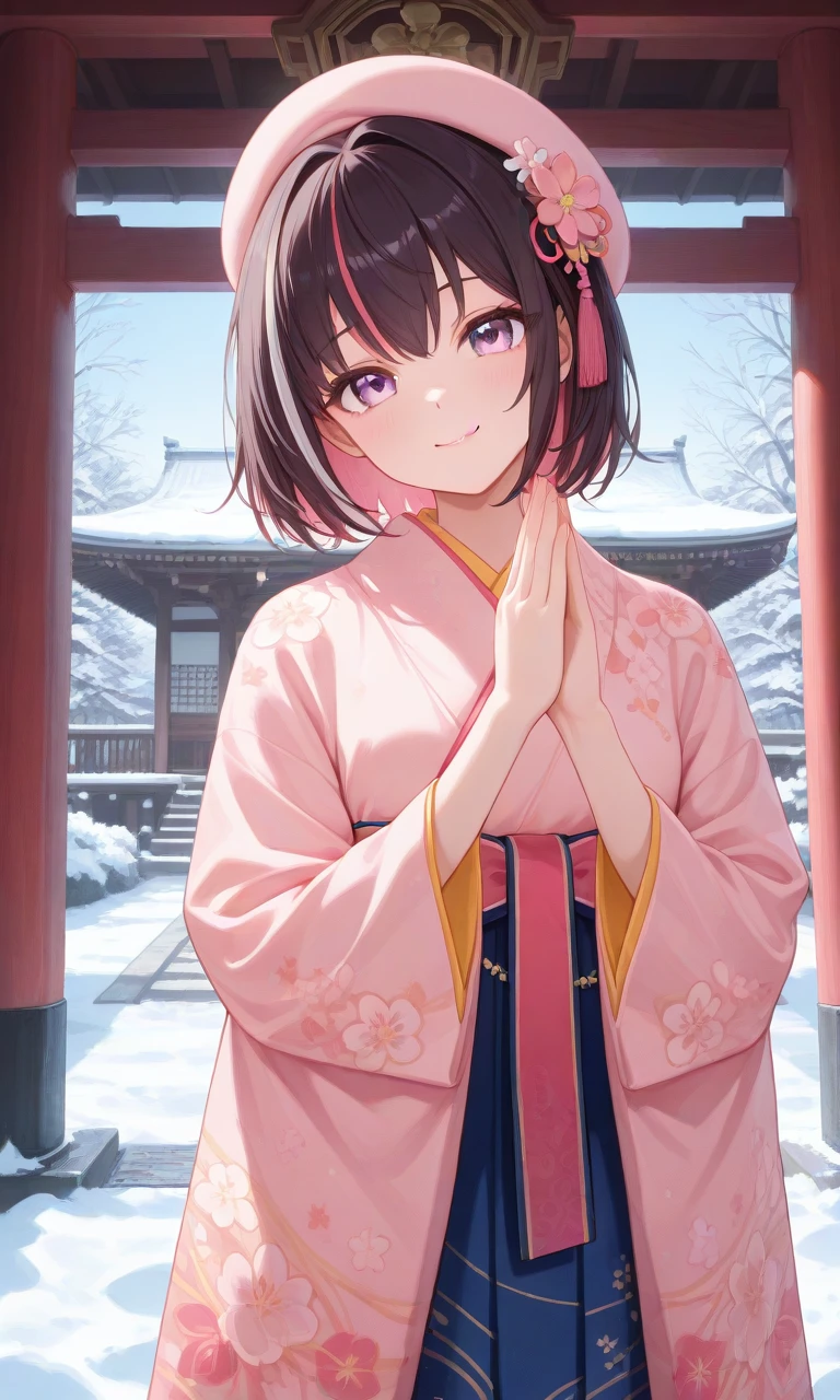 azk1newyear, short hair, hair flower, pink kimono, floral print, wide sleeves, hakama skirtYou can add