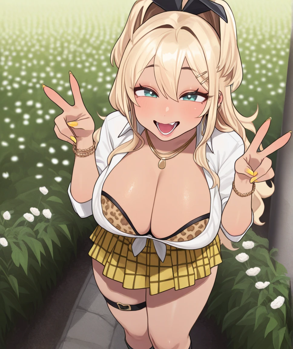 rupeedef, hair ornament, gyaru, blonde hair, green eyes, hairclip, necklace, jewelry, choker, large breasts, leopard print, bra, white shirt, skirt, plaid skirt, pleated skirt, clothes around waist, nail polish, yellow nails, thigh strap, :d, skin fang, fang, eyewear hang, sunglasses,