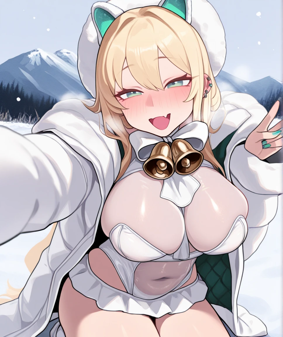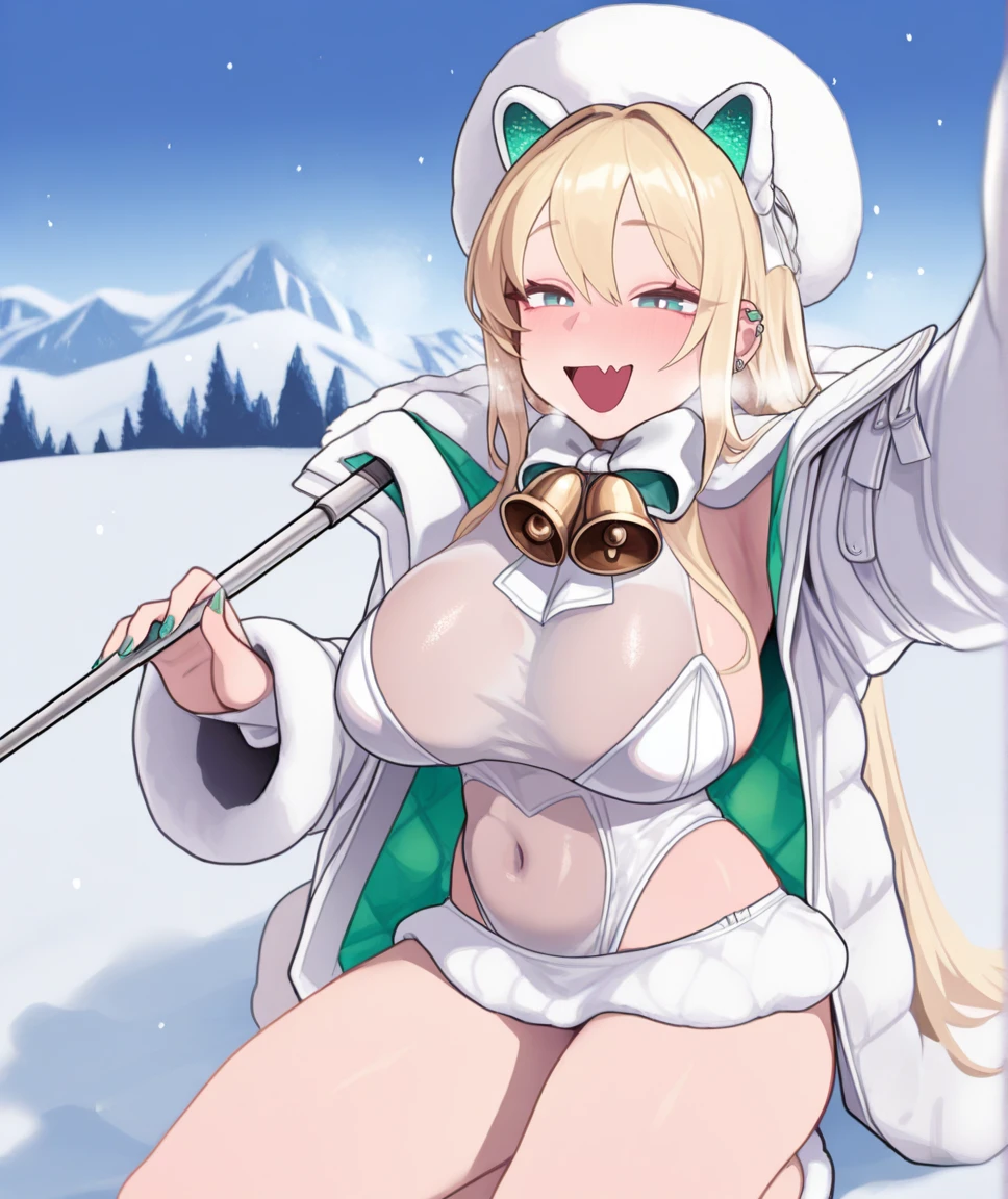 rupeewin, fake animal ears, fur hat, blonde hair, long hair, neck bell, jingle bell, ear piercing, large breasts, white leotard, white jacket, fur trim, see-through, microskirt, covered navel, nail polish, green nails, nose blush, selfie stick, holding_selfie_stick, :d, skin fang, fang