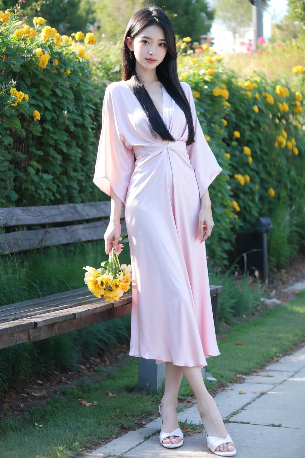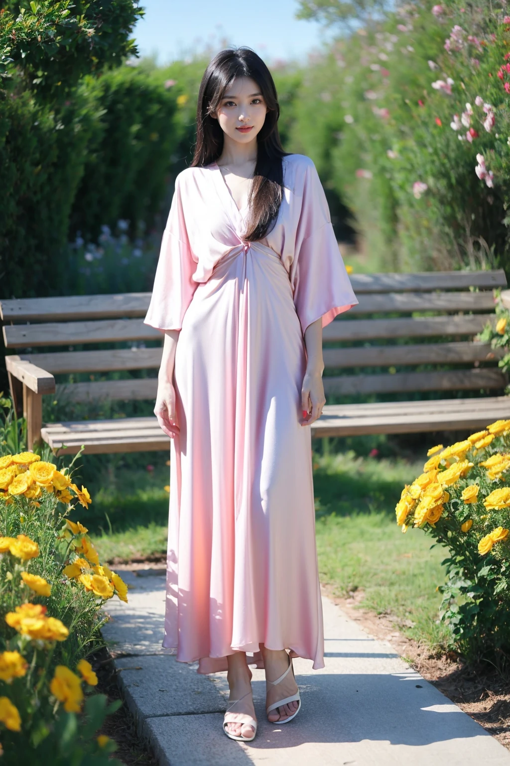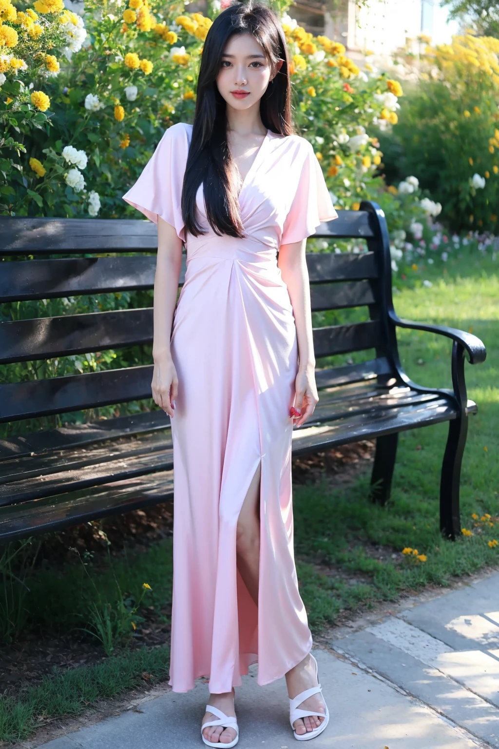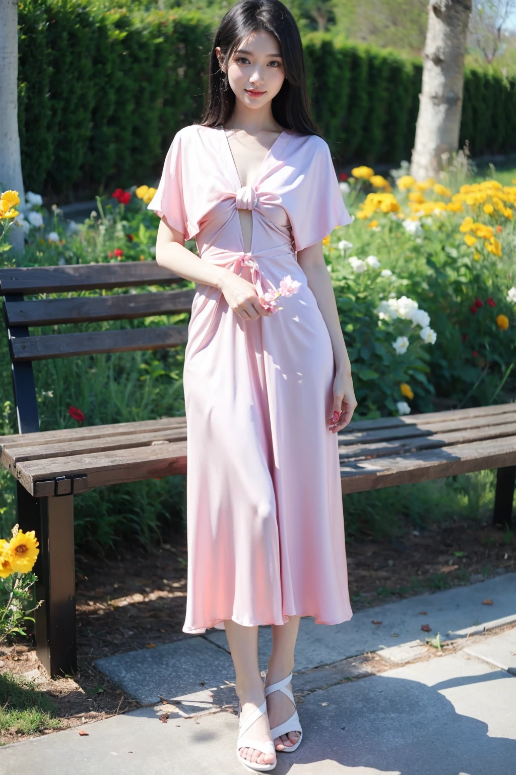 photorealistic,realistic,photography,masterpiece,best quality,ultra-detailed,extremely detailed CG unity 8k wallpaper,(reality: 1.4),1girl,solo,long hair,looking at viewer,black hair,dress,full body shot,white pink shirt,short sleeves,outdoors,day,sandals,bench,plant,yellow flower,beautiful hands,realistic,photo background,pink dress,<lora:lora:0.8>