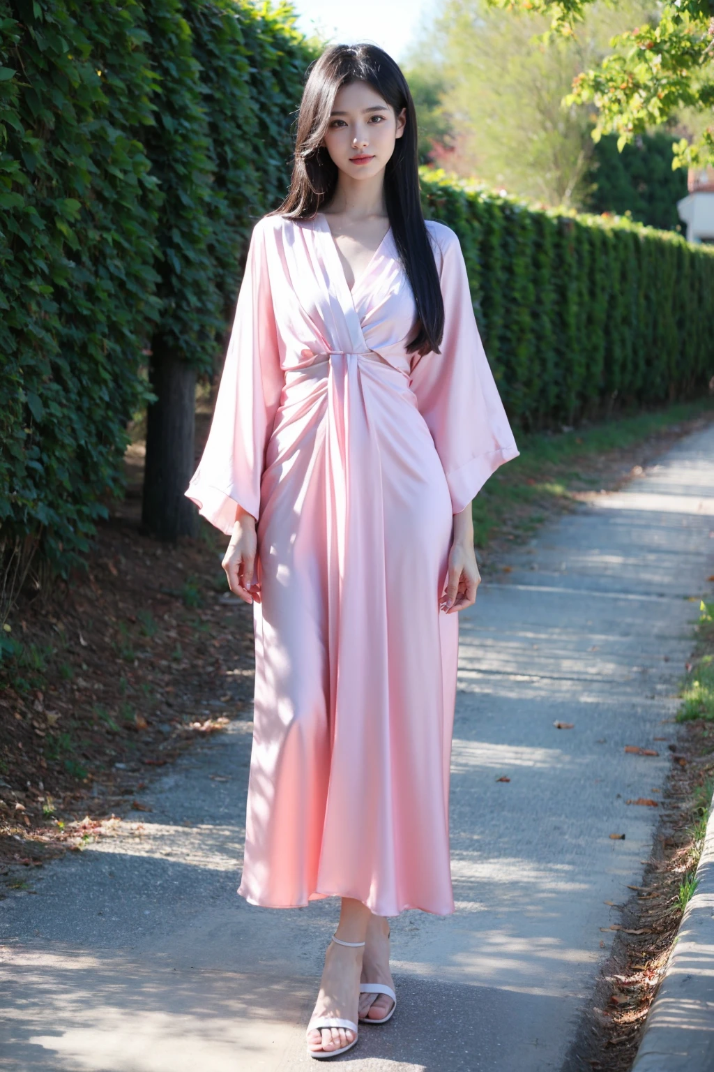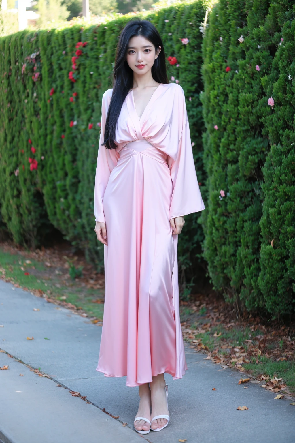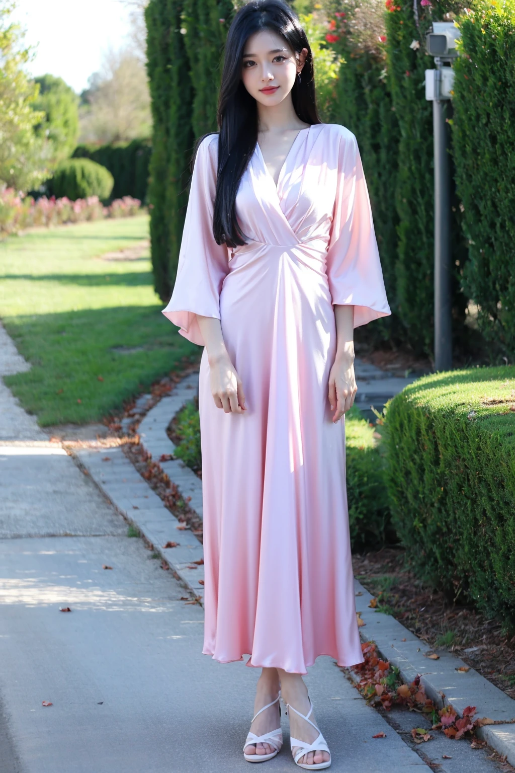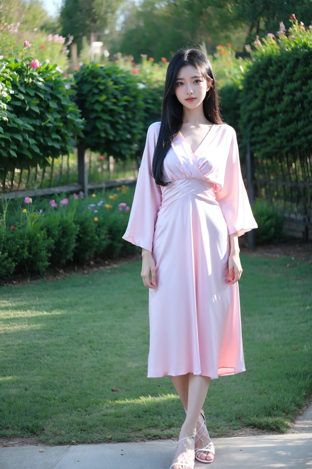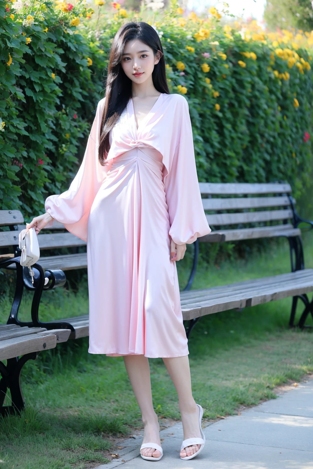 photorealistic,realistic,photography,masterpiece,best quality,ultra-detailed,extremely detailed CG unity 8k wallpaper,(reality: 1.4),1girl,solo,long hair,looking at viewer,black hair,dress,full body shot,white pink shirt,short sleeves,outdoors,day,sandals,bench,plant,yellow flower,beautiful hands,realistic,photo background,pink dress,<lora:lora:0.8>