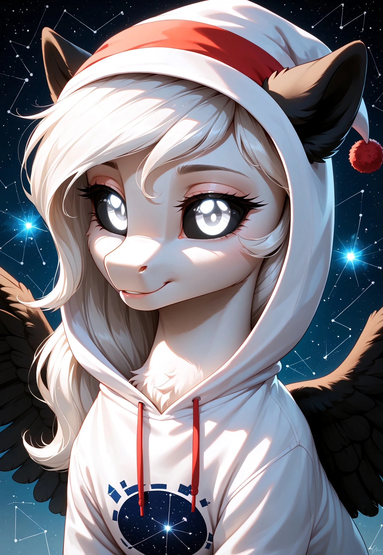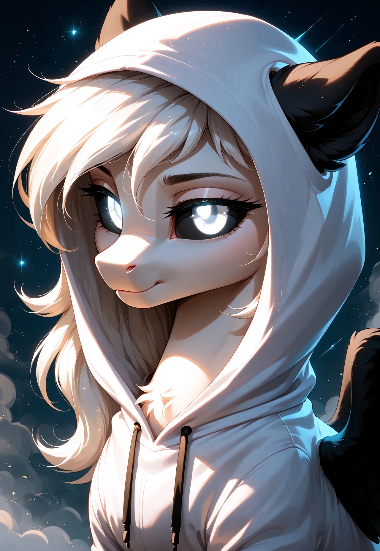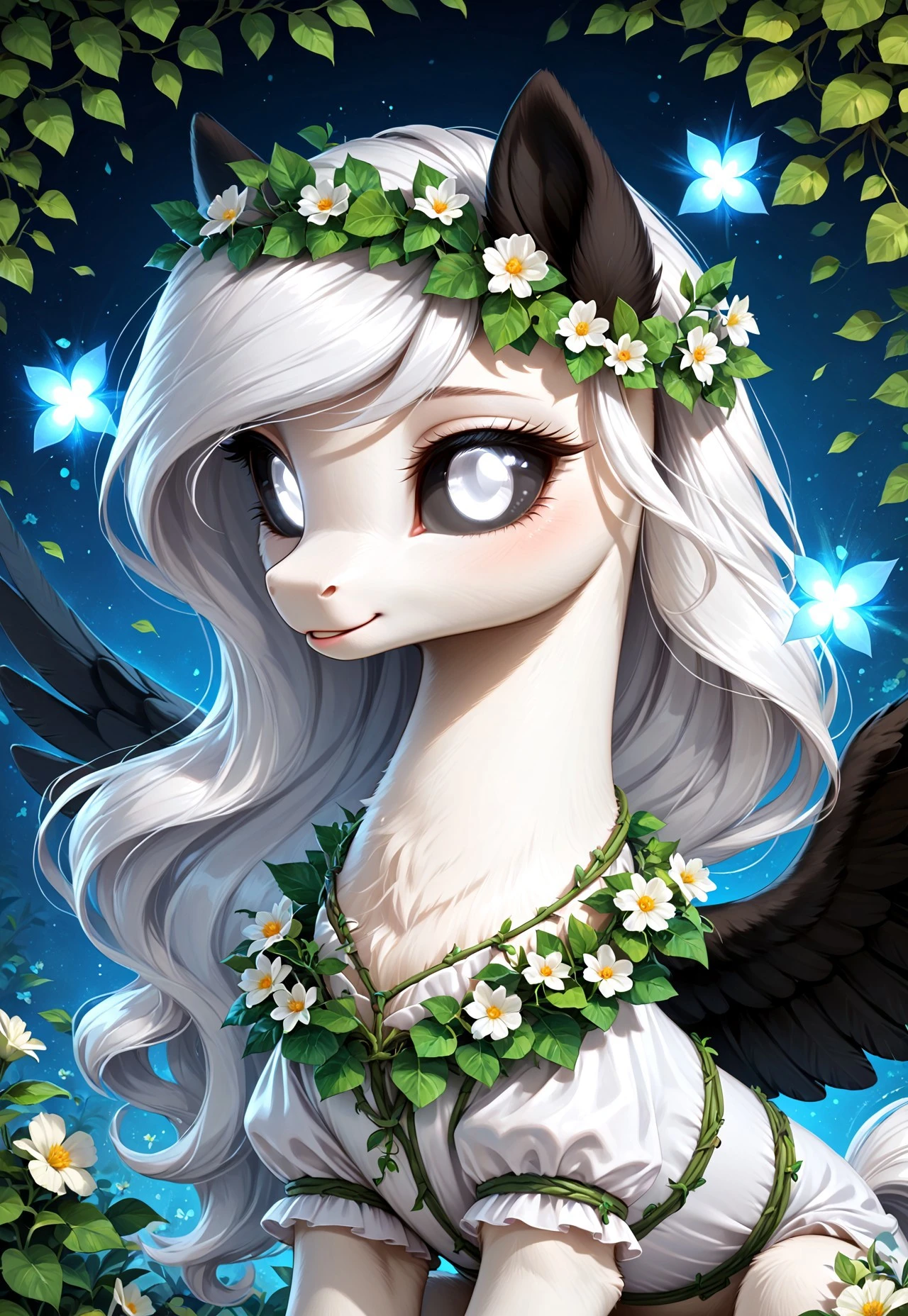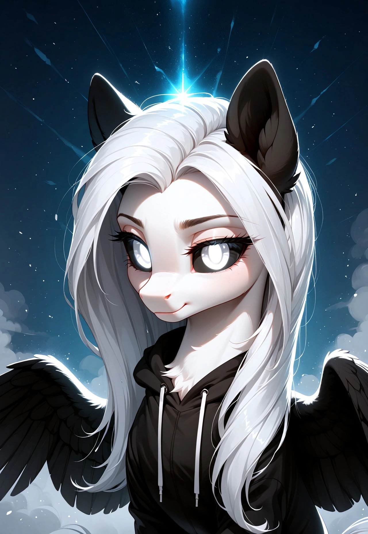 Albina is a unique pegasus from Equestria, whose appearance captivates and mystifies everyone who sees her. With white eyes 👀, black sclera, and snow-white fluffy fur, she stands out among other ponies. Her wings 🕊️, white with black feathers, symbolize the balance between light and darkness.