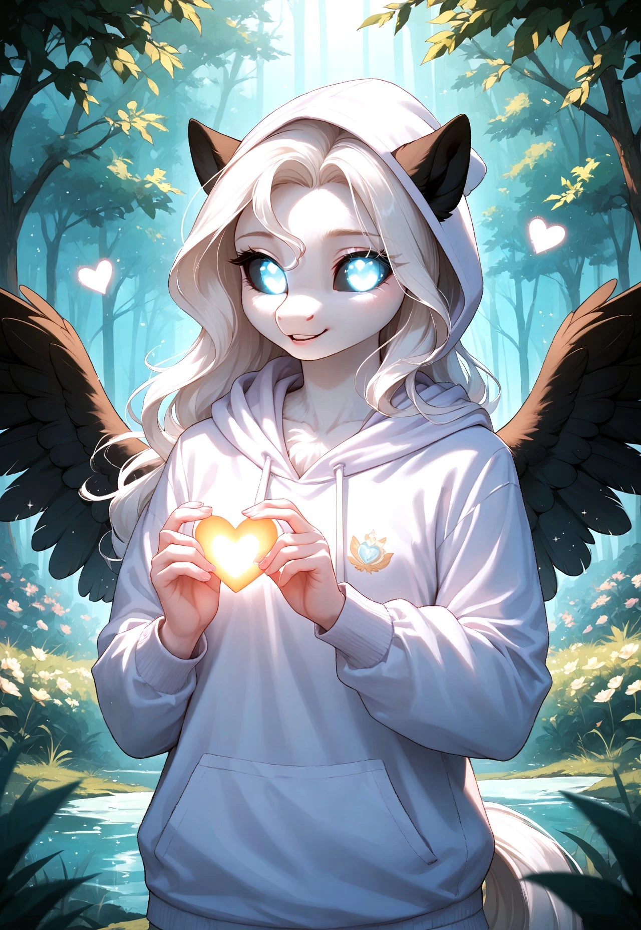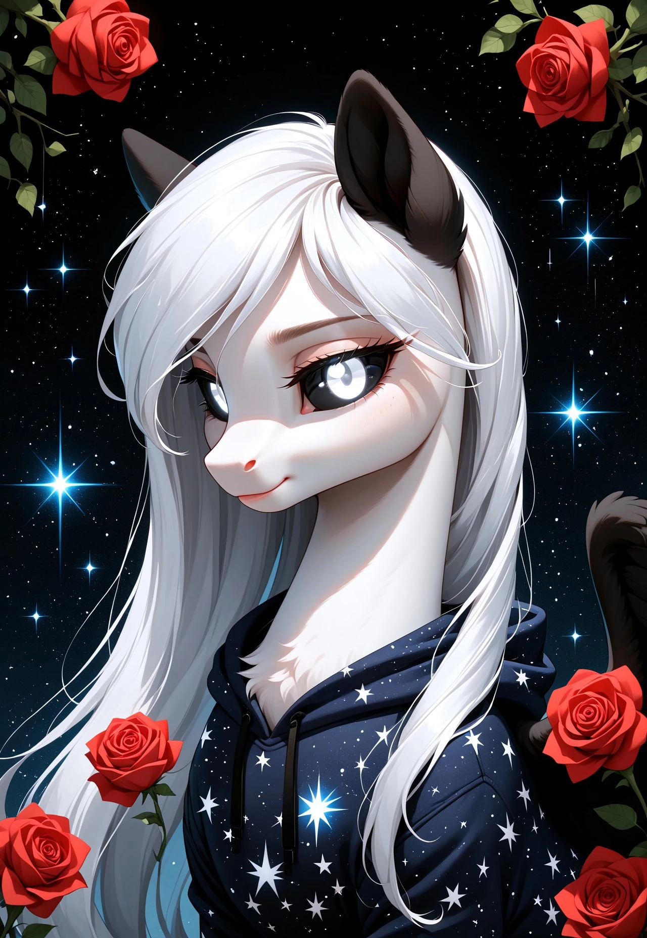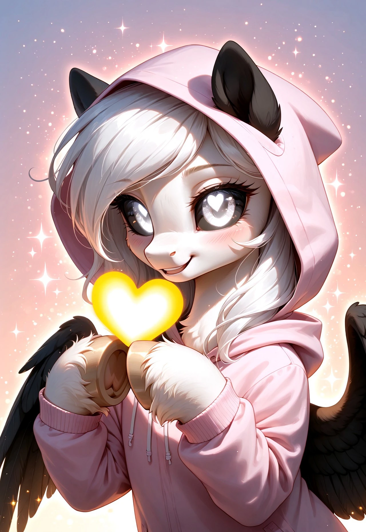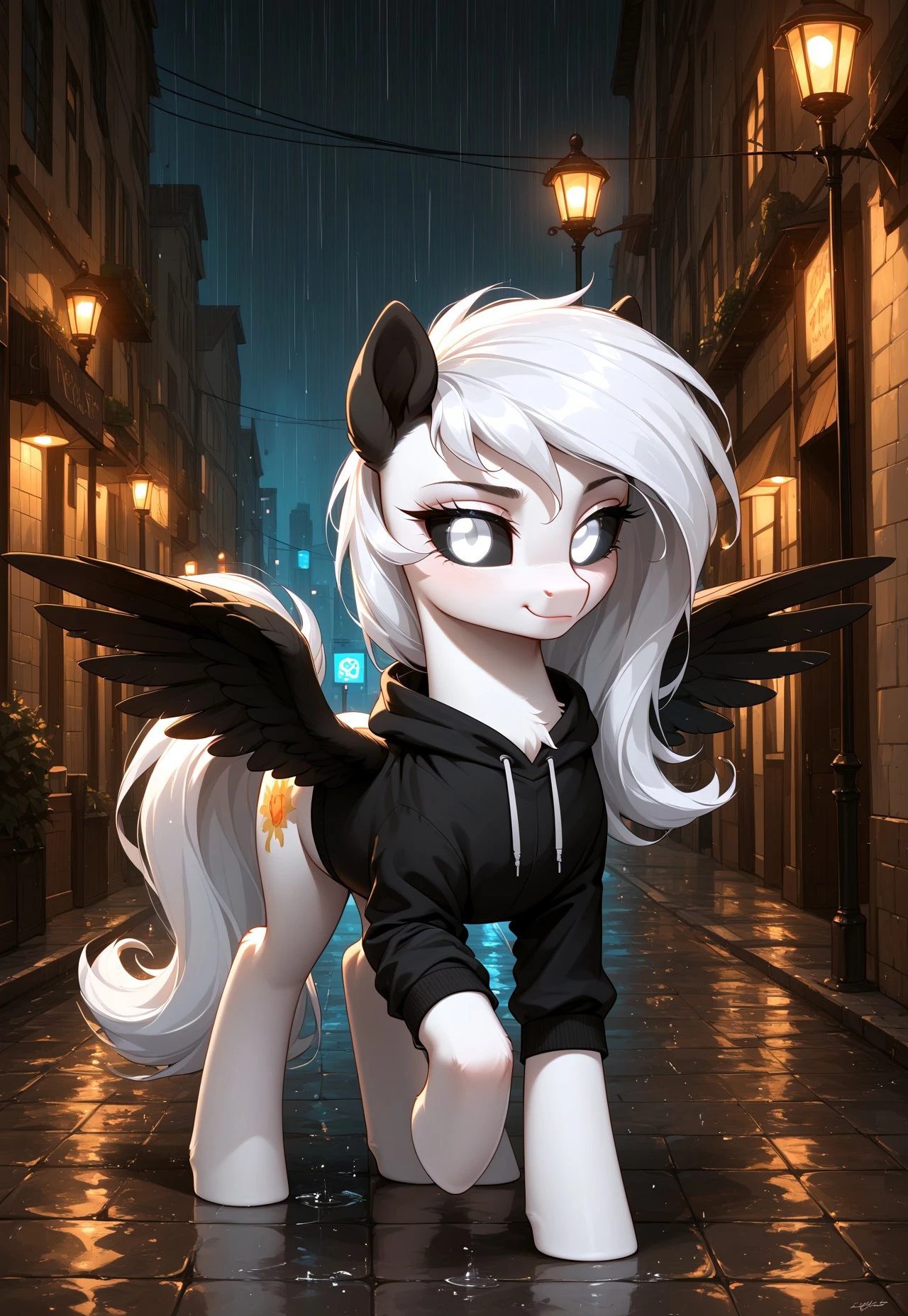 Albina is a unique pegasus from Equestria, whose appearance captivates and mystifies everyone who sees her. With white eyes 👀, black sclera, and snow-white fluffy fur, she stands out among other ponies. Her wings 🕊️, white with black feathers, symbolize the balance between light and darkness.