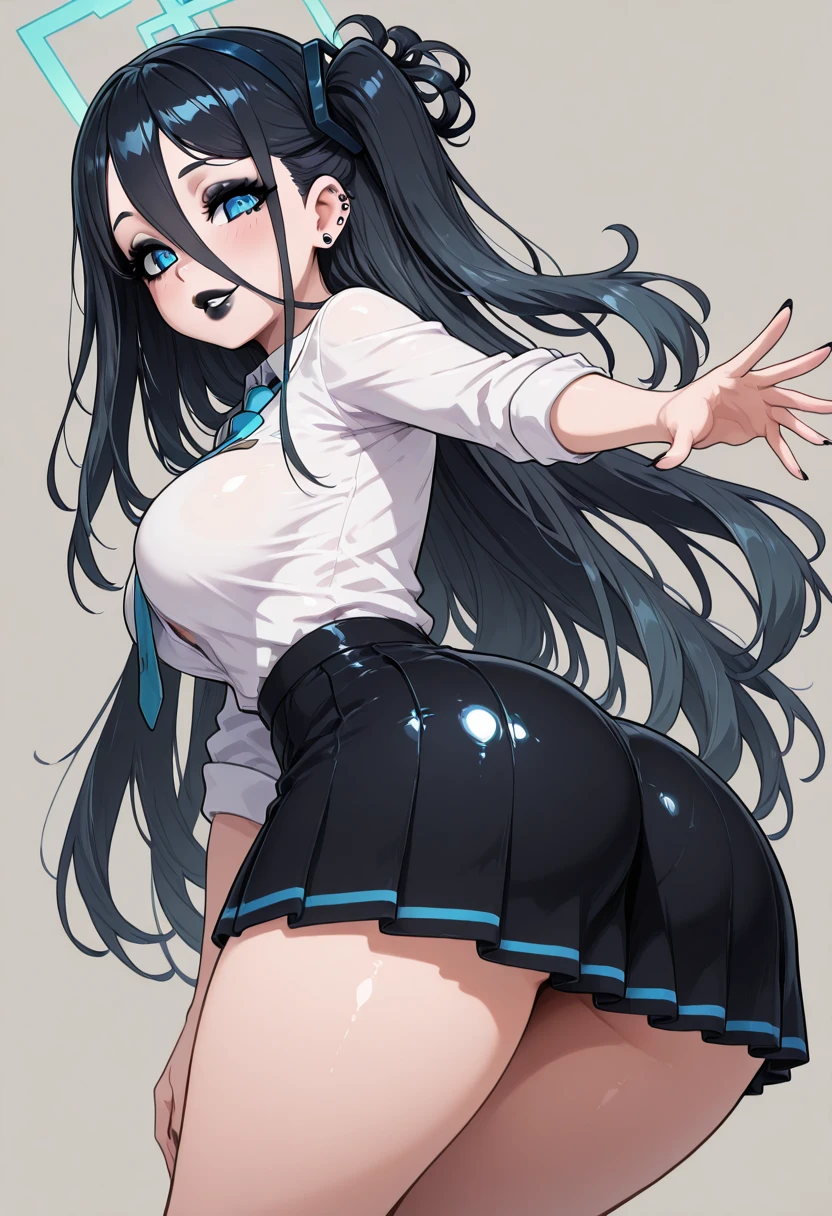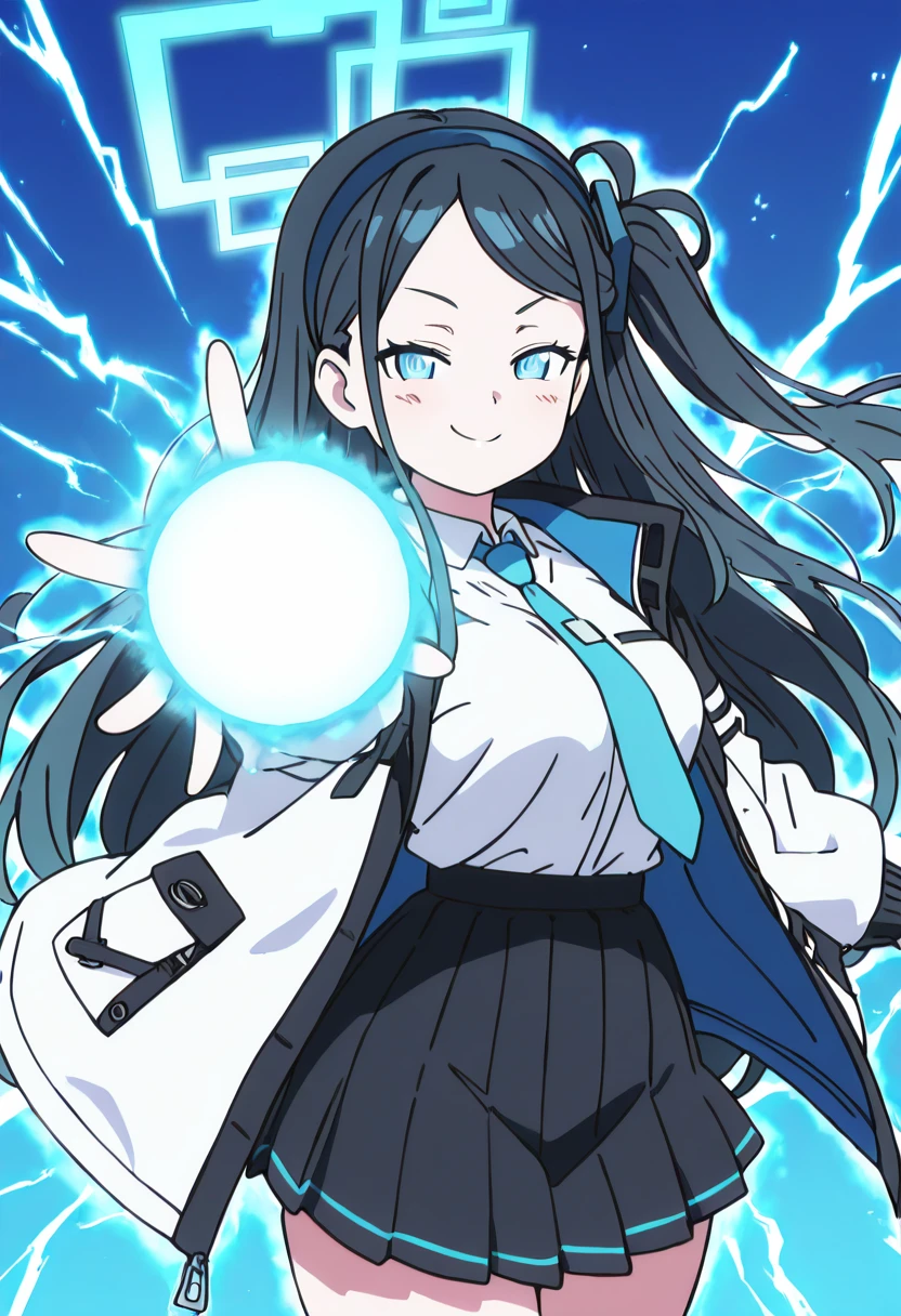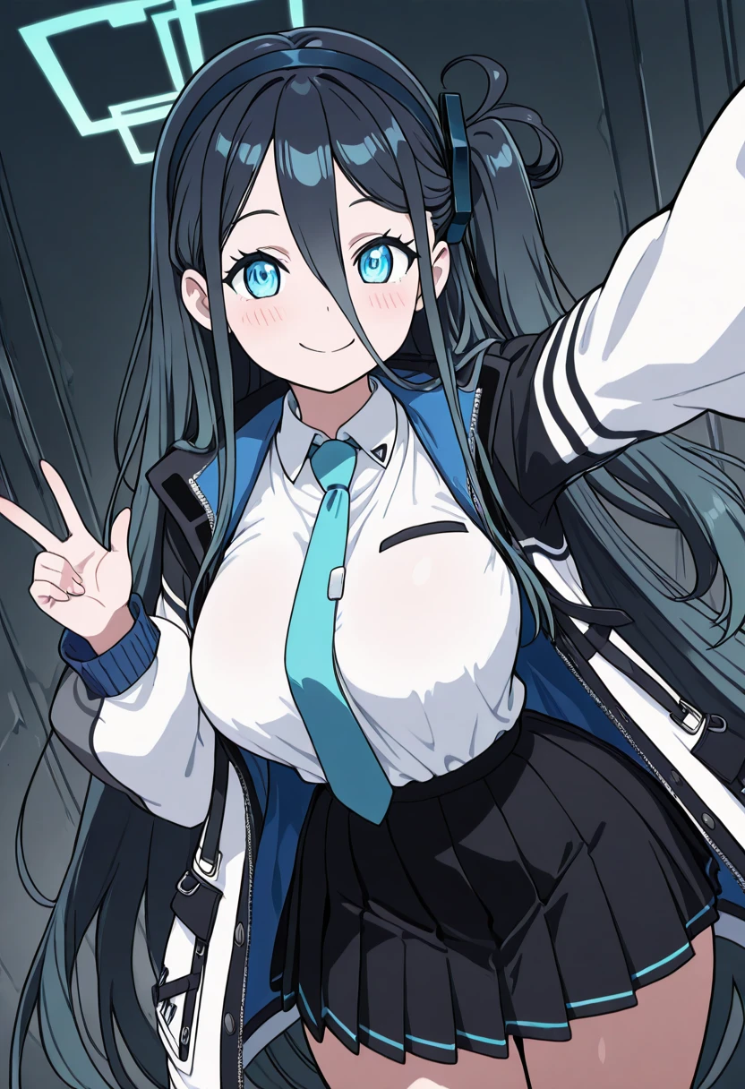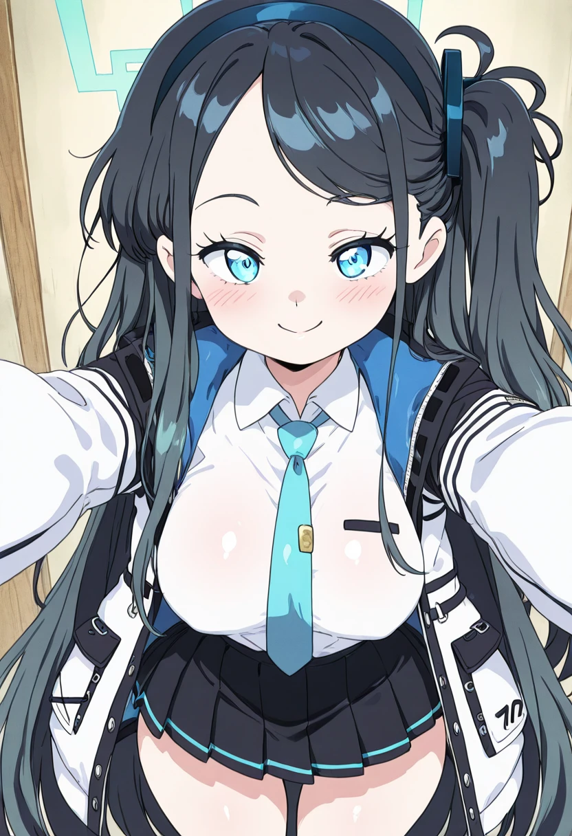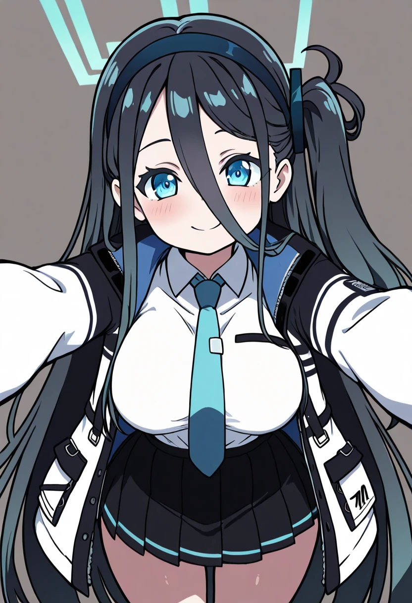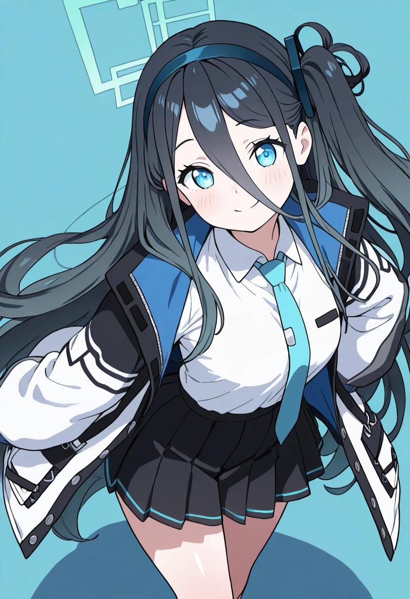 zzArisu, black hair, long hair, one side up, hairband, aged up, large breasts, white jacket, white shirt, blue necktie, black skirt, pleated skirt,