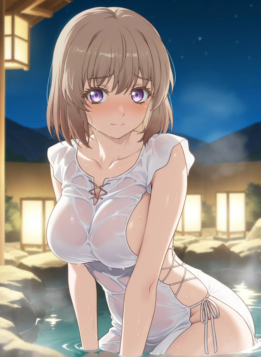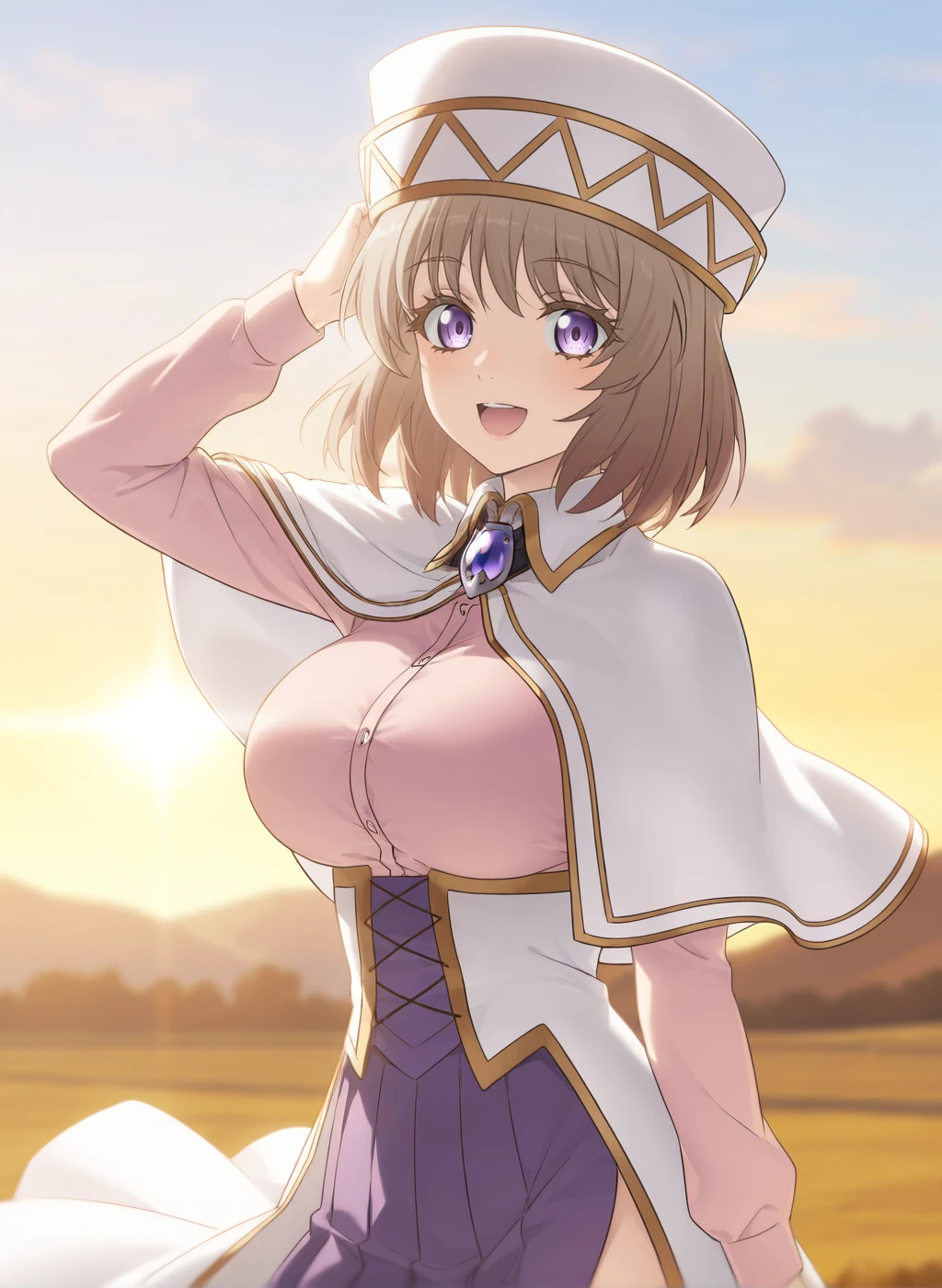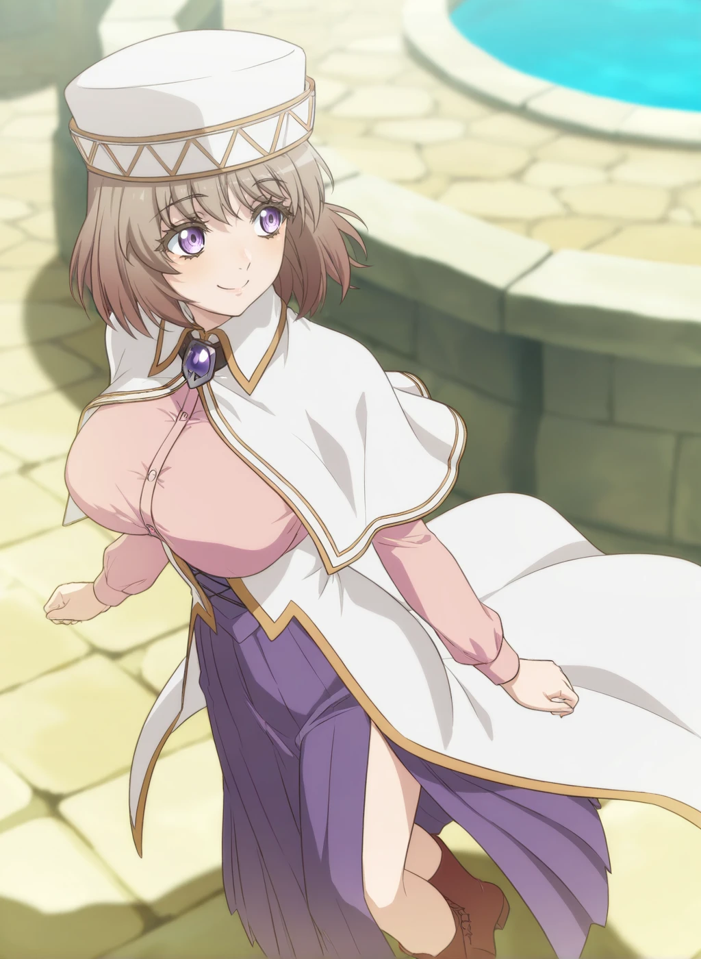 alicia edelsia, isekai ojisan, medium hair, brown hair, purple eyes, large breastsOutfit1: