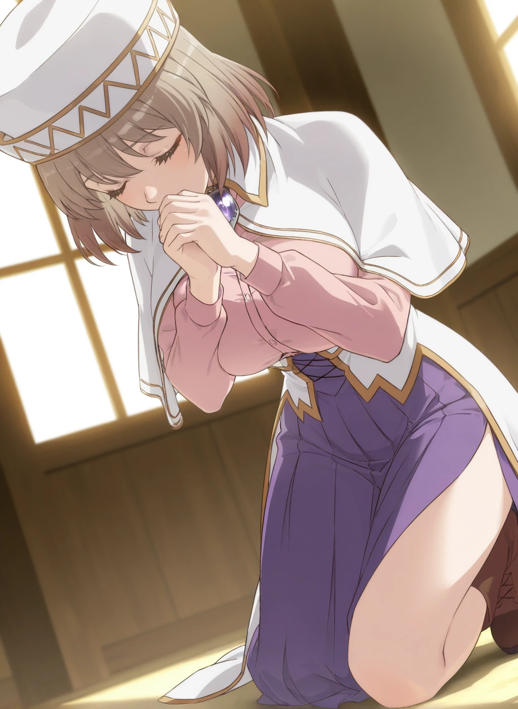white capelet,white headwear,hat,pink shirt,purple skirt,pleated skirt,long skirt,white overskirt,side slit