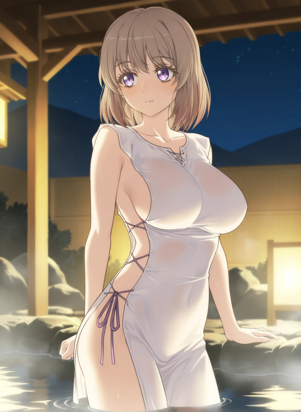 white dress, collarbone,side cutout, sleeveless,sideless outfit,cross-laced slit Description