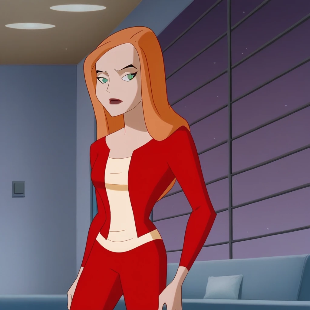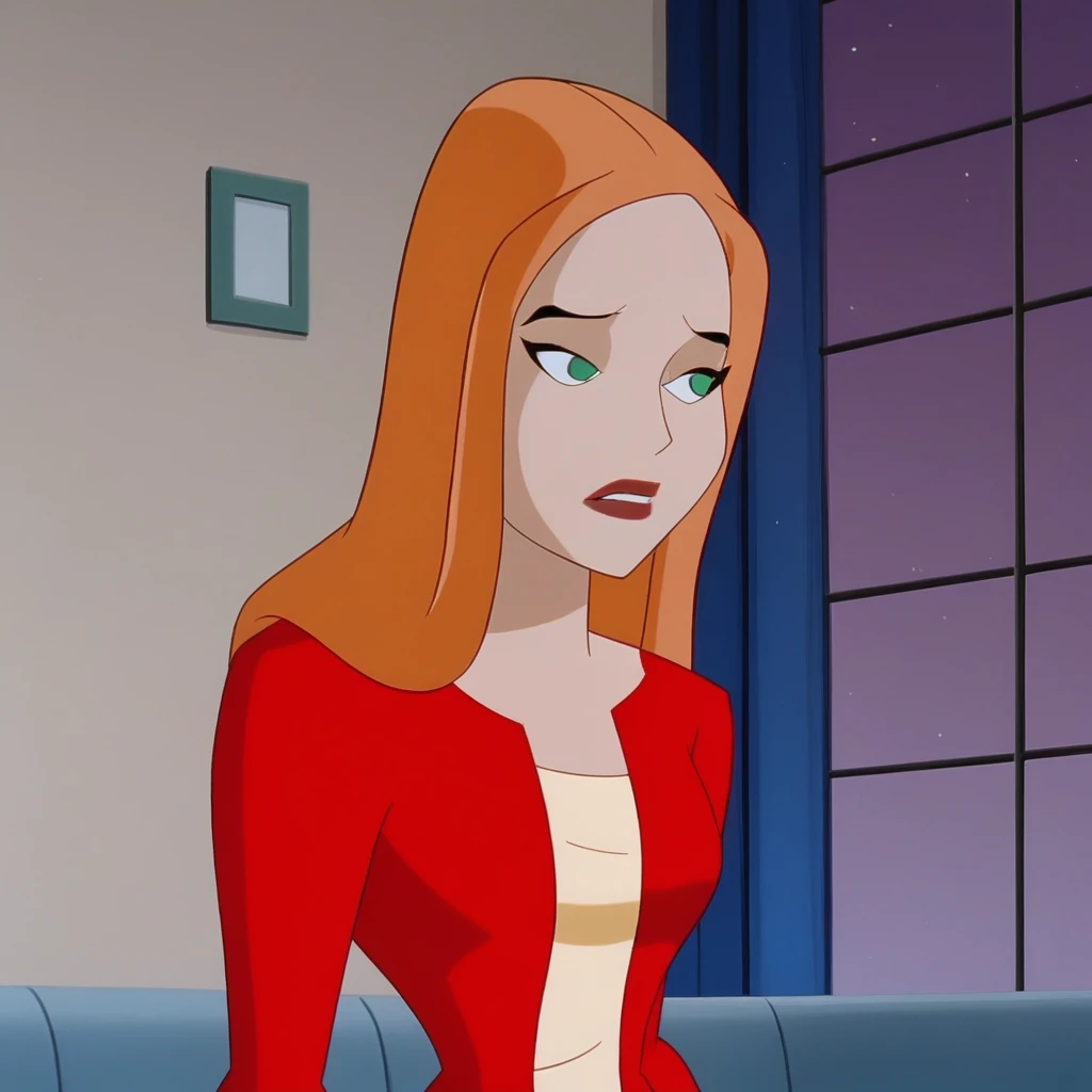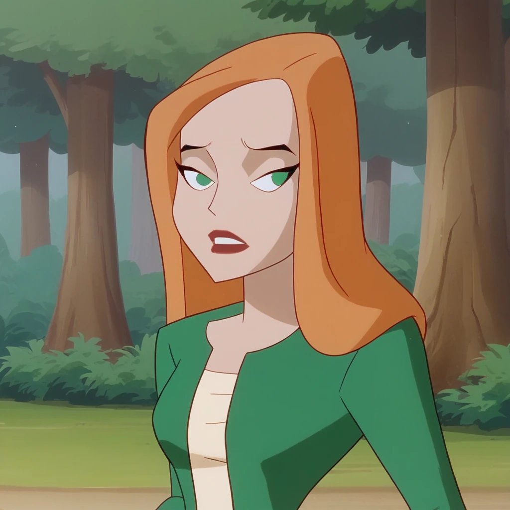 jackiewallace, 1girl, solo, orange hair, long hair, green eyes, lipstick,
