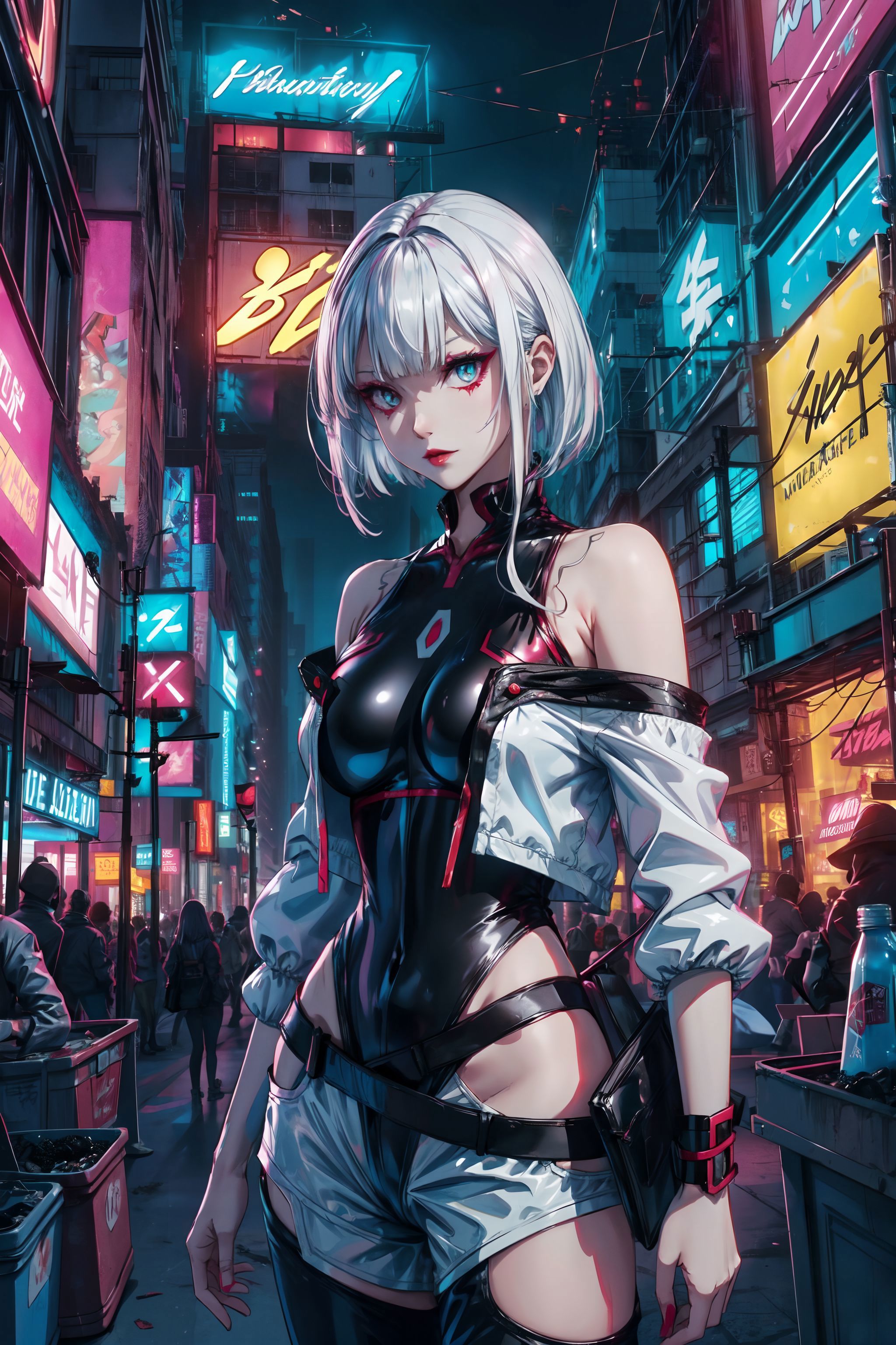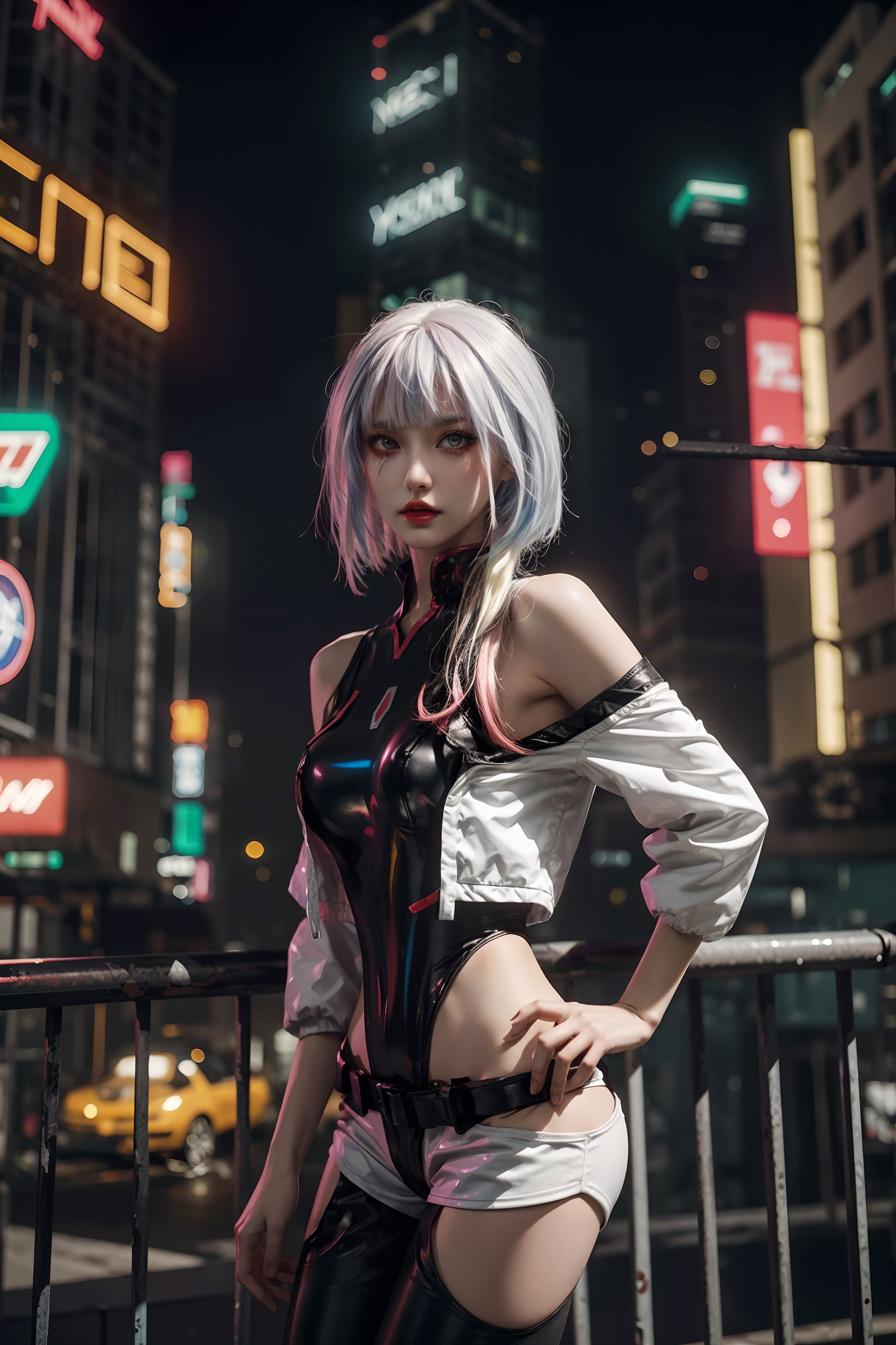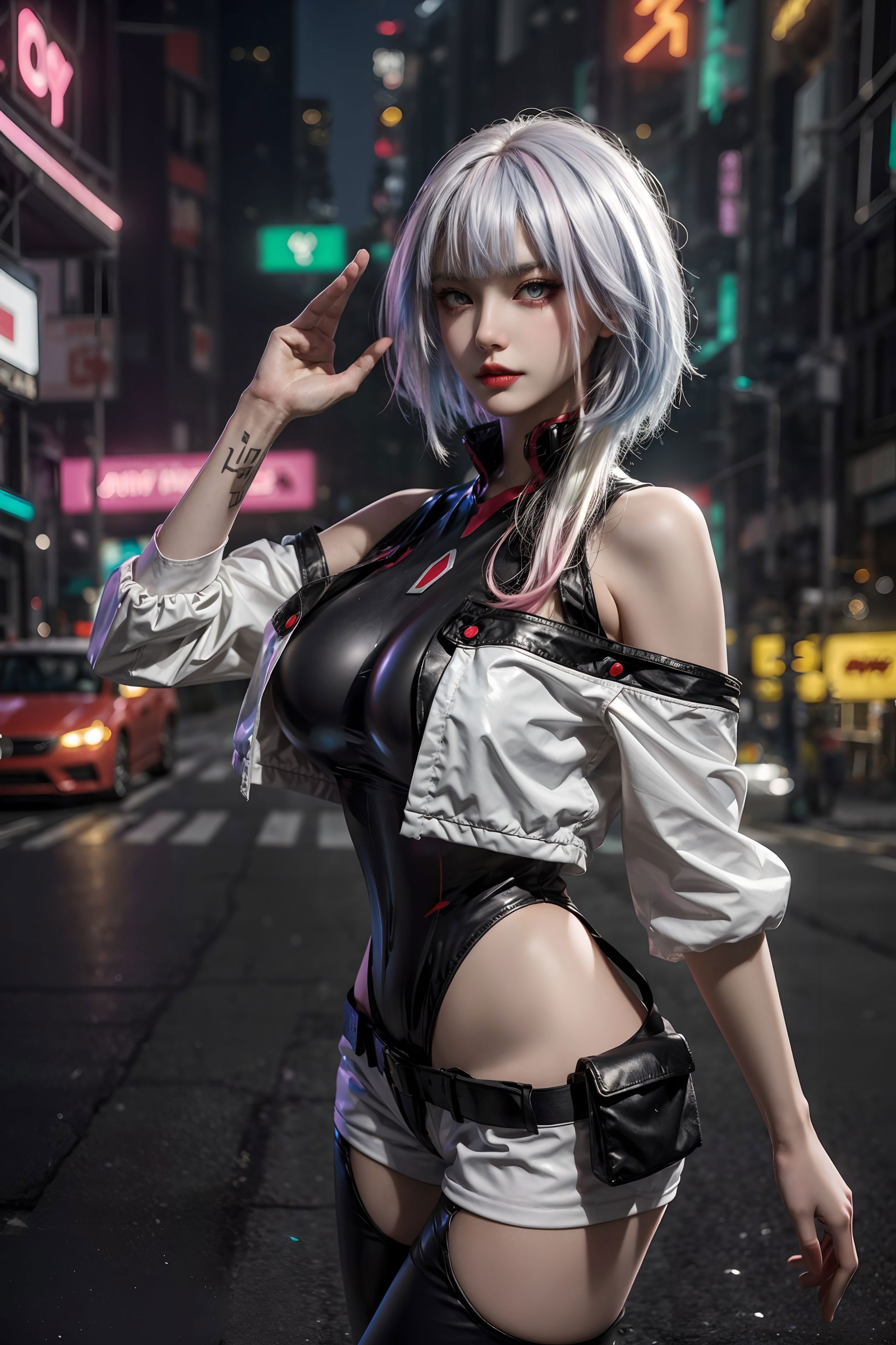 Trigger Words: lucy_cyberpunk, cowboy shot, 1 sweet girl,white short hair, bangs, ((red eyeliner)), ((makeup)),red lips, white off-shouler jacket, black bodysuit, bare shoulders, white shorts, hip vent, black thighhighs, black boots(Use it when generate full-body img)