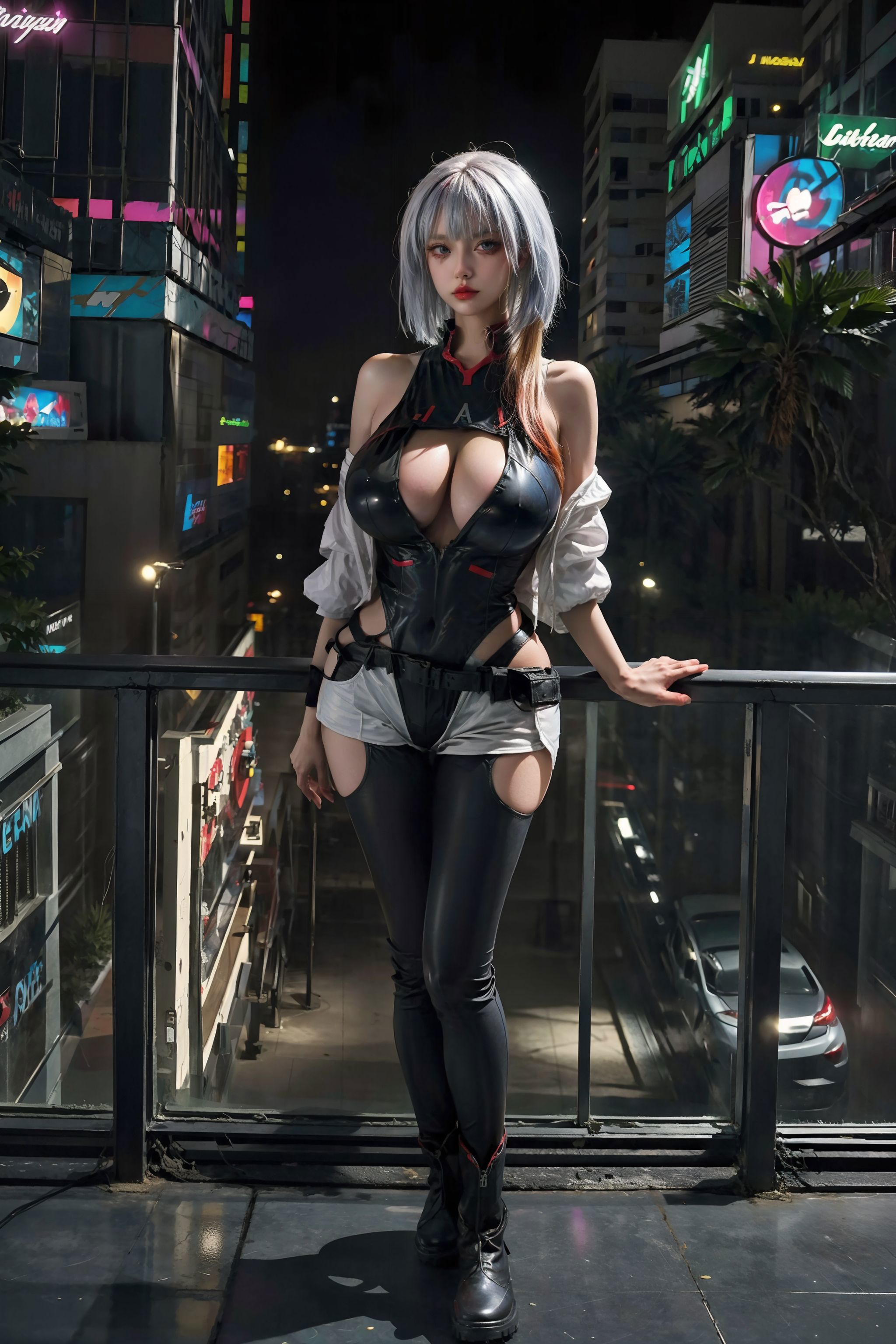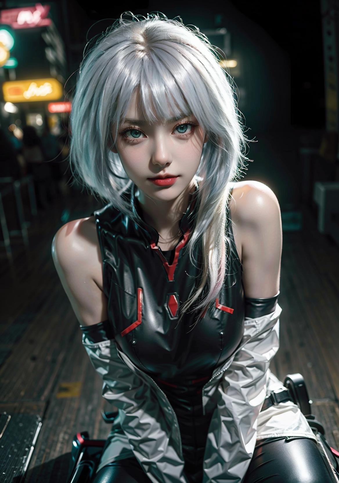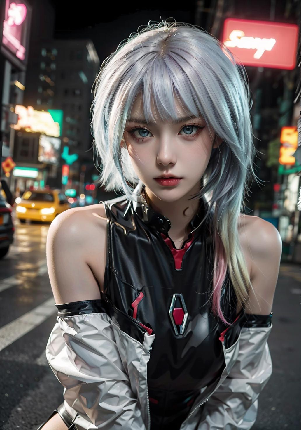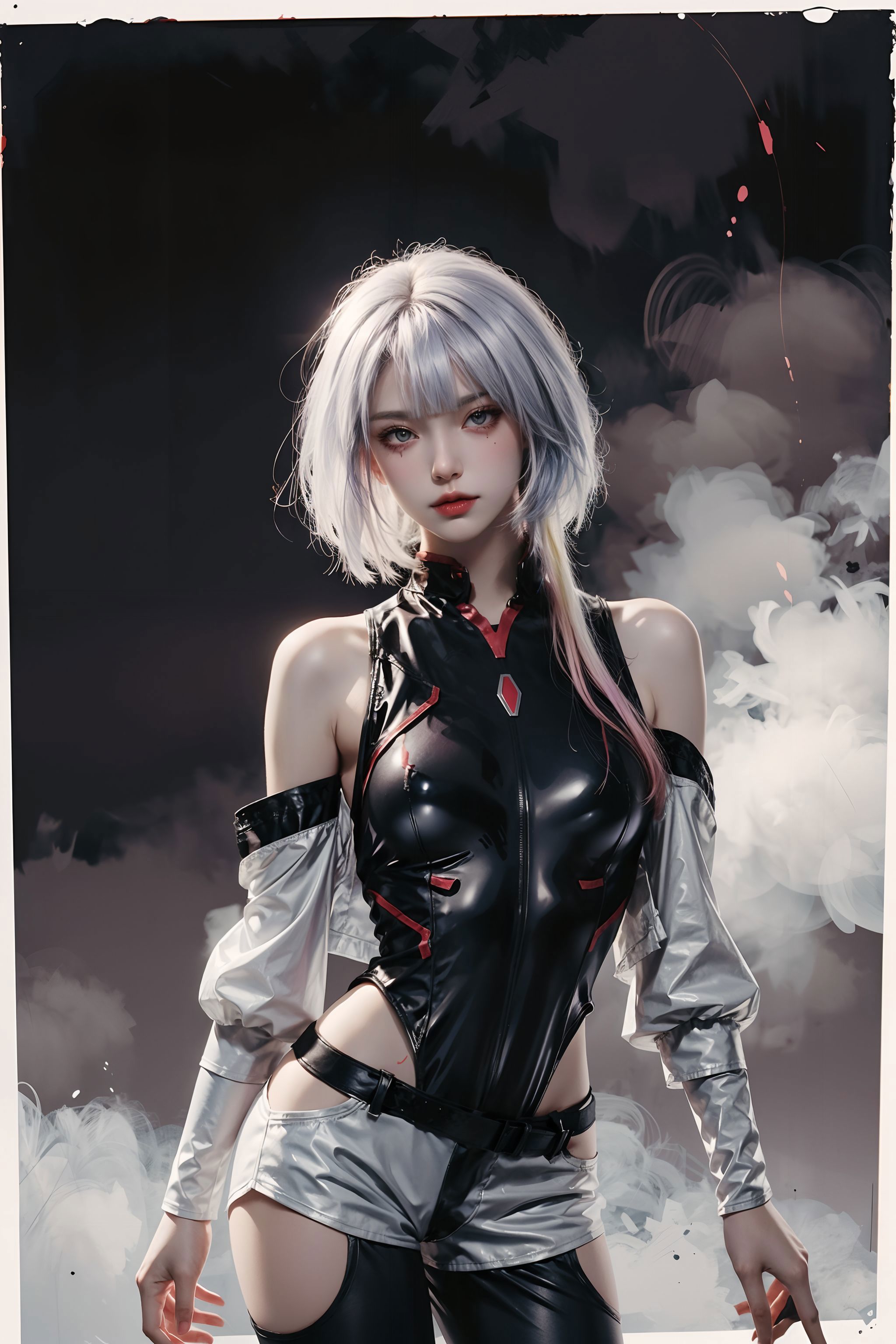 Trigger Words: lucy_cyberpunk, cowboy shot, 1 sweet girl,white short hair, bangs, ((red eyeliner)), ((makeup)),red lips, white off-shouler jacket, black bodysuit, bare shoulders, white shorts, hip vent, black thighhighs, black boots(Use it when generate full-body img)