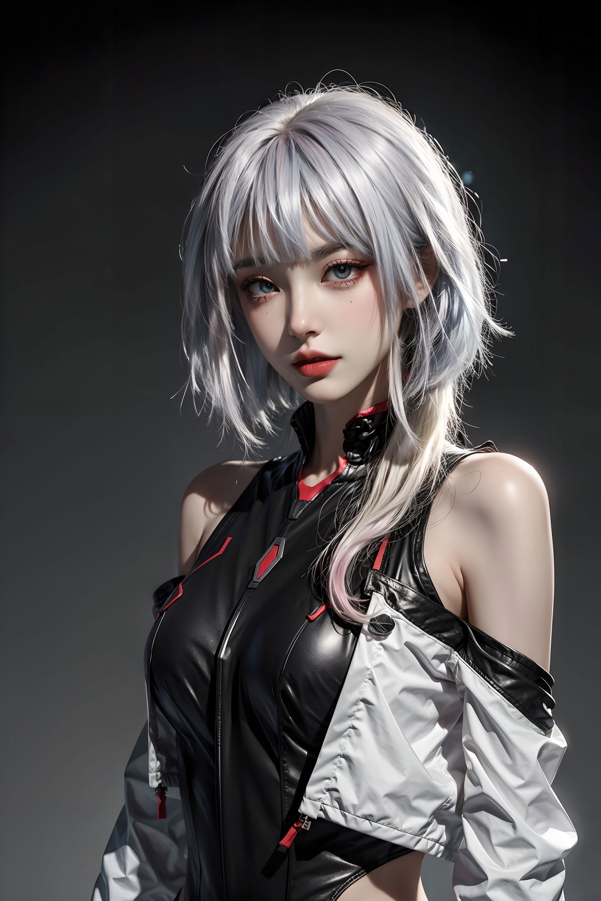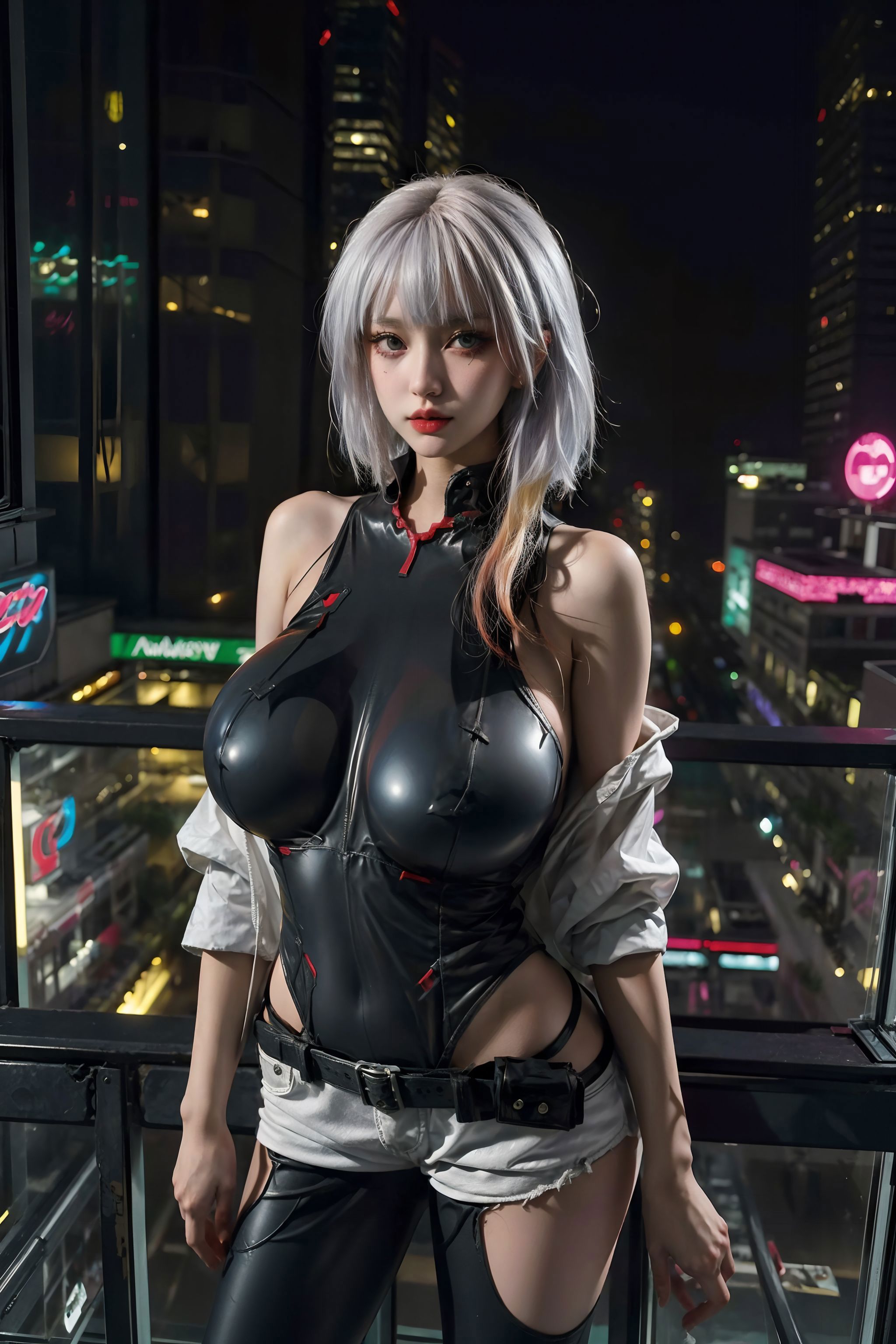 关键词: lucy_cyberpunk, cowboy shot, 1 sweet girl,white short hair, bangs, ((red eyeliner)), ((makeup)),red lips, white off-shouler jacket, black bodysuit, bare shoulders, white shorts, hip vent, black thighhighs, black boots(全身图的时候用)