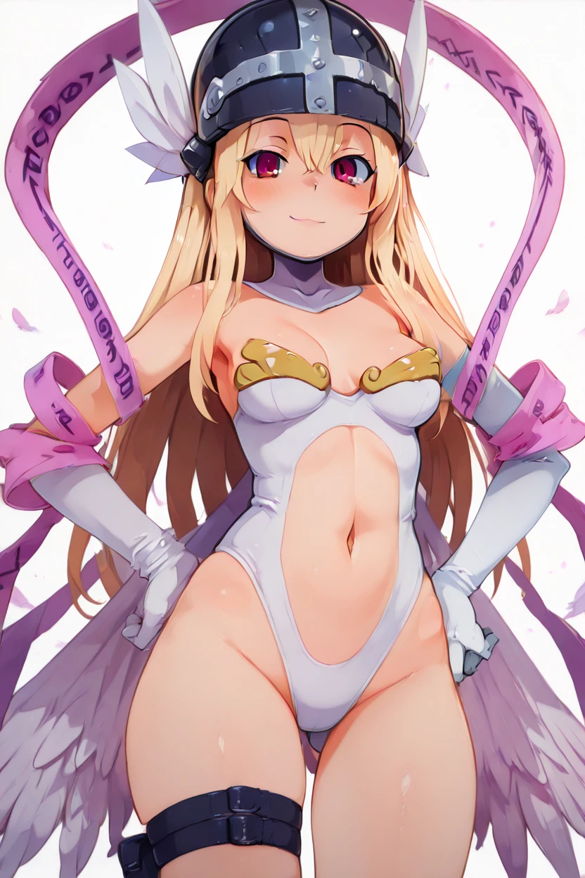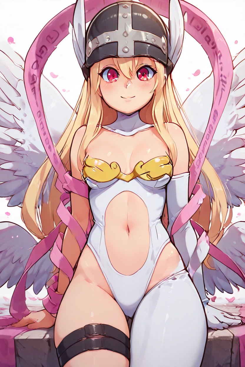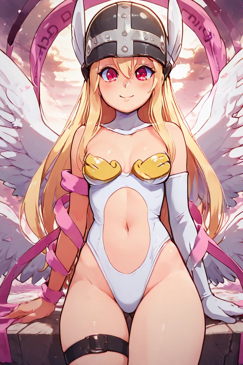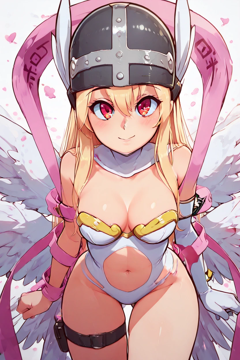 zzAngegirlmonCitronOC, long hair, blonde hair, red eyes, helmet, angel wings, bare shoulders, elbow gloves, feathered wings, gloves, head wings, navel, pink ribbon, ribbon, single elbow glove, single glove, thigh strap,