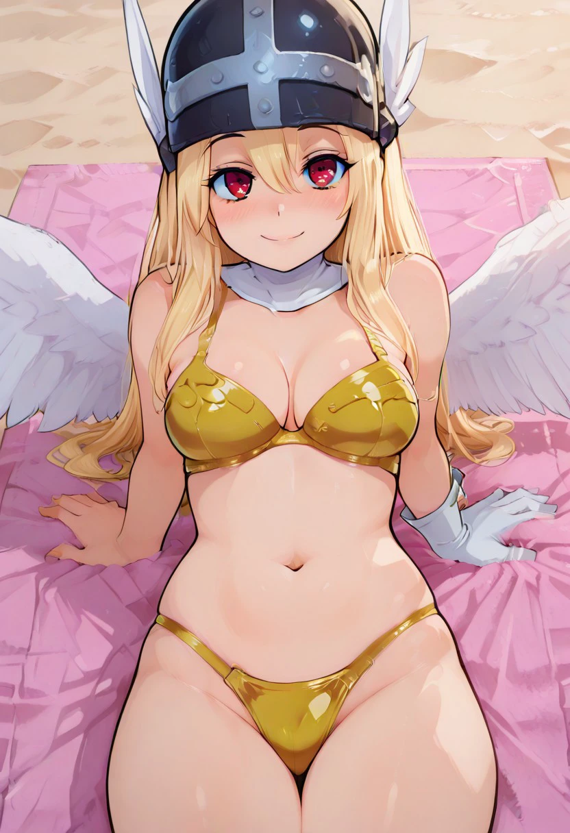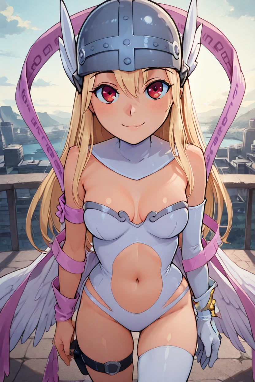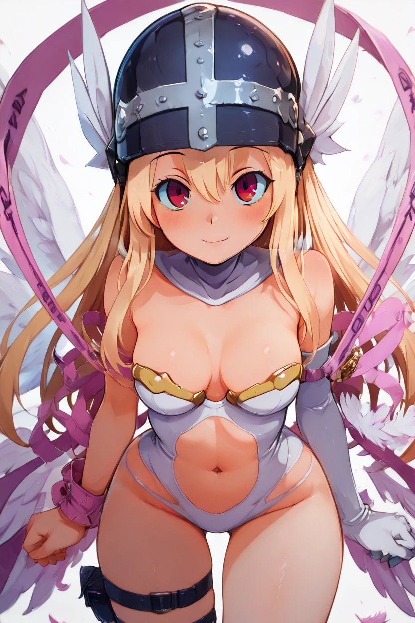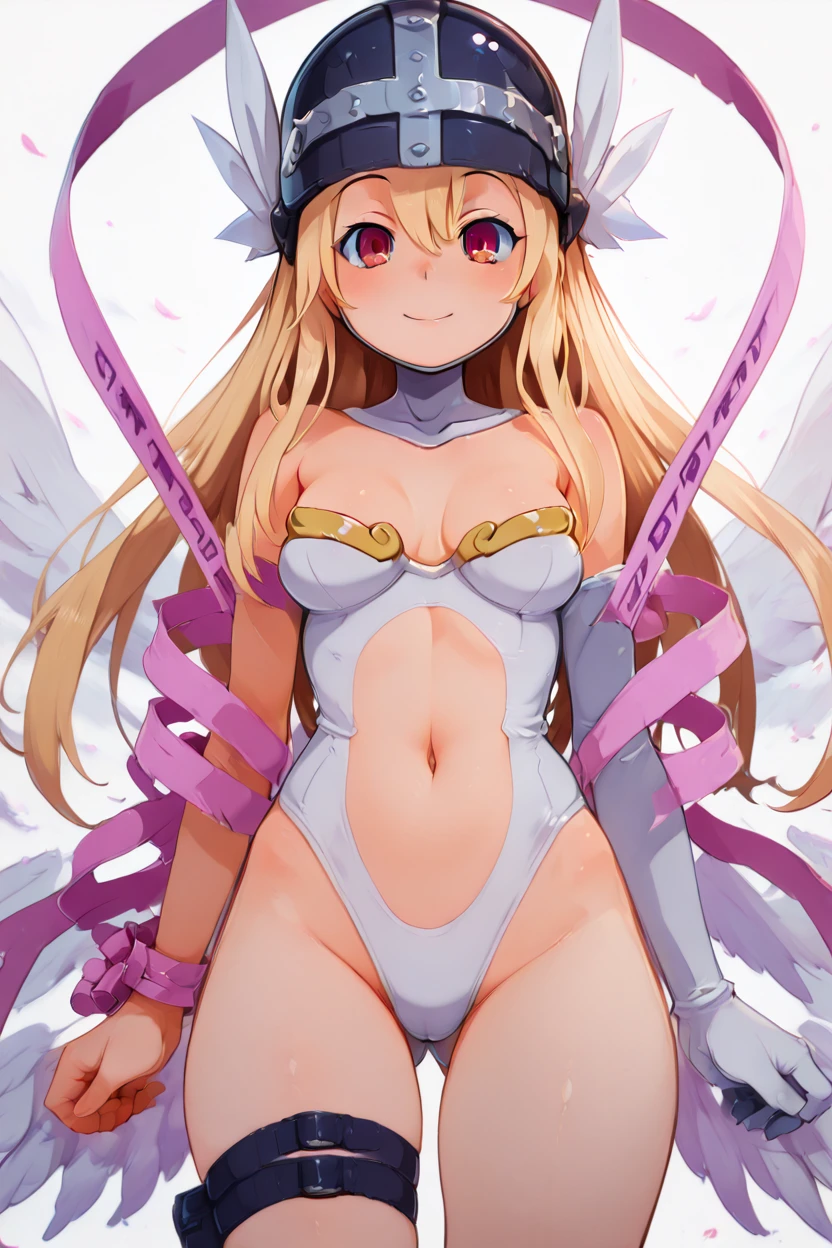 zzAngegirlmonCitronOC, long hair, blonde hair, red eyes, helmet, angel wings, bare shoulders, elbow gloves, feathered wings, gloves, head wings, navel, pink ribbon, ribbon, single elbow glove, single glove, thigh strap,
