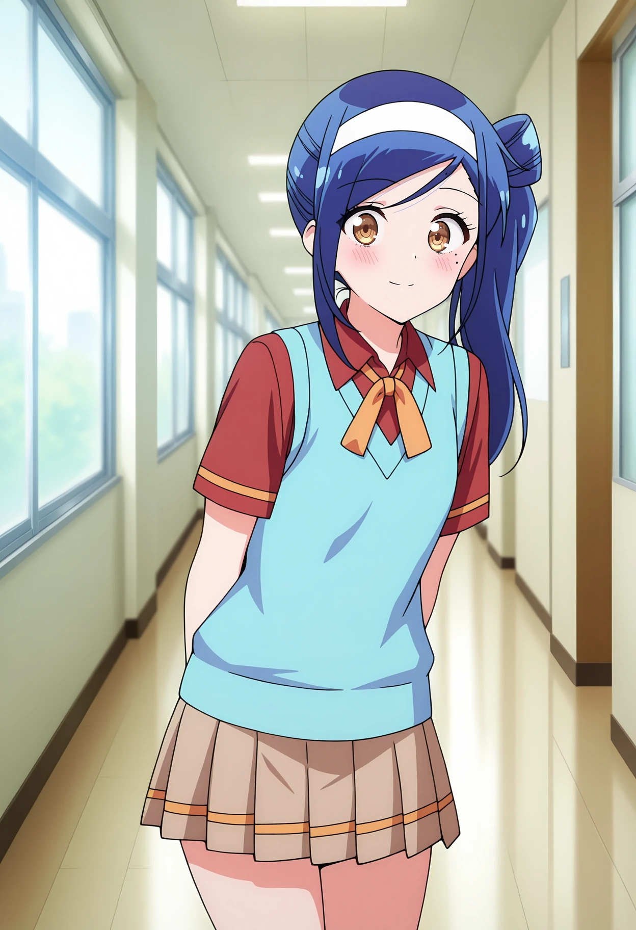 blue sweater vest, collared shirt, red shirt, neck ribbon, orange ribbon, short sleeves, pleated skirt, miniskirt, brown skirt