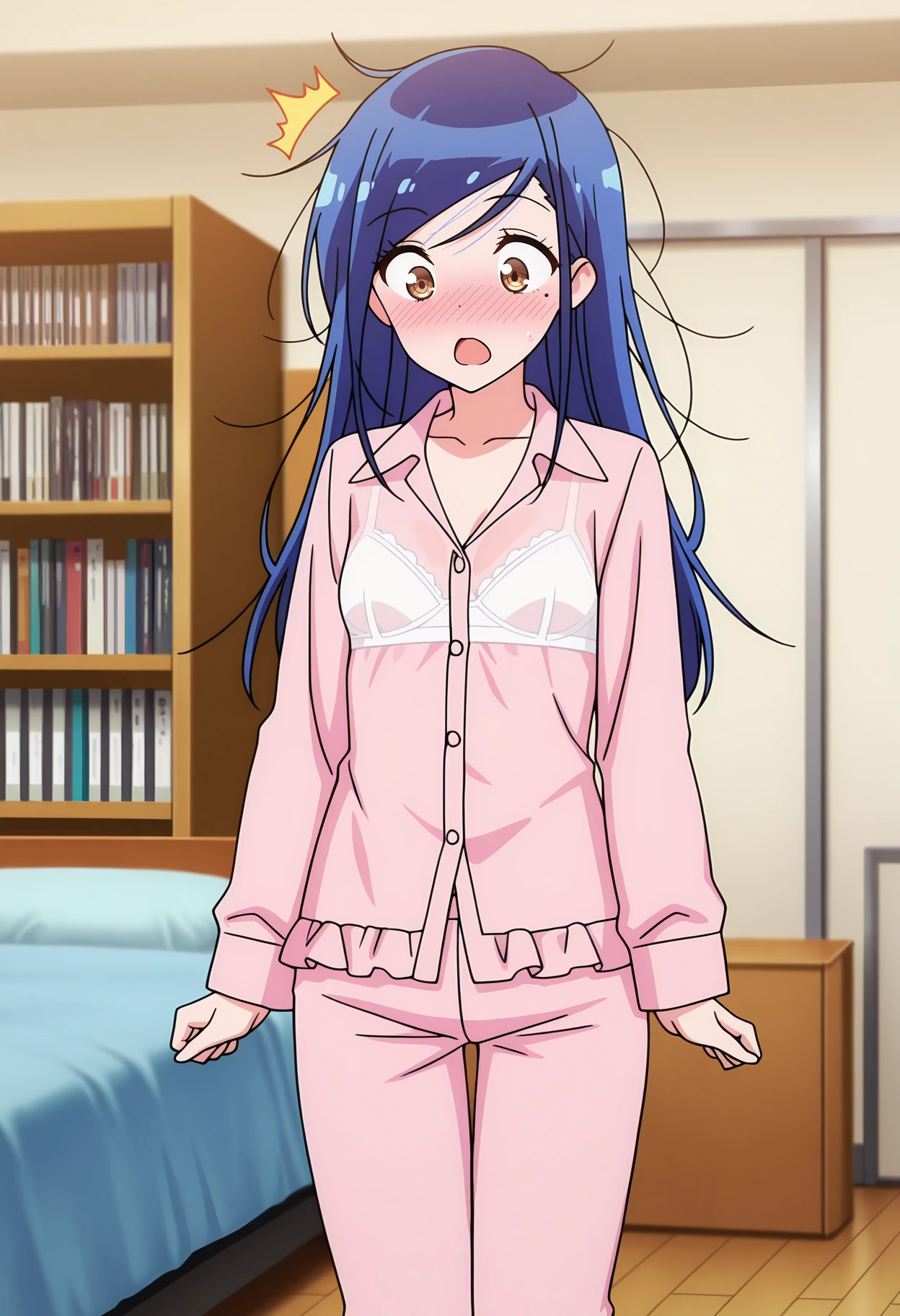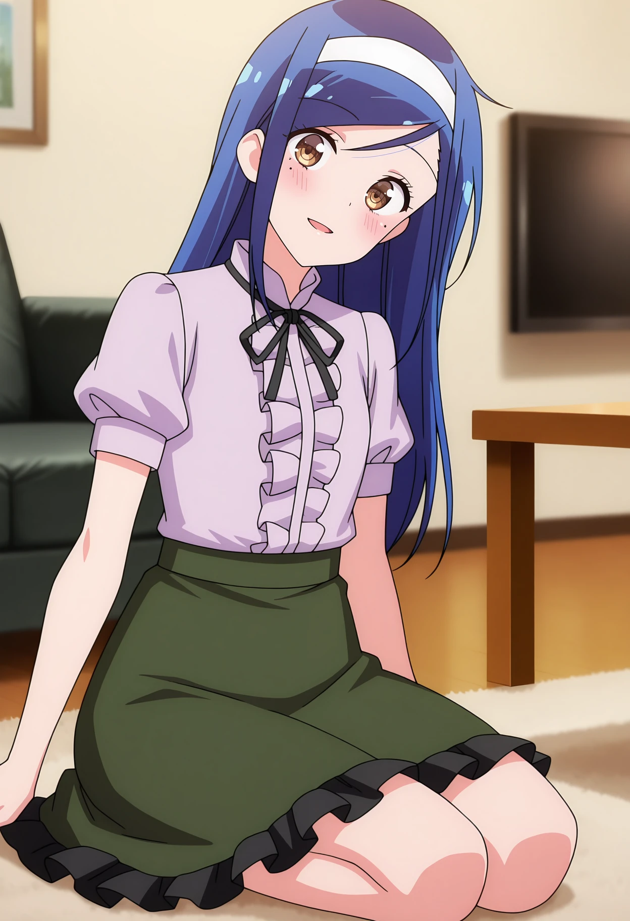 swept bangs, long hair, blue hair, brown eyes, mole under eye, white hairband