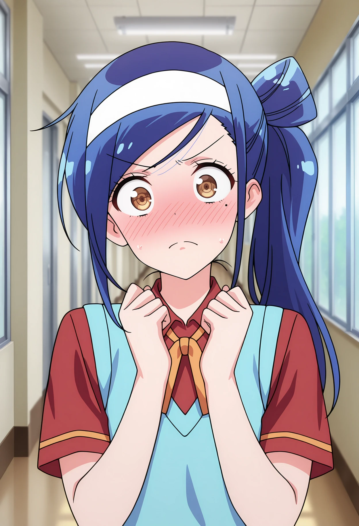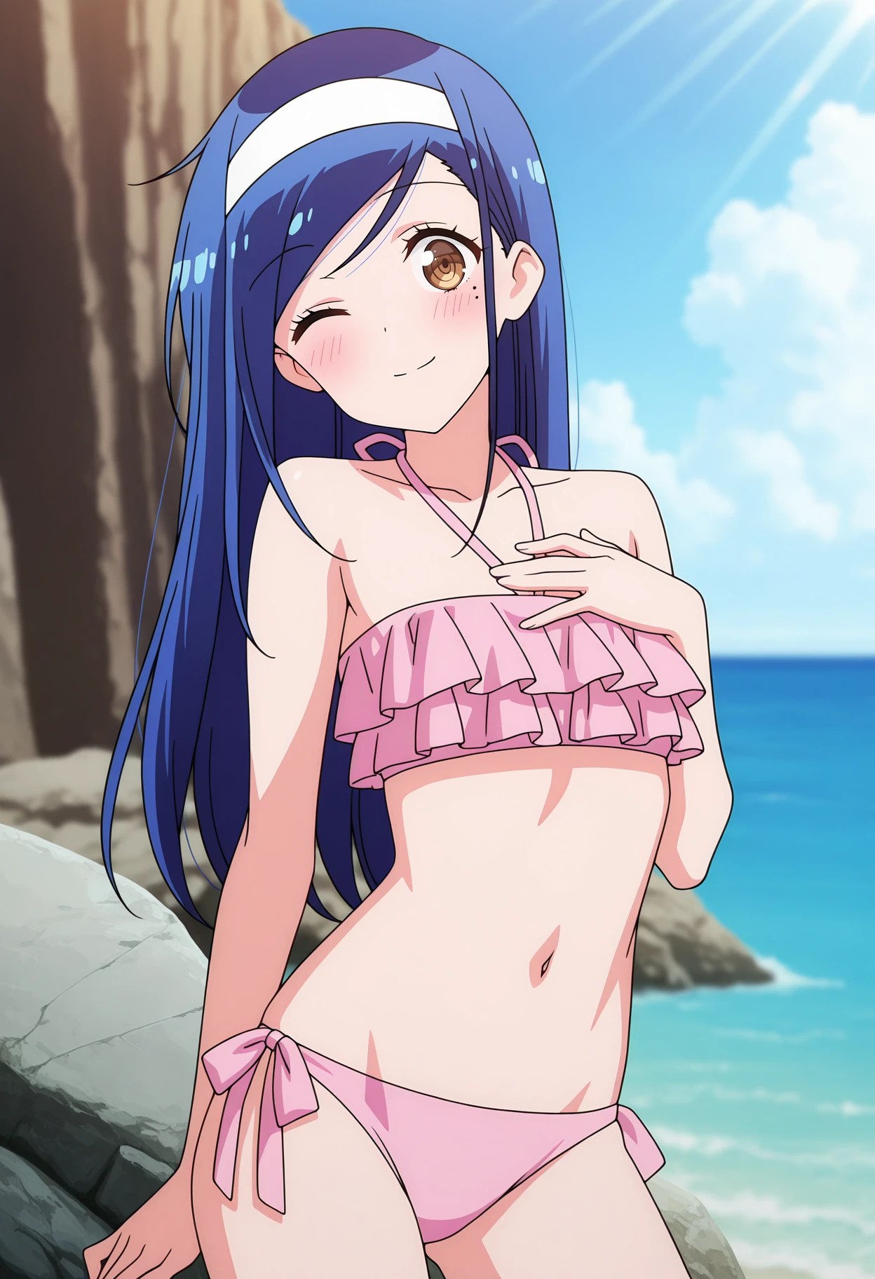 side ponytail, swept bangs, long hair, blue hair, brown eyes, mole under eye, white hairband