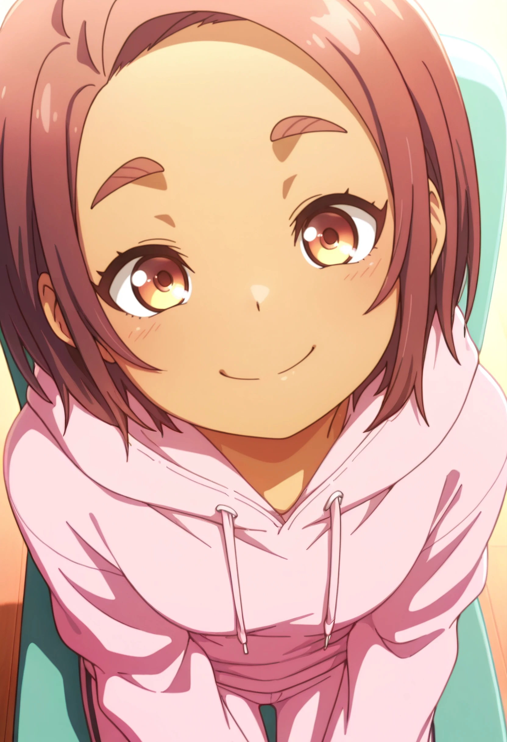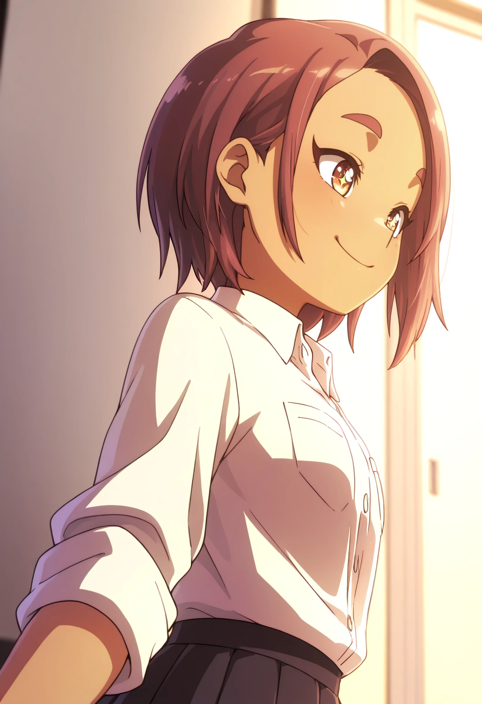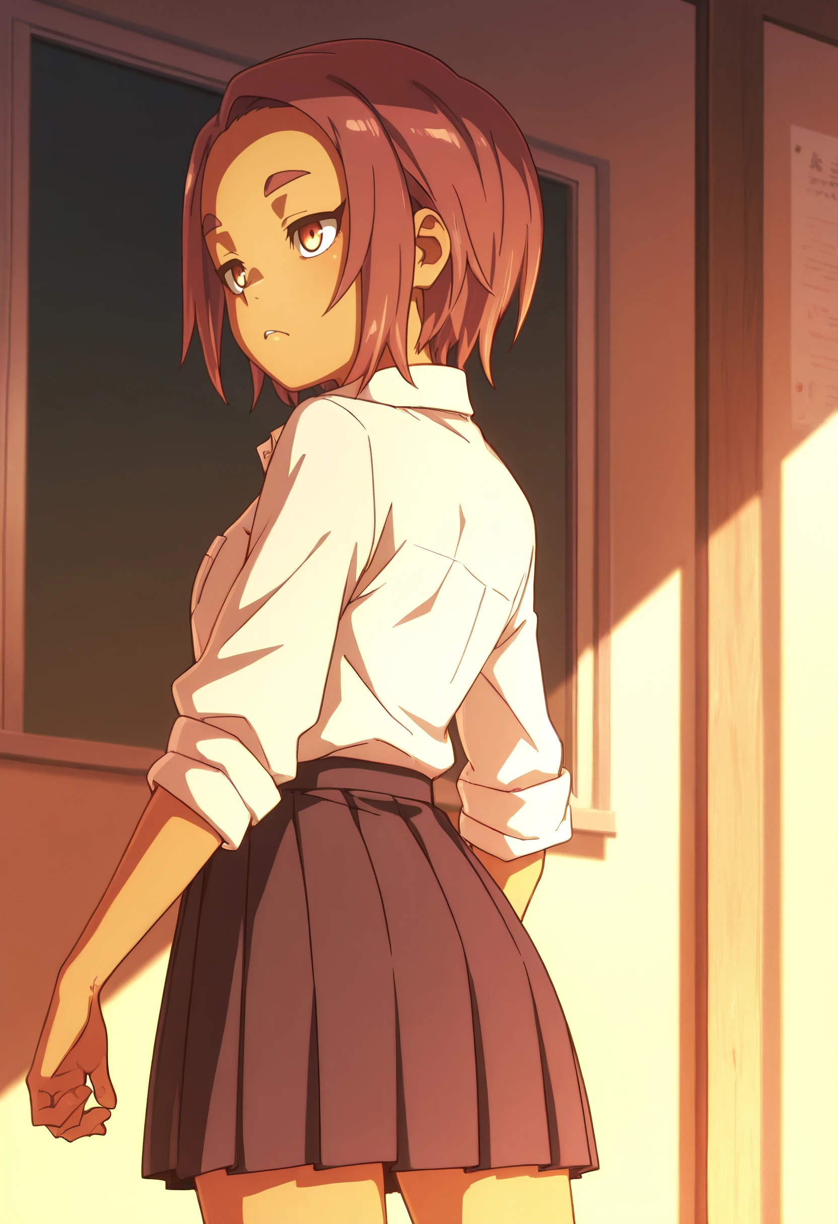 OkiYae, short hair, brown eyes, brown hair, thick eyebrows, forehead, short eyebrows,