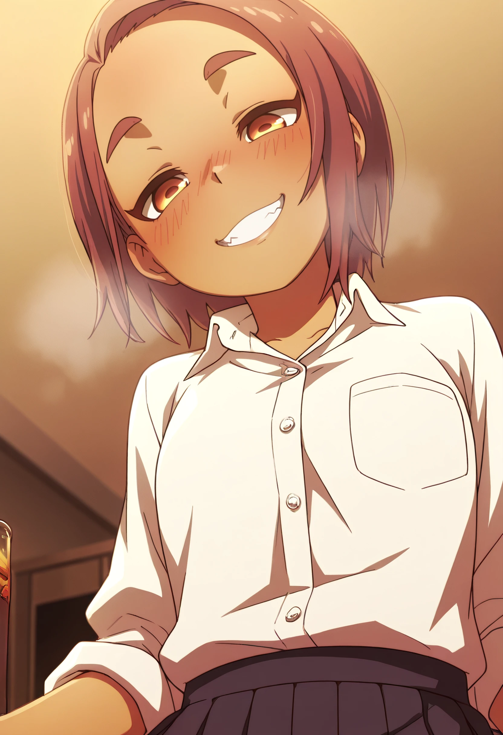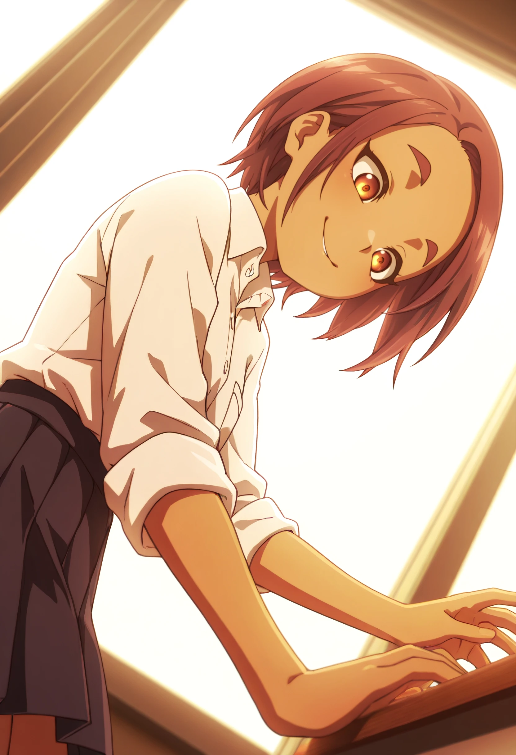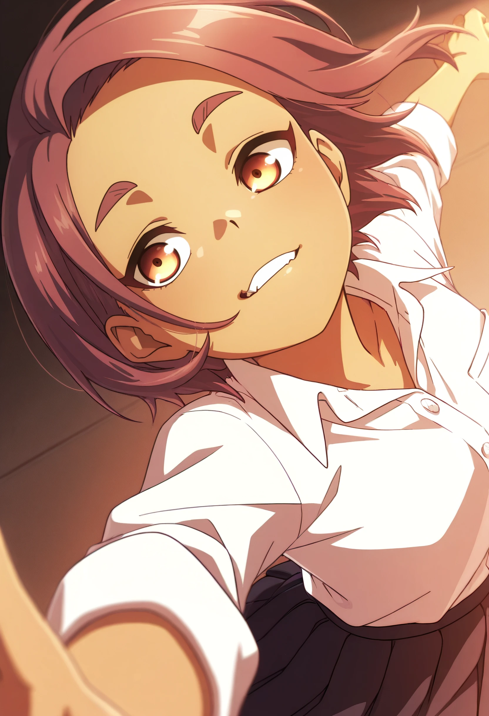 OkiYae, short hair, brown eyes, brown hair, thick eyebrows, forehead, short eyebrows,