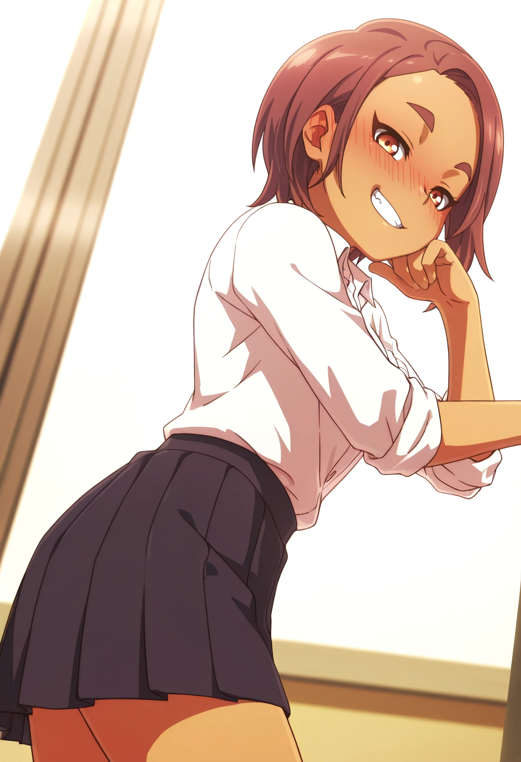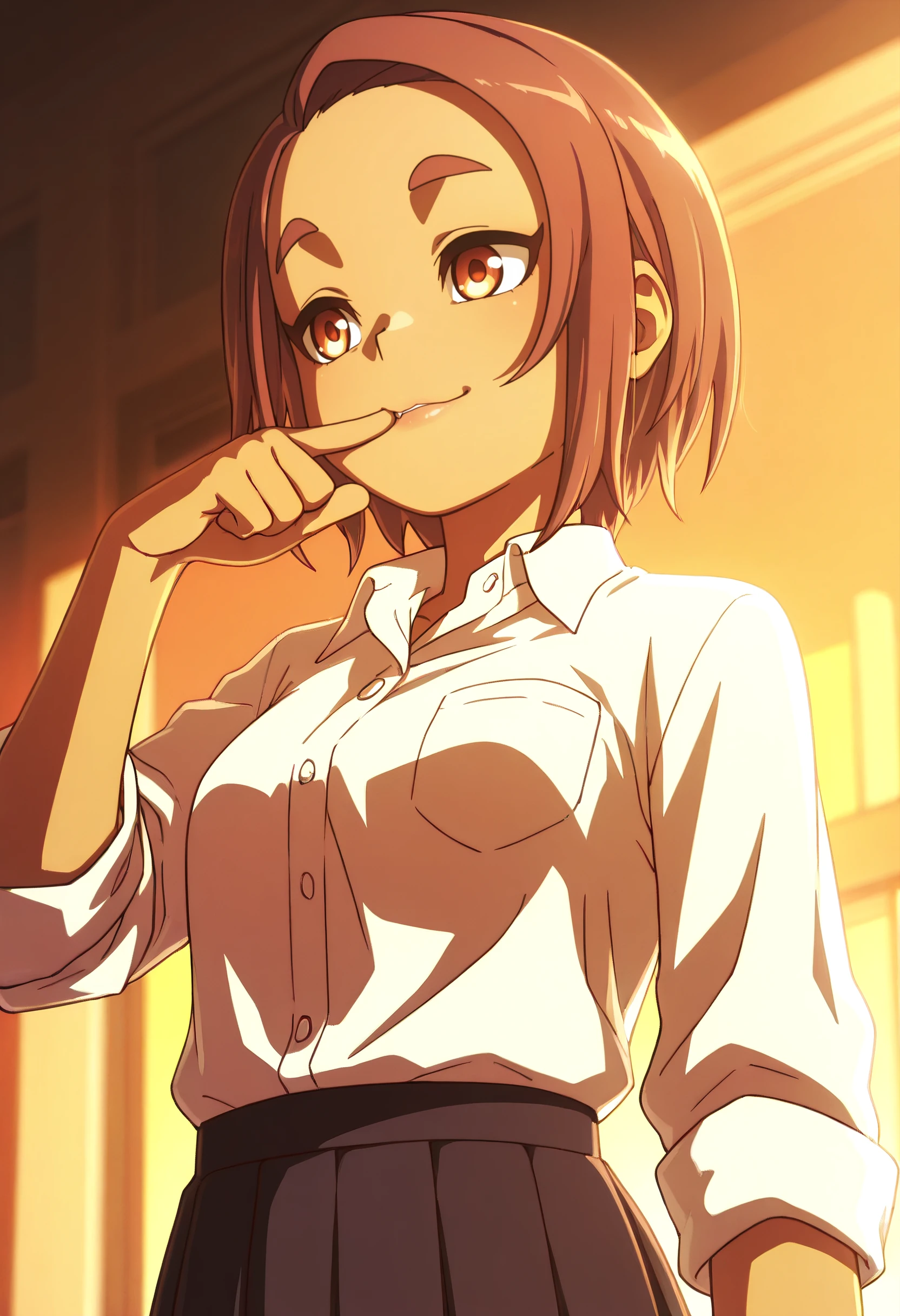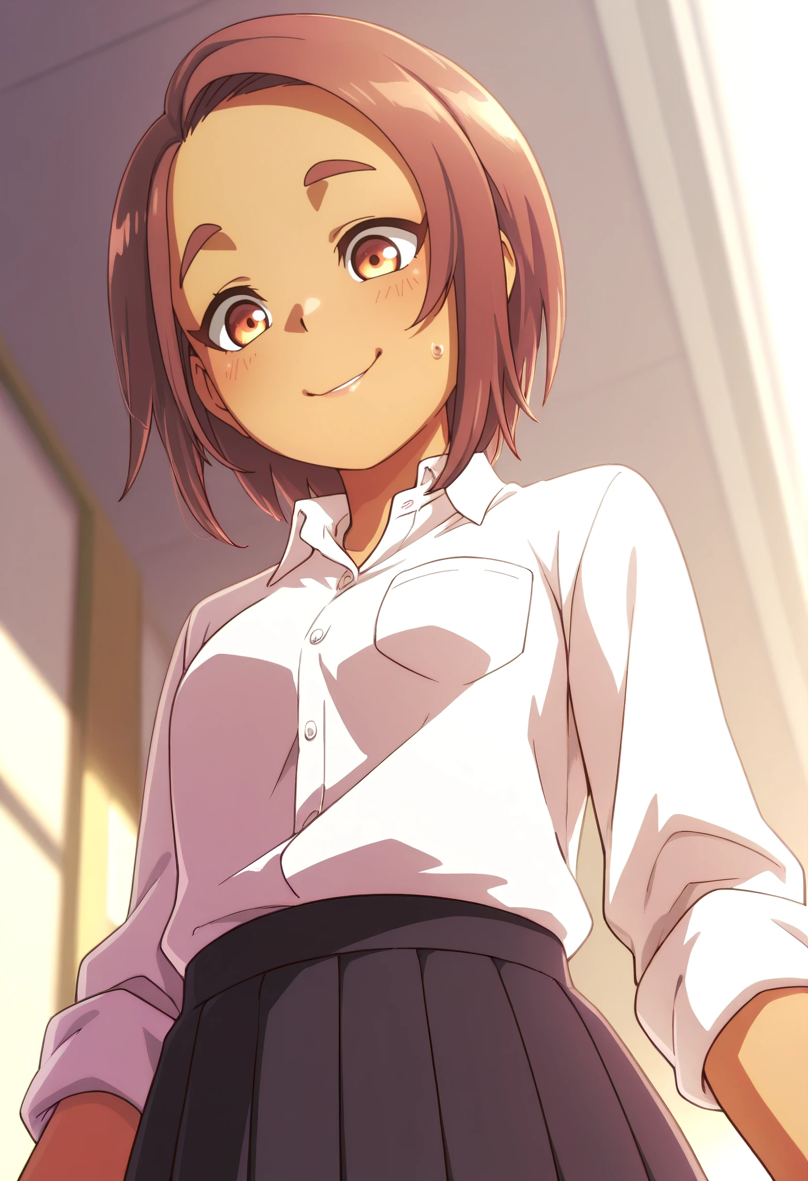 YaeSchool, shirt, white shirt, collared shirt, school uniform, dress shirt, skirt, pleated skirt, black skirt, sleeves rolled up, shirt tucked in, pocket, long sleeves, breast pocket,