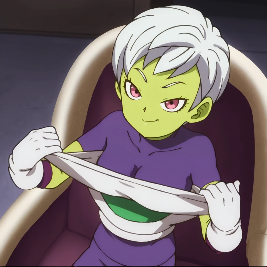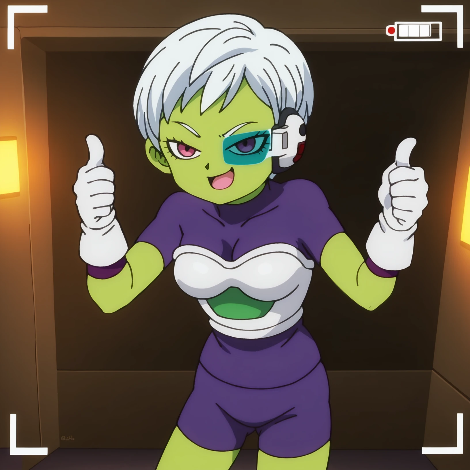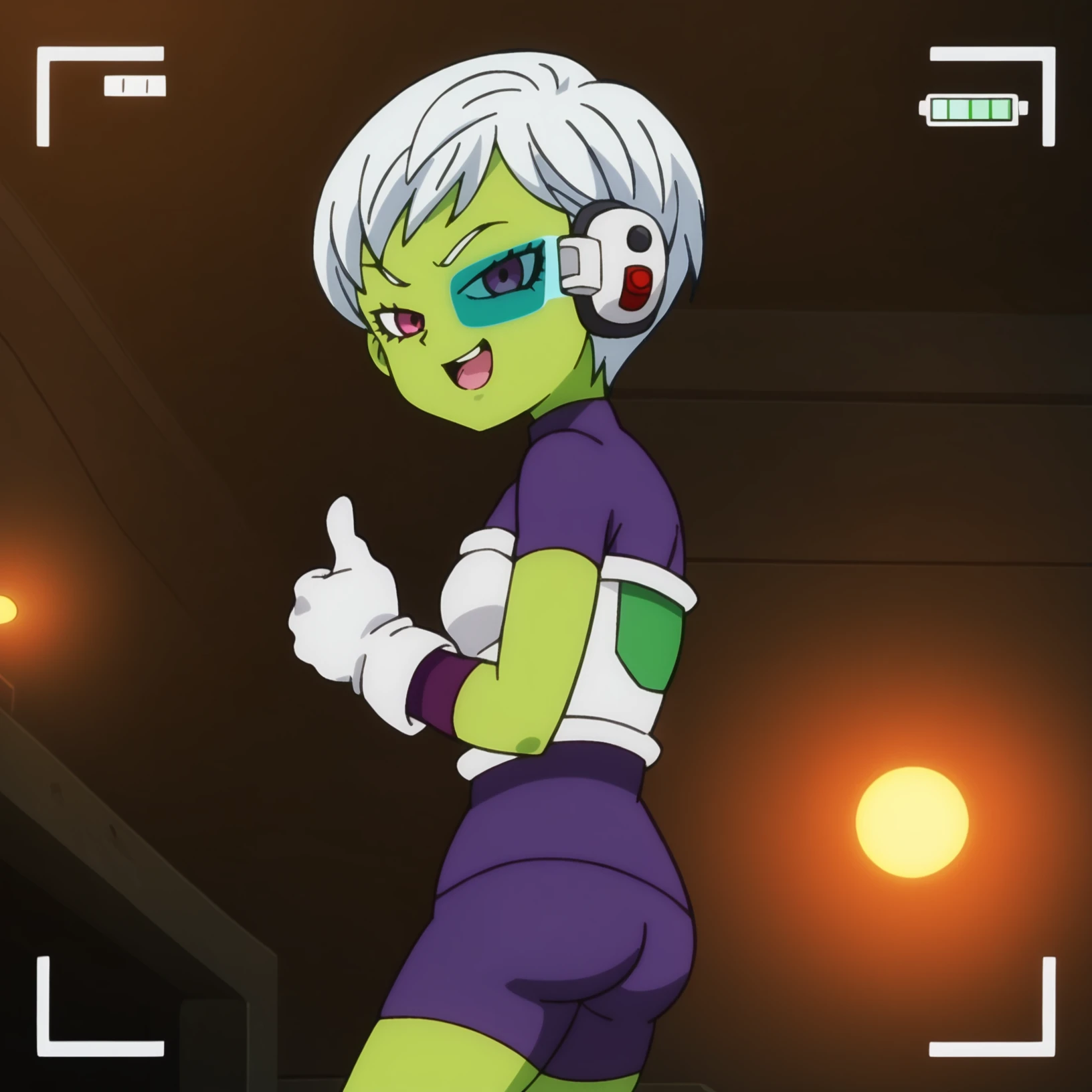 purple bodysuit, white armor, white gloves, purple shorts, tinted eyewear