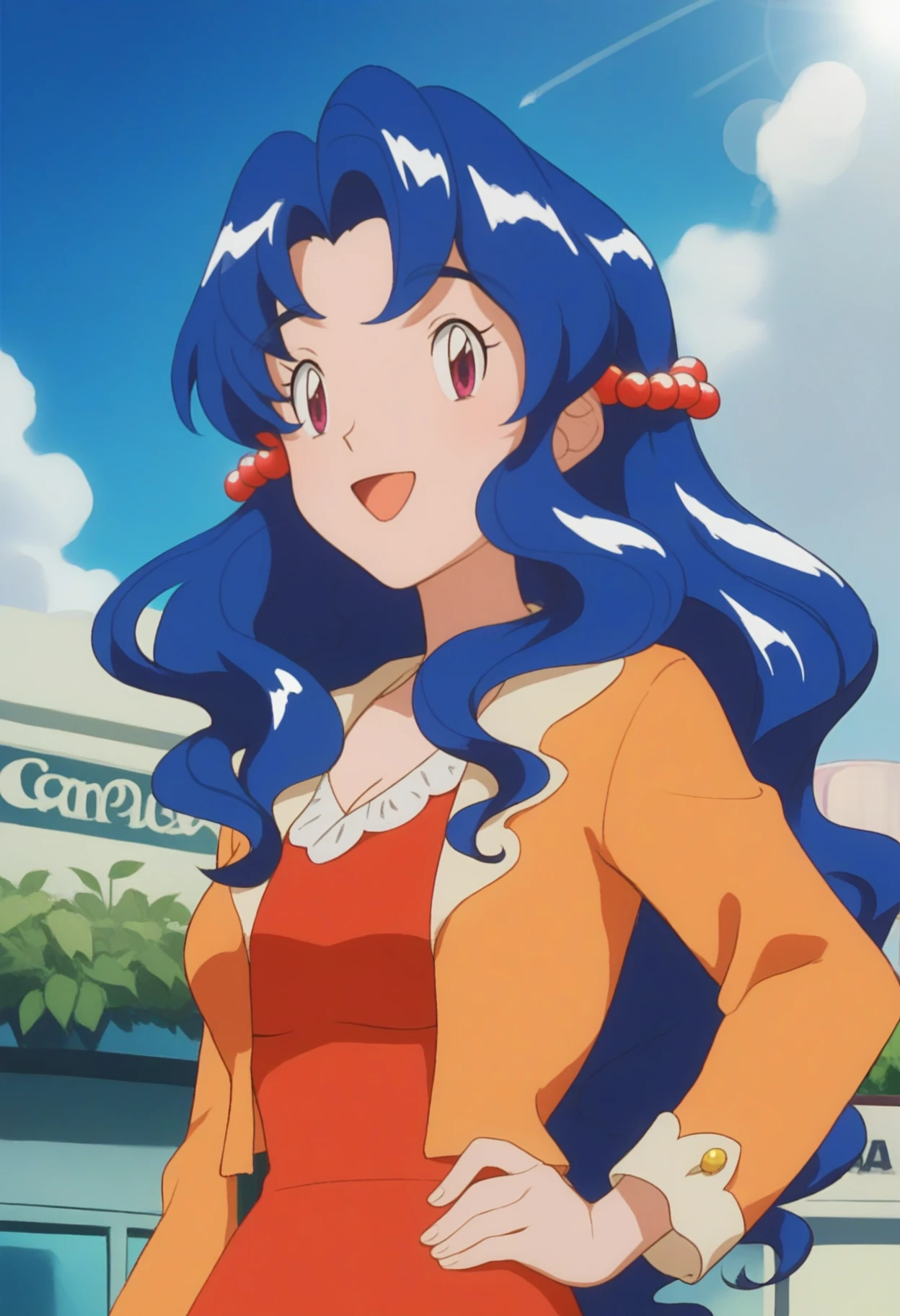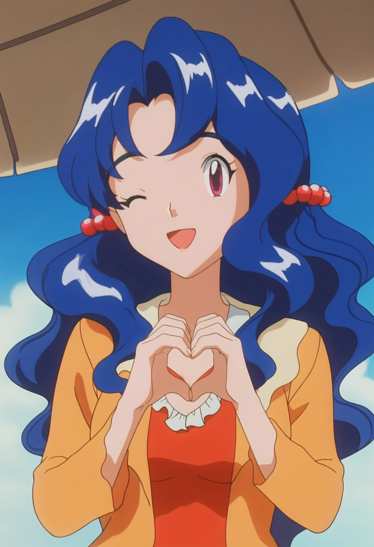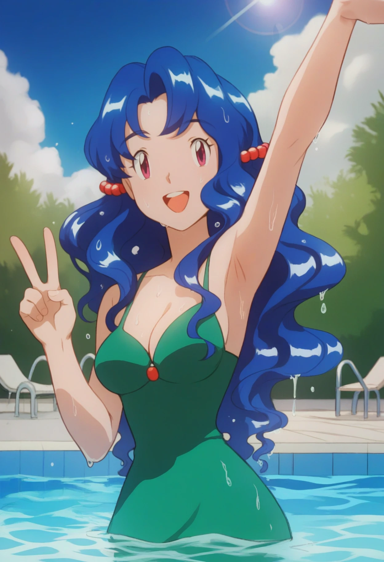 PMViolet, blue hair, long hair, purple eyes, wavy hair, bangs, hair bobbles, medium breasts,