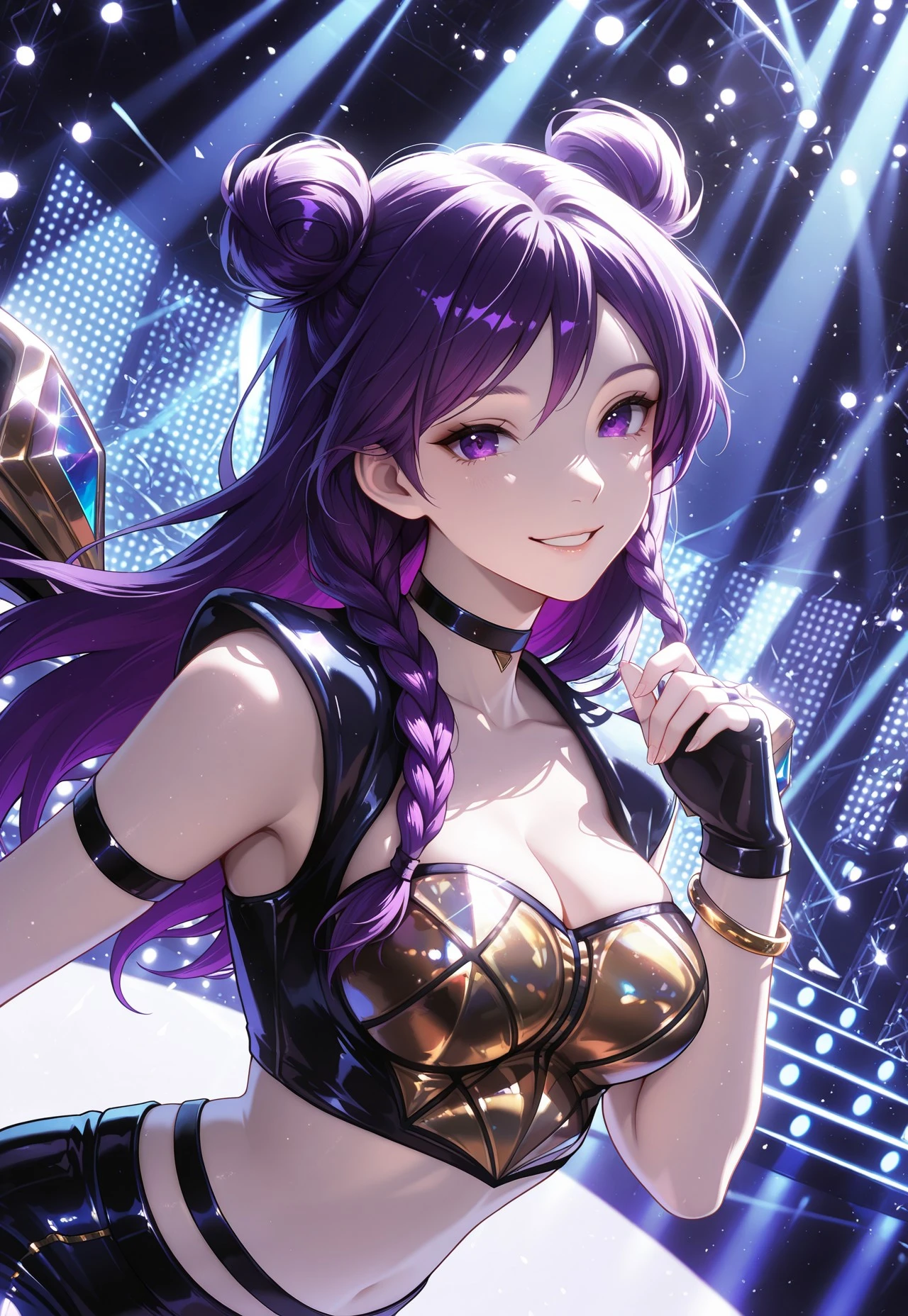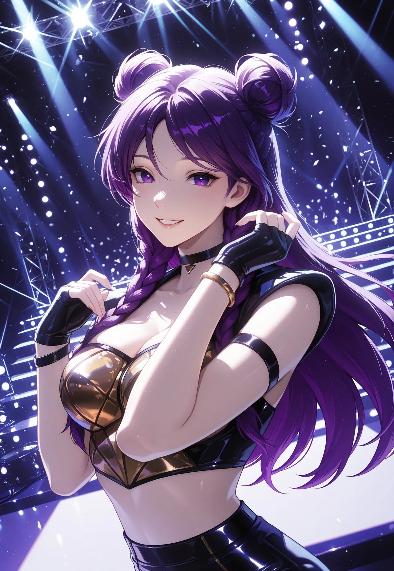 KDAkaisa, long hair, purple hair, twin buns, braided hair, purple eyes, choker, kda outfit, crop top, black pants, fingerless gloves, bracelet, wings,