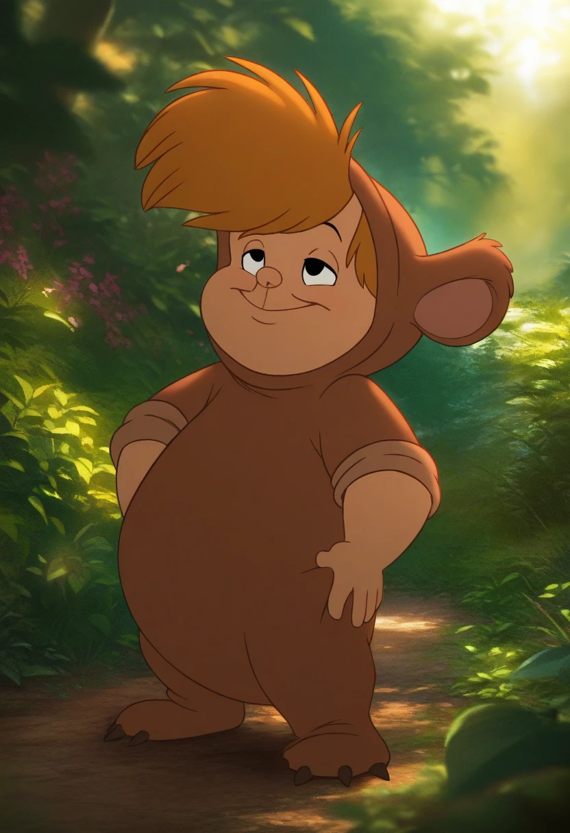 score_8, score_9 ,standing, male focus, <lora:Ted_PeterPan:1>,ppted, male focus, brown animal costume, black eyes,brown bear costume, brown hair, fat, buck teeth,young,forrest, outside, sinny day,