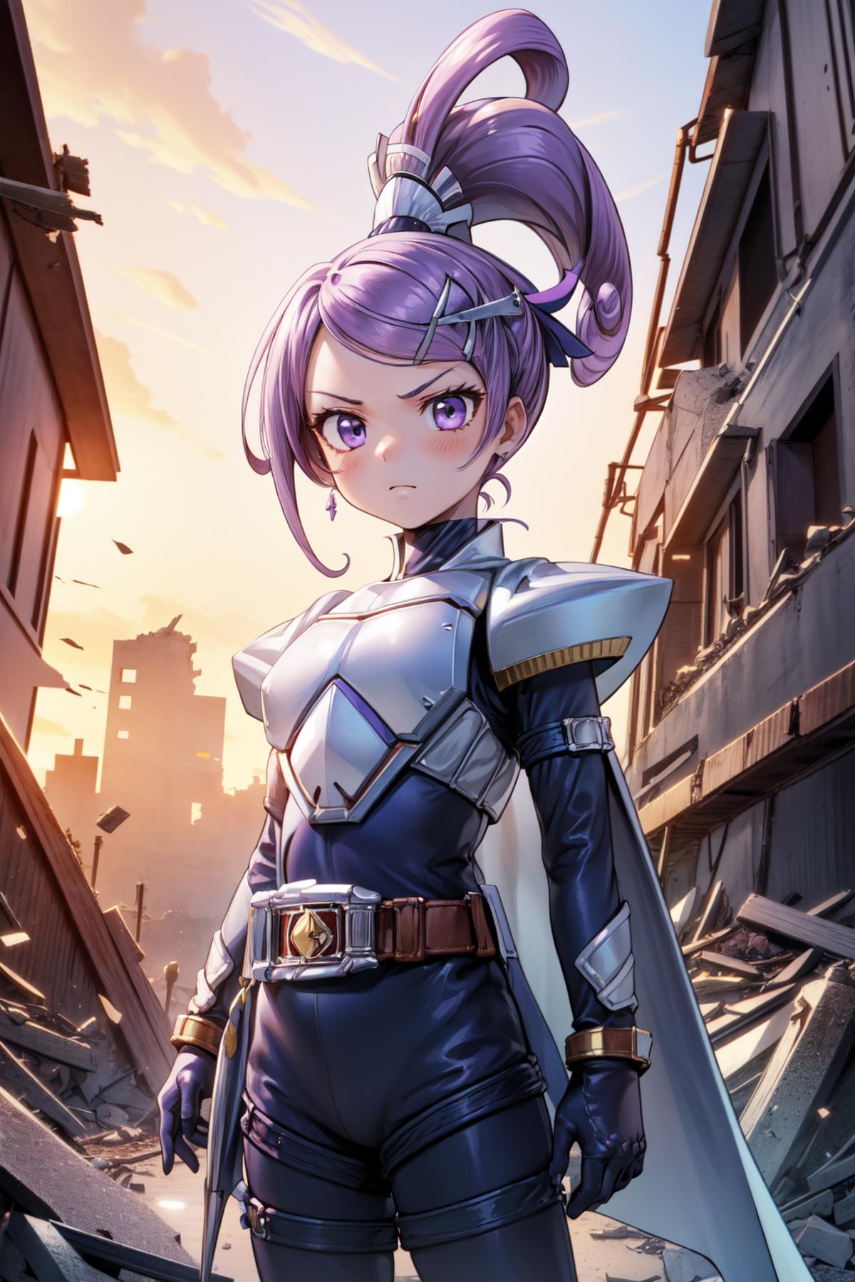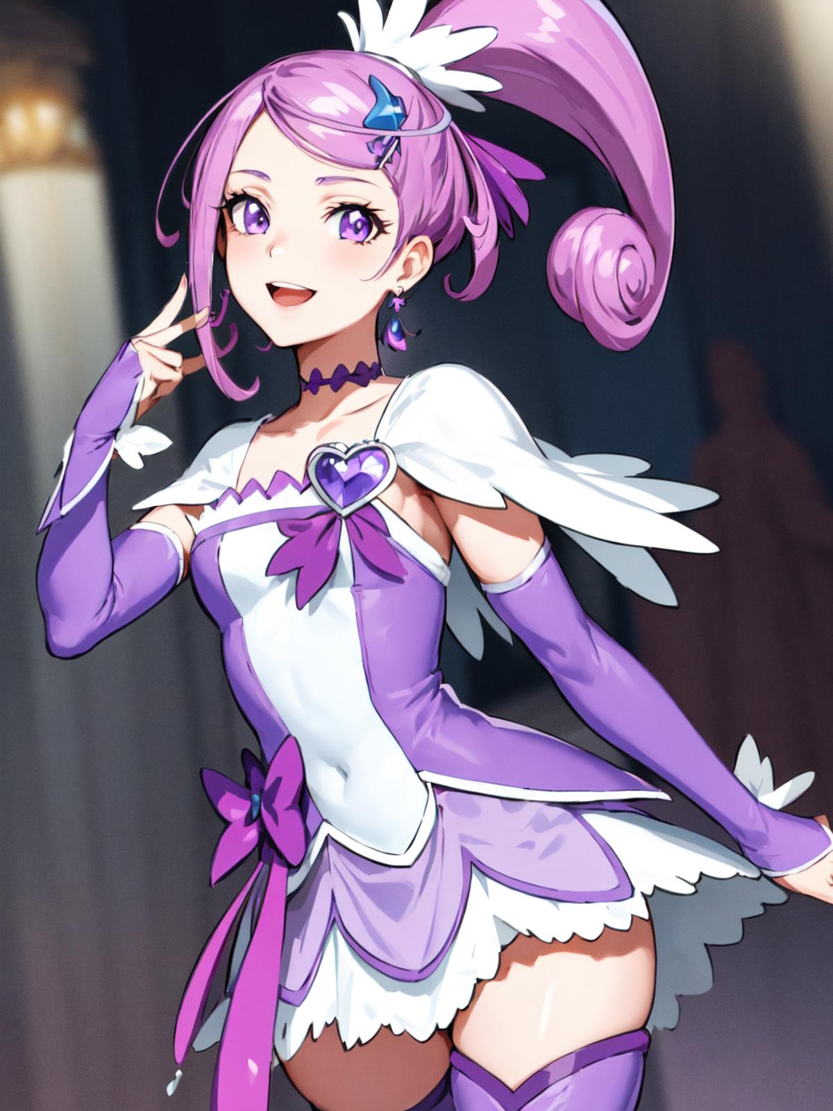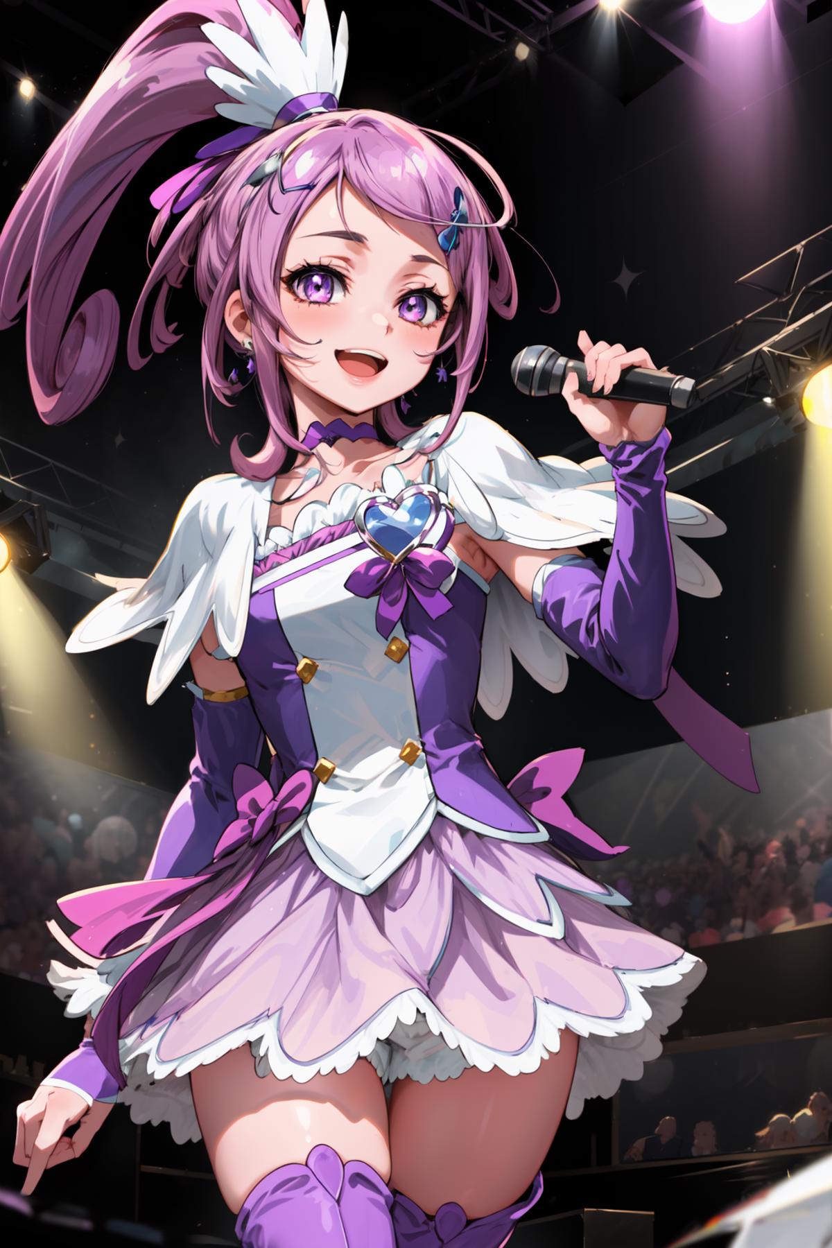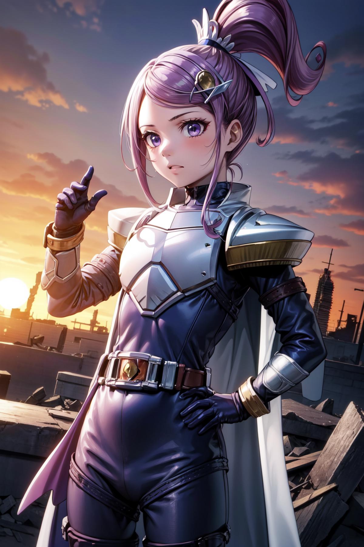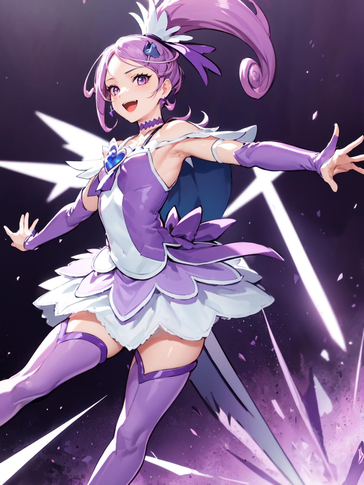 purple dress, spade hair ornament, purple thigh boots, high ponytail, detached sleeves, arm warmers, hairpin, capelet, choker, heart brooch:0.6